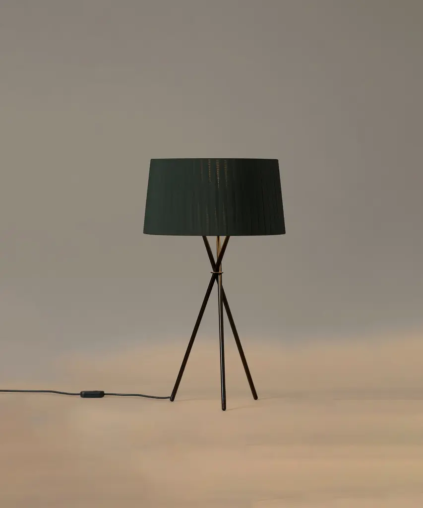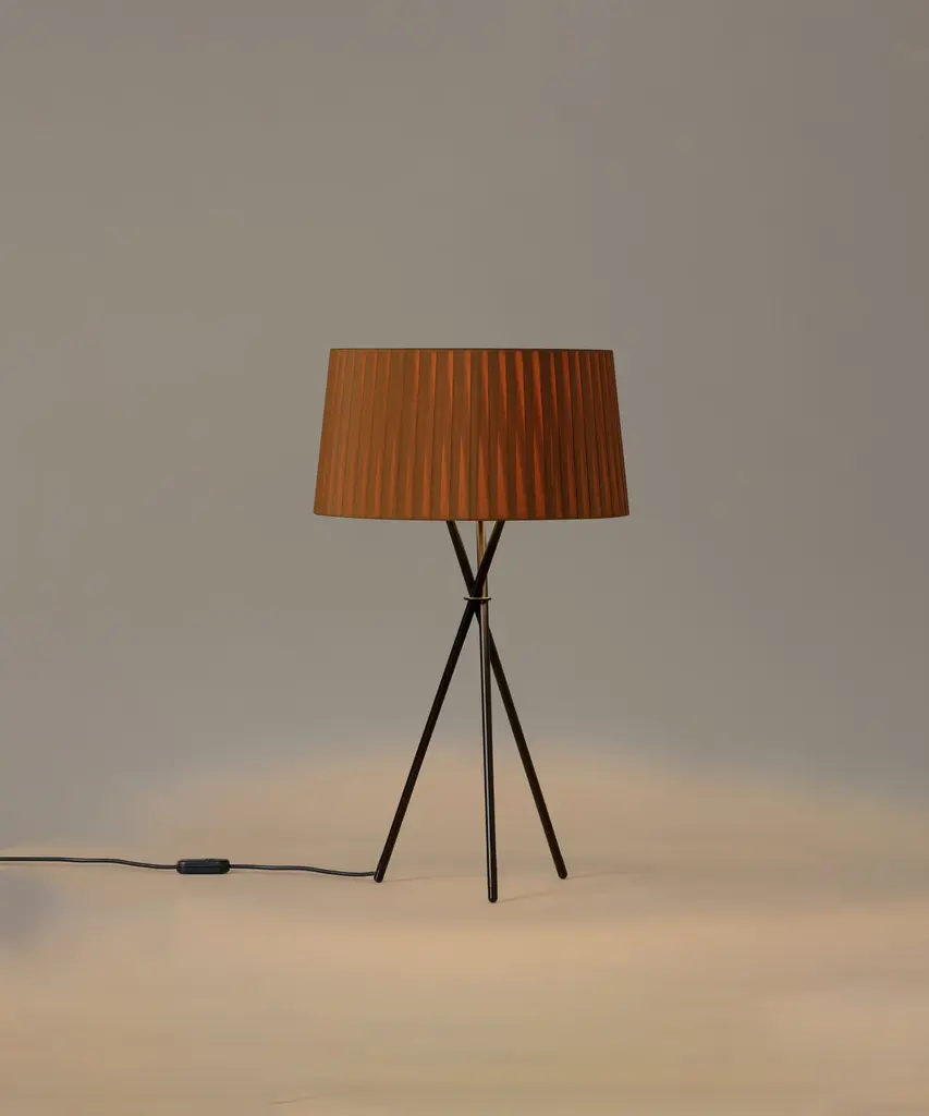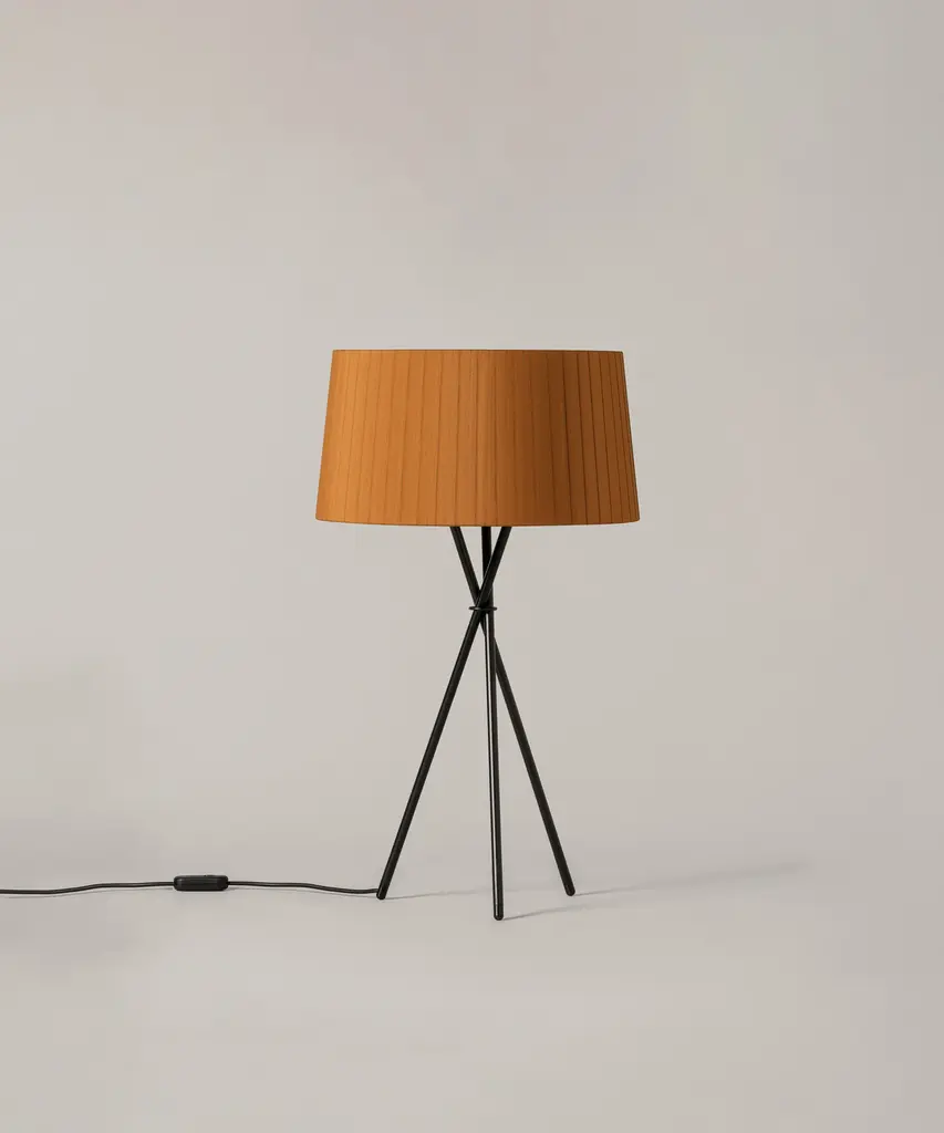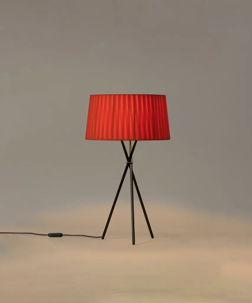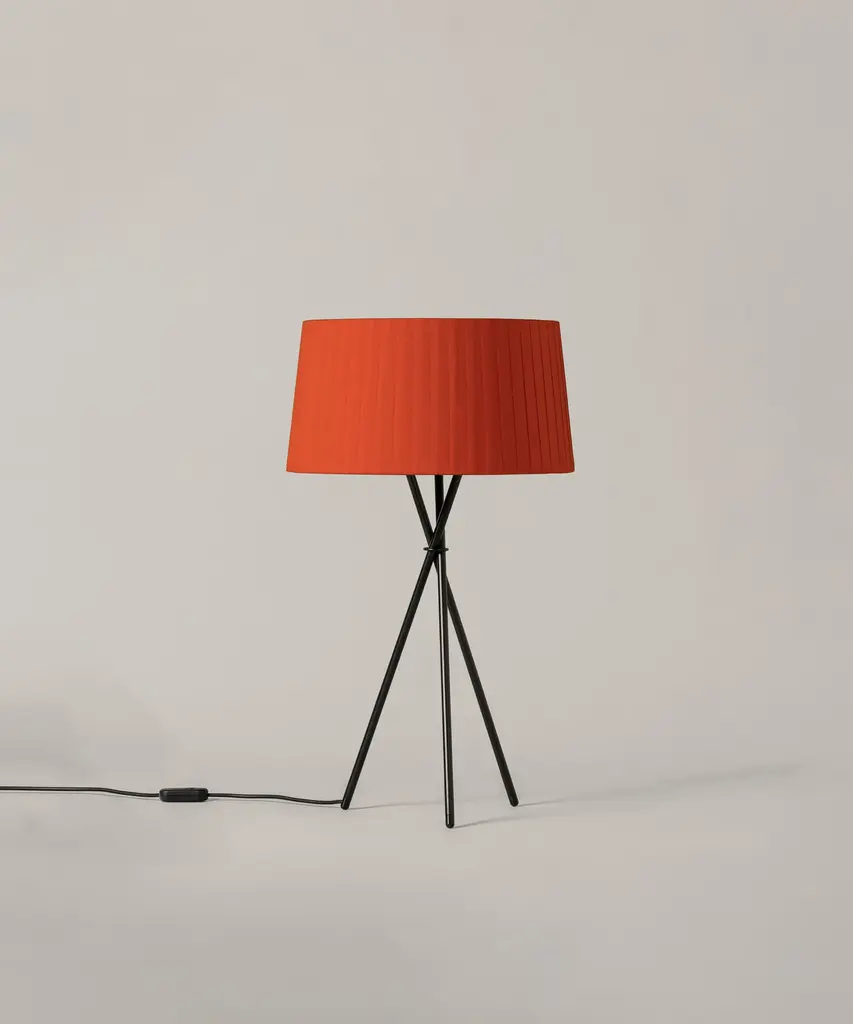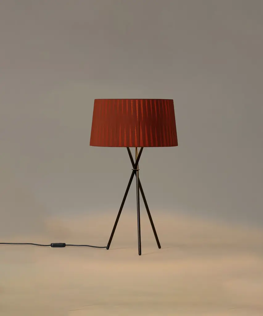 The Trípode lighting series was conceived to lend neutral spaces a warmer touch through the use of color. This series features two sizes of table lamps, a floor lamp, and a pendant lamp version in various sizes. Each shade is handmade using ribbons, each woven from three distinct yarns that created new colors: terracotta, mustard yellow, and forest green. The three basic colors in the ribbon collection - natural white, amber red, and black - complete the range of six colors available. With the light on, the shade provides a warm light, rich in nuances. With the light off, this lamp is a sculptural statement piece that enhances the room. Produced by the Barcelona-based lighting purveyor, Santa & Cole.