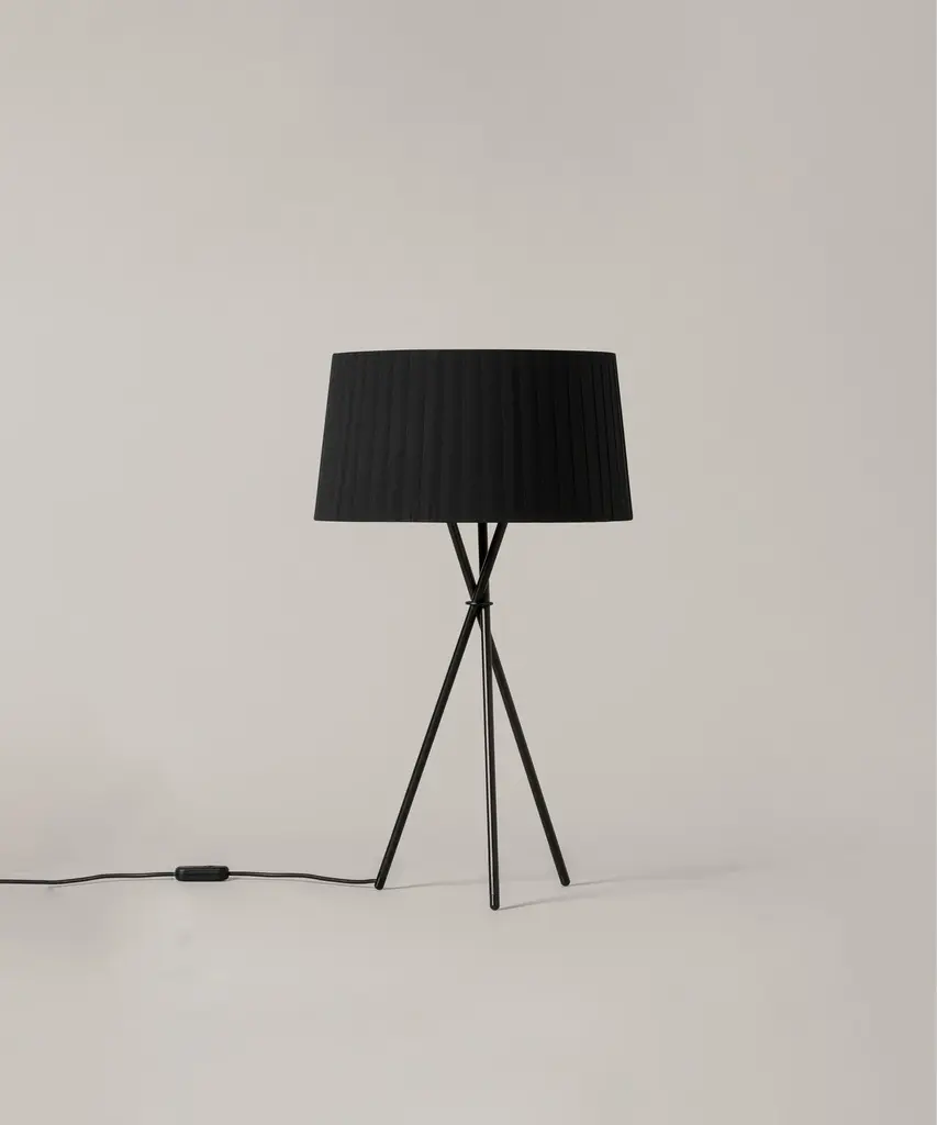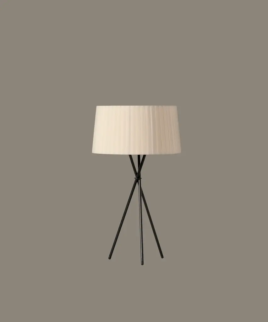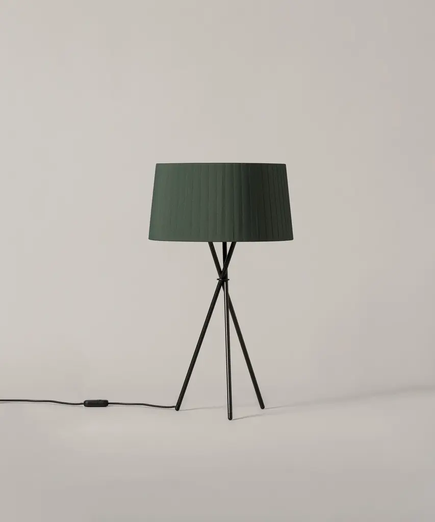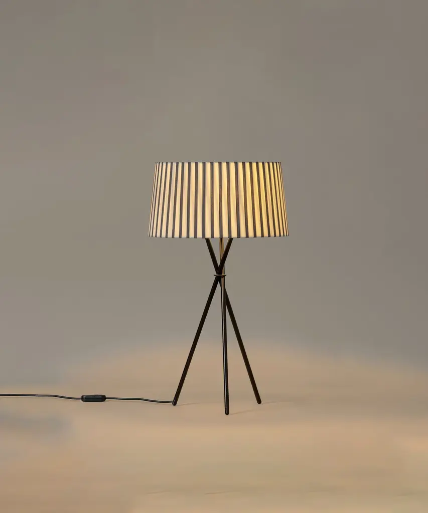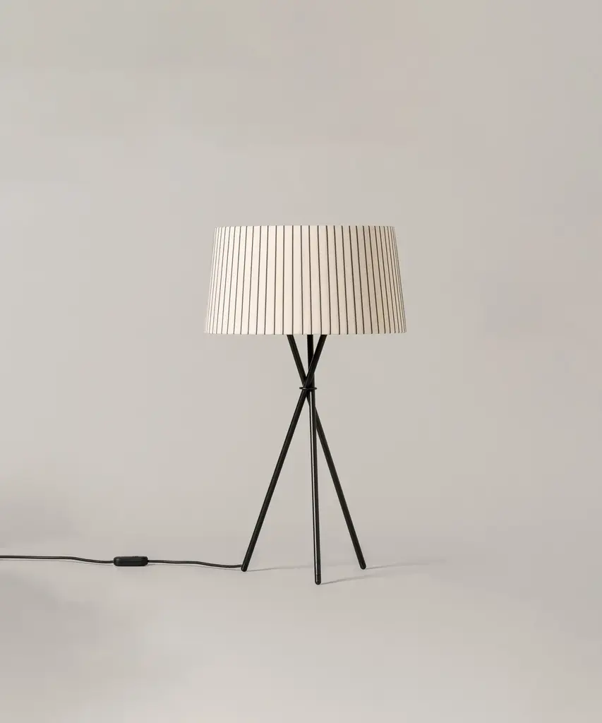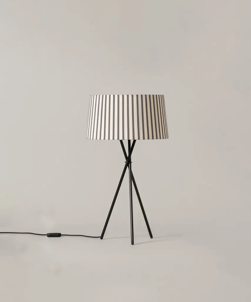 The Trípode lighting series was conceived to lend neutral spaces a warmer touch through the use of color. This series features two sizes of table lamps, a floor lamp, and a pendant lamp version in various sizes. Each shade is handmade using ribbons, each woven from three distinct yarns that created new colors: terracotta, mustard yellow, and forest green. The three basic colors in the ribbon collection - natural white, amber red, and black - complete the range of six colors available. With the light on, the shade provides a warm light, rich in nuances. With the light off, this lamp is a sculptural statement piece that enhances the room. Produced by the Barcelona-based lighting purveyor, Santa & Cole.