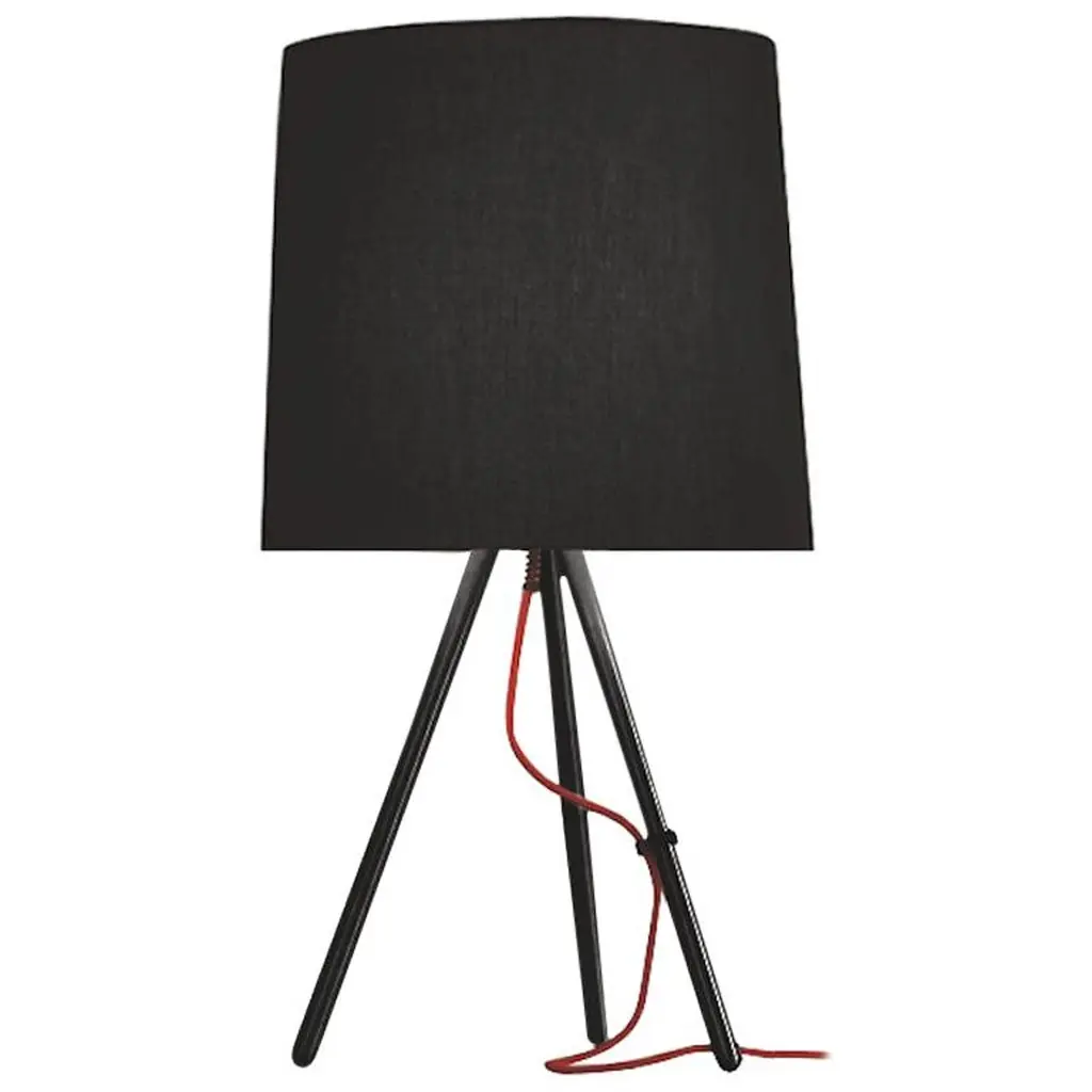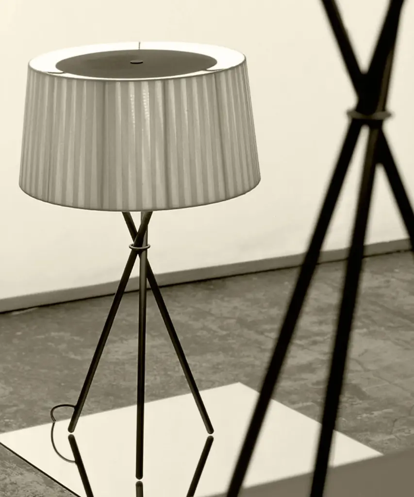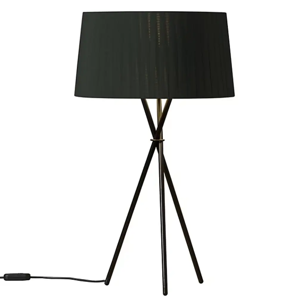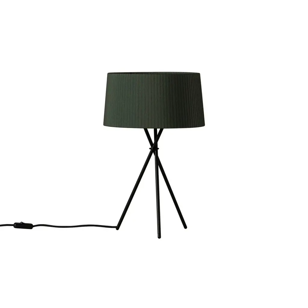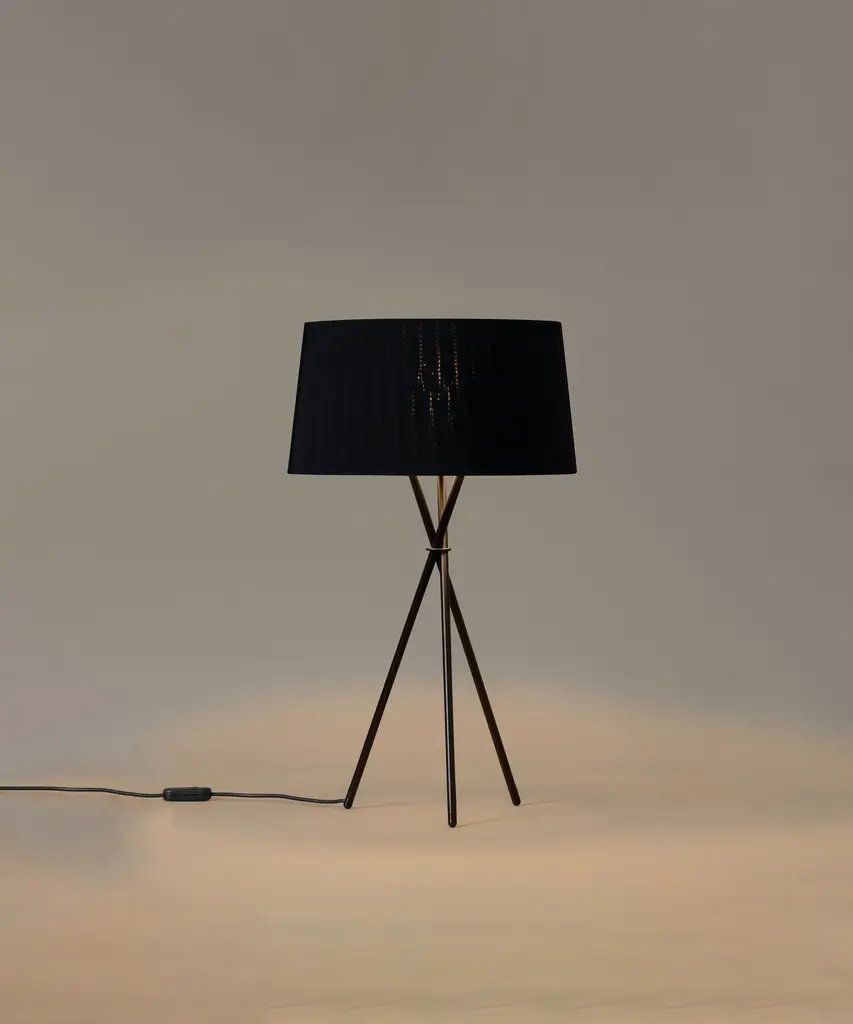 The Trípode lighting series was conceived to lend neutral spaces a warmer touch through the use of color. This series features two sizes of table lamps, a floor lamp, and a pendant lamp version in various sizes. Each shade is handmade using ribbons, each woven from three distinct yarns that created new colors: terracotta, mustard yellow, and forest green. The three basic colors in the ribbon collection - natural white, amber red, and black - complete the range of six colors available. With the light on, the shade provides a warm light, rich in nuances. With the light off, this lamp is a sculptural statement piece that enhances the room. Produced by the Barcelona-based lighting purveyor, Santa & Cole.