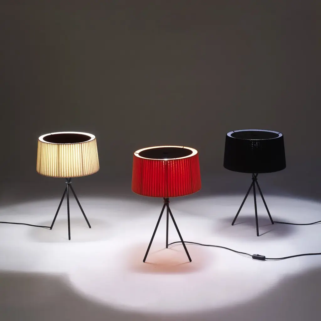 Santa & Cole scales down its sleek Trípode in an arresting table lamp version with the characteristic black metal 3-legged base and hand-fashioned ribbon shade. Available in 2 sizes, it emits a fully nuanced, warm illumination when turned on and serves as a sculptural statement piece when turned off. Each shade is handmade in neutral natural or black or a range of distinctive colors including terracotta, mustard yellow and forest green in a collaboration with Dutch studio Raw Color.