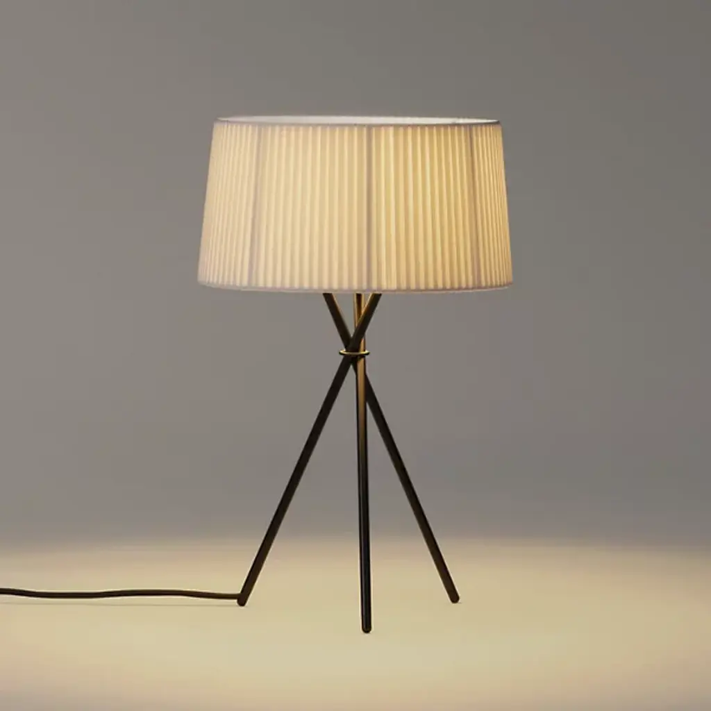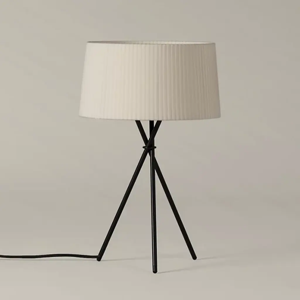 The Santa & Cole Tripod M3 Table Lamp props a pleated ribbon shade on a black tripod base, adding some height to the soft accent light produced. The slightly sheer quality of the ribbon allows a generous amount of light to shine through, which can be customized based on the color shade chosen. To reduce uncomfortable glare when standing above the lamp, a black metal disc shields the open top of the shade.
