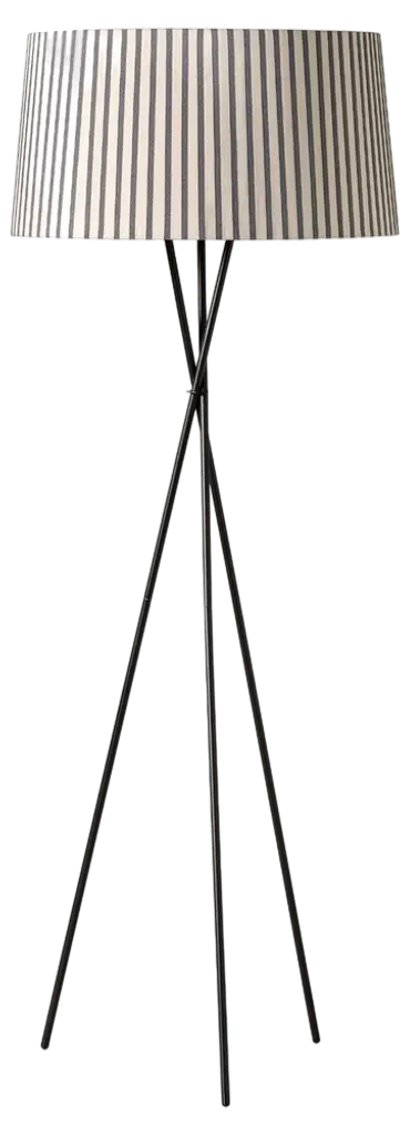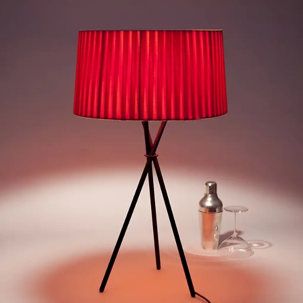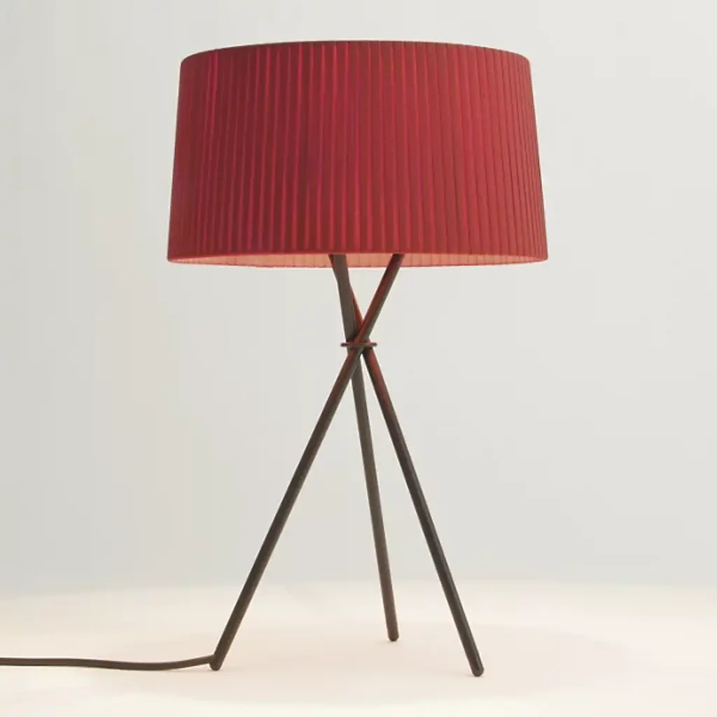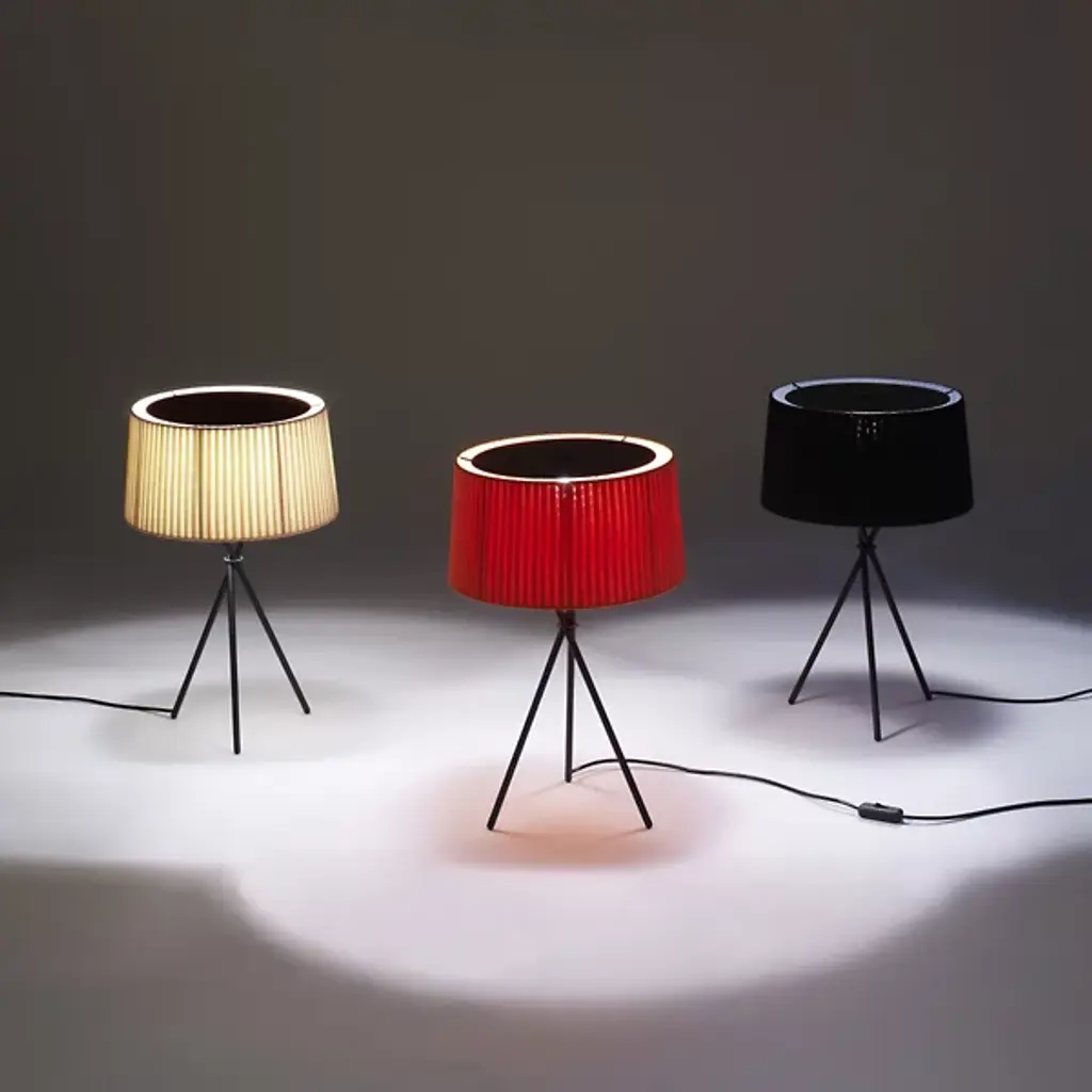 The Santa & Cole Tripod M3 Table Lamp props a pleated ribbon shade on a black tripod base, adding some height to the soft accent light produced. The slightly sheer quality of the ribbon allows a generous amount of light to shine through, which can be customized based on the color shade chosen. To reduce uncomfortable glare when standing above the lamp, a black metal disc shields the open top of the shade.