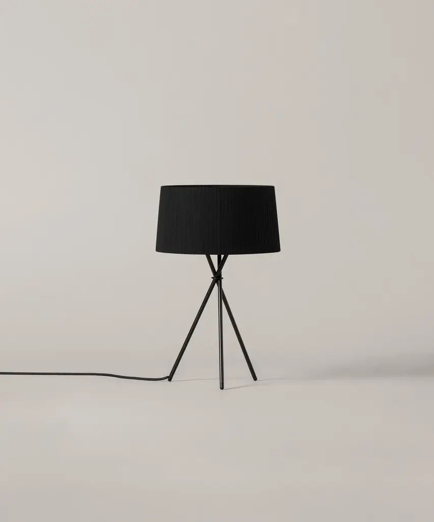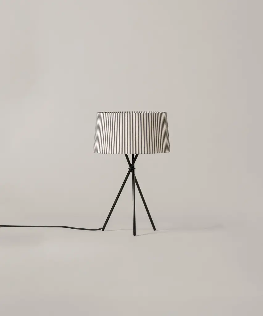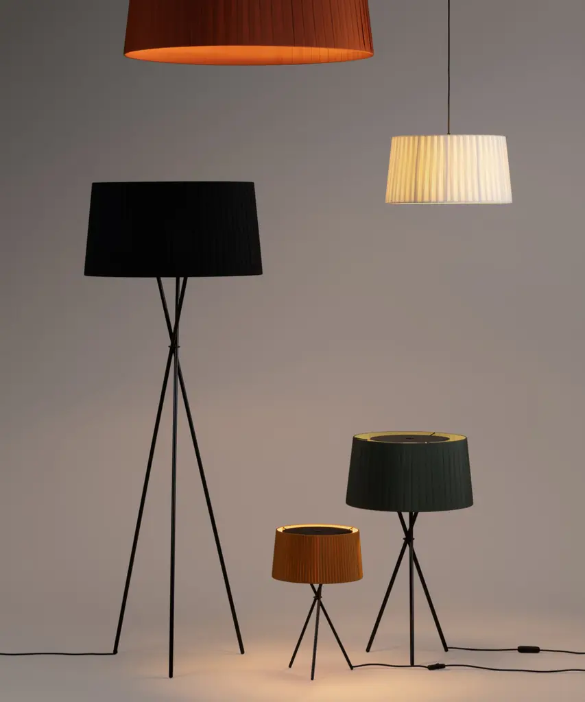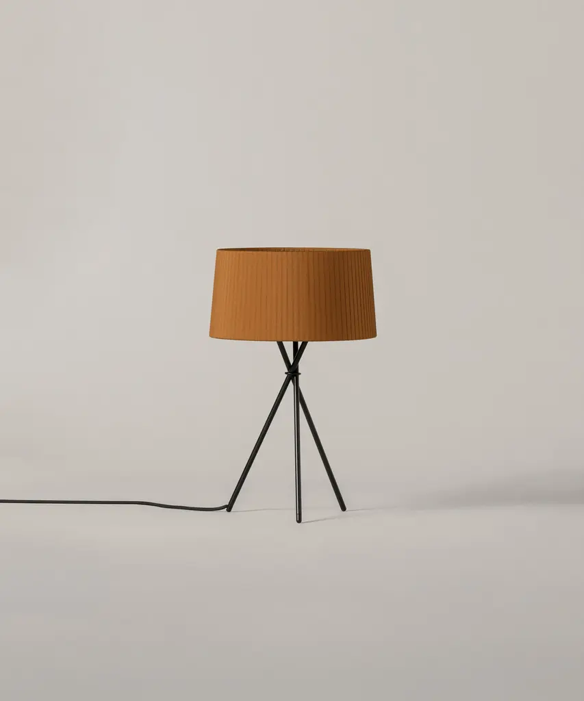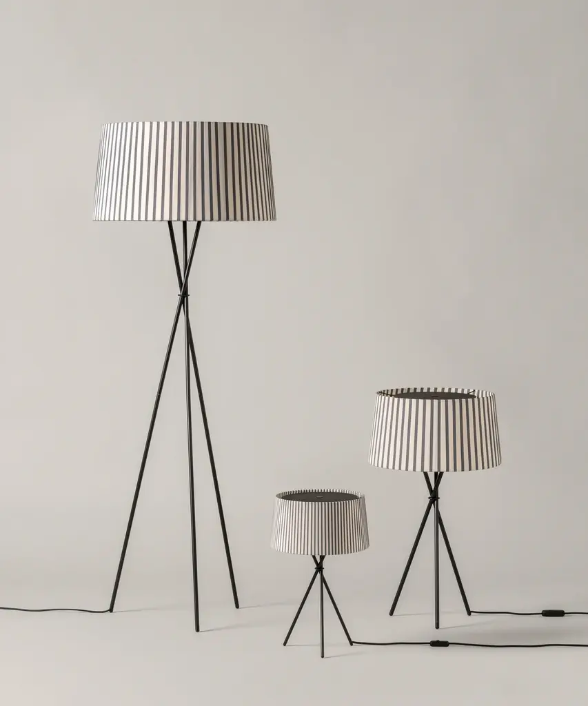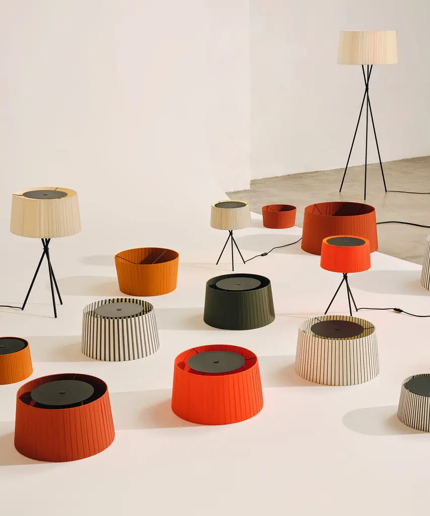 The Trípode lighting series was conceived to lend neutral spaces a warmer touch through the use of color. This series features two sizes of table lamps, a floor lamp, and a pendant lamp version in various sizes. Each shade is handmade using ribbons, each woven from three distinct yarns that created new colors: terracotta, mustard yellow, and forest green. The three basic colors in the ribbon collection - natural white, amber red, and black - complete the range of six colors available. With the light on, the shade provides a warm light, rich in nuances. With the light off, this lamp is a sculptural statement piece that enhances the room. Produced by the Barcelona-based lighting purveyor, Santa & Cole.