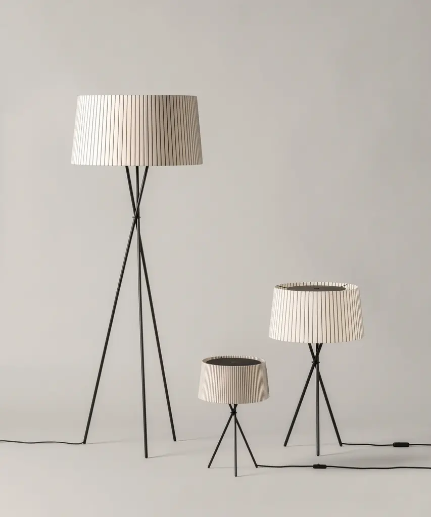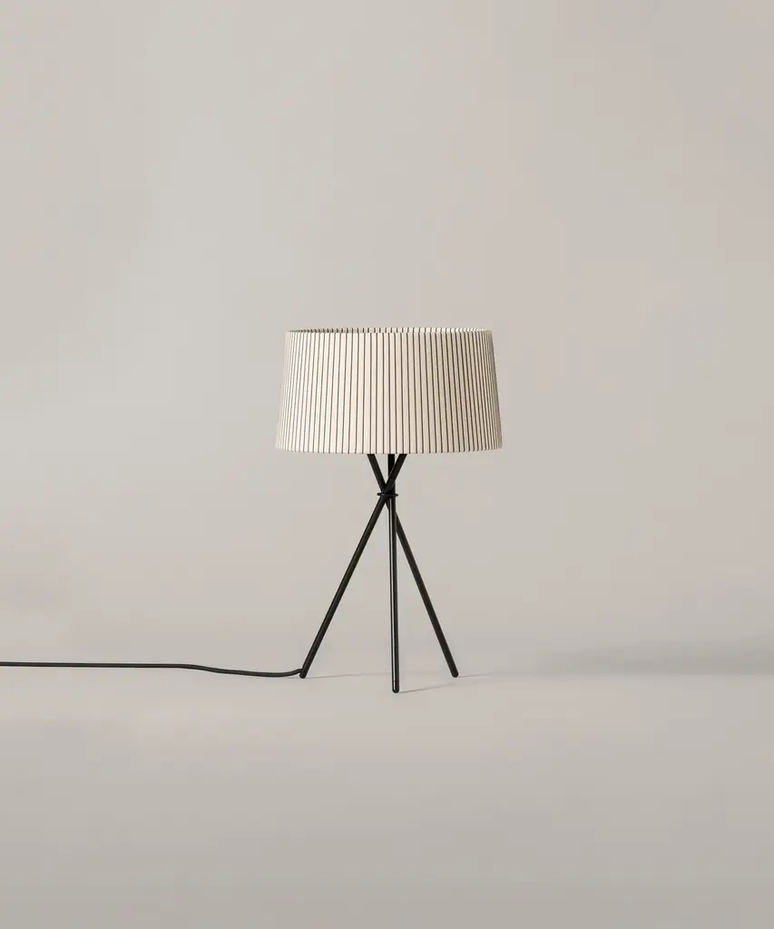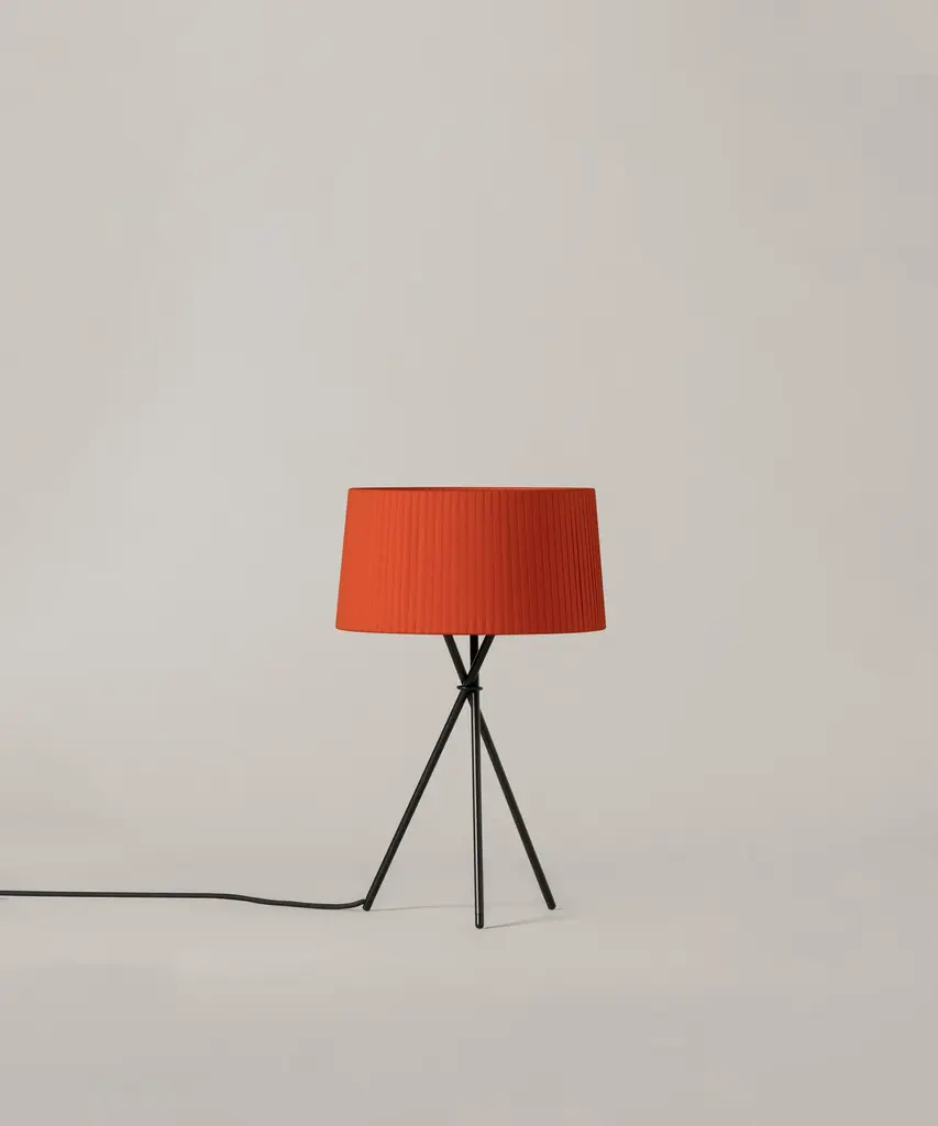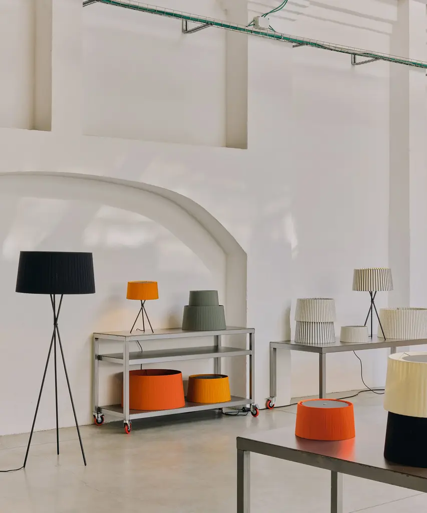 The Trípode lighting series was conceived to lend neutral spaces a warmer touch through the use of color. This series features two sizes of table lamps, a floor lamp, and a pendant lamp version in various sizes. Each shade is handmade using ribbons, each woven from three distinct yarns that created new colors: terracotta, mustard yellow, and forest green. The three basic colors in the ribbon collection - natural white, amber red, and black - complete the range of six colors available. With the light on, the shade provides a warm light, rich in nuances. With the light off, this lamp is a sculptural statement piece that enhances the room. Produced by the Barcelona-based lighting purveyor, Santa & Cole.