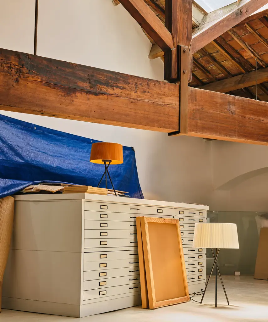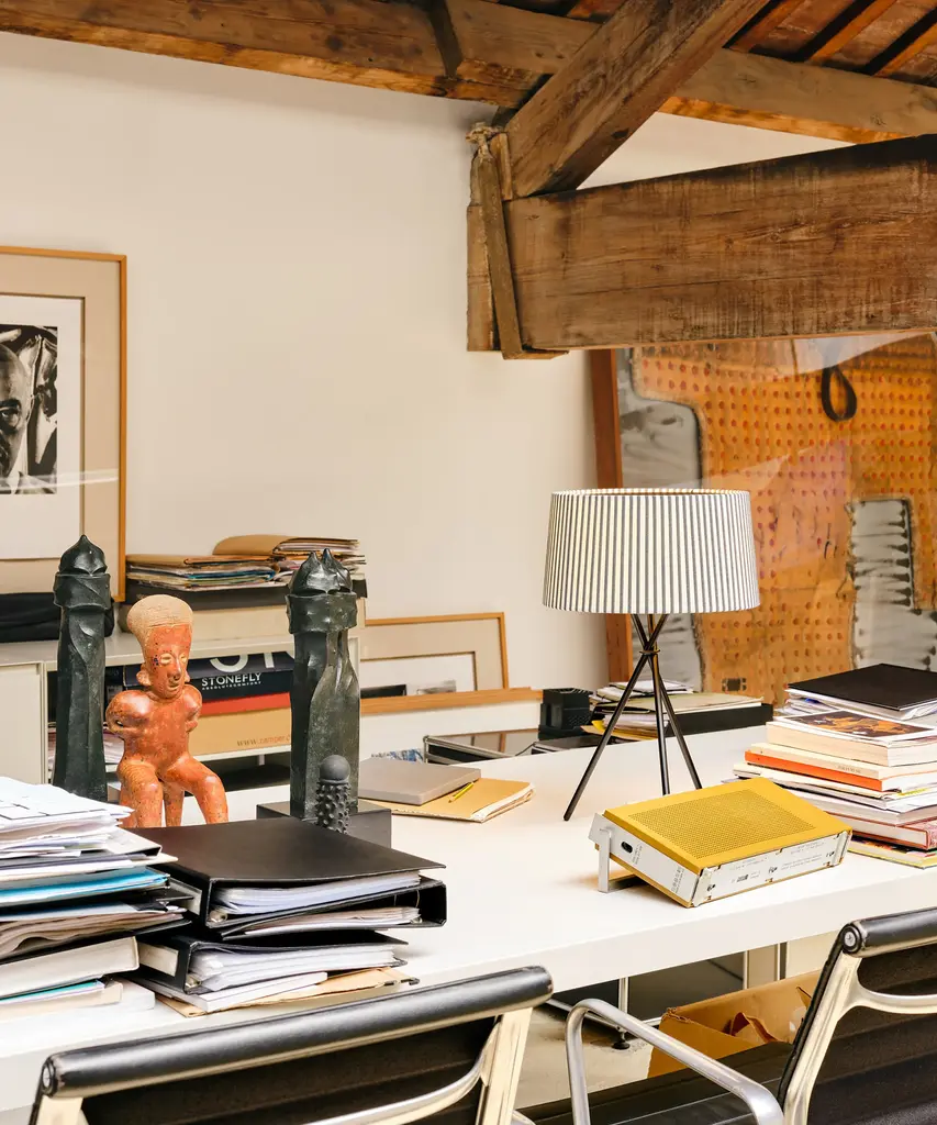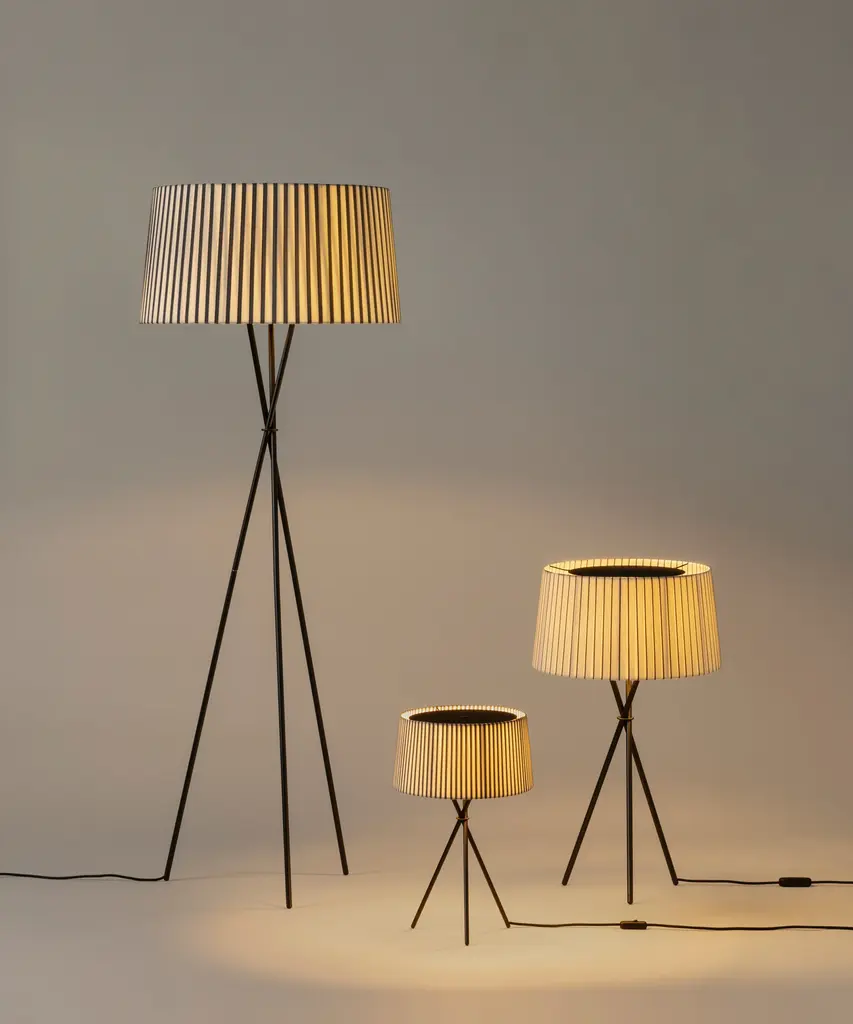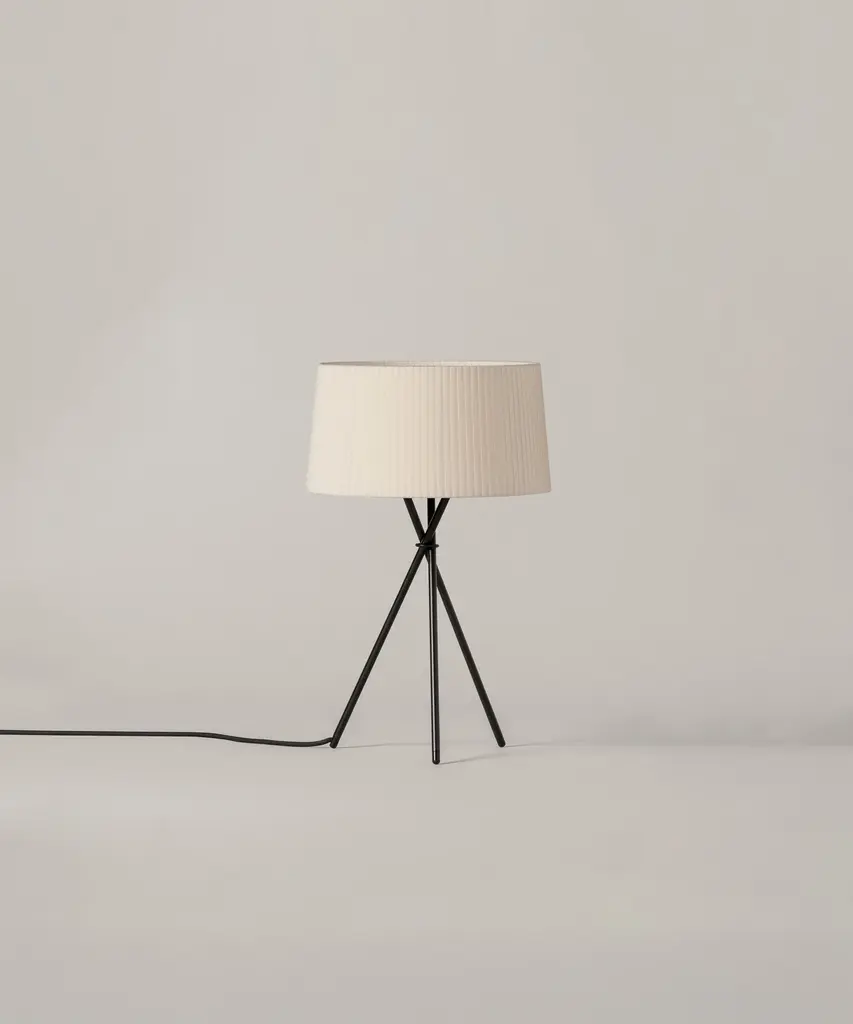 The Trípode lighting series was conceived to lend neutral spaces a warmer touch through the use of color. This series features two sizes of table lamps, a floor lamp, and a pendant lamp version in various sizes. Each shade is handmade using ribbons, each woven from three distinct yarns that created new colors: terracotta, mustard yellow, and forest green. The three basic colors in the ribbon collection - natural white, amber red, and black - complete the range of six colors available. With the light on, the shade provides a warm light, rich in nuances. With the light off, this lamp is a sculptural statement piece that enhances the room. Produced by the Barcelona-based lighting purveyor, Santa & Cole.