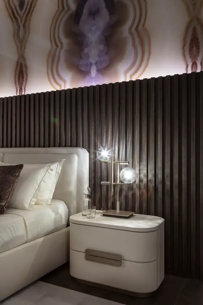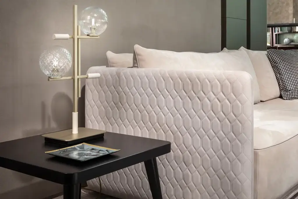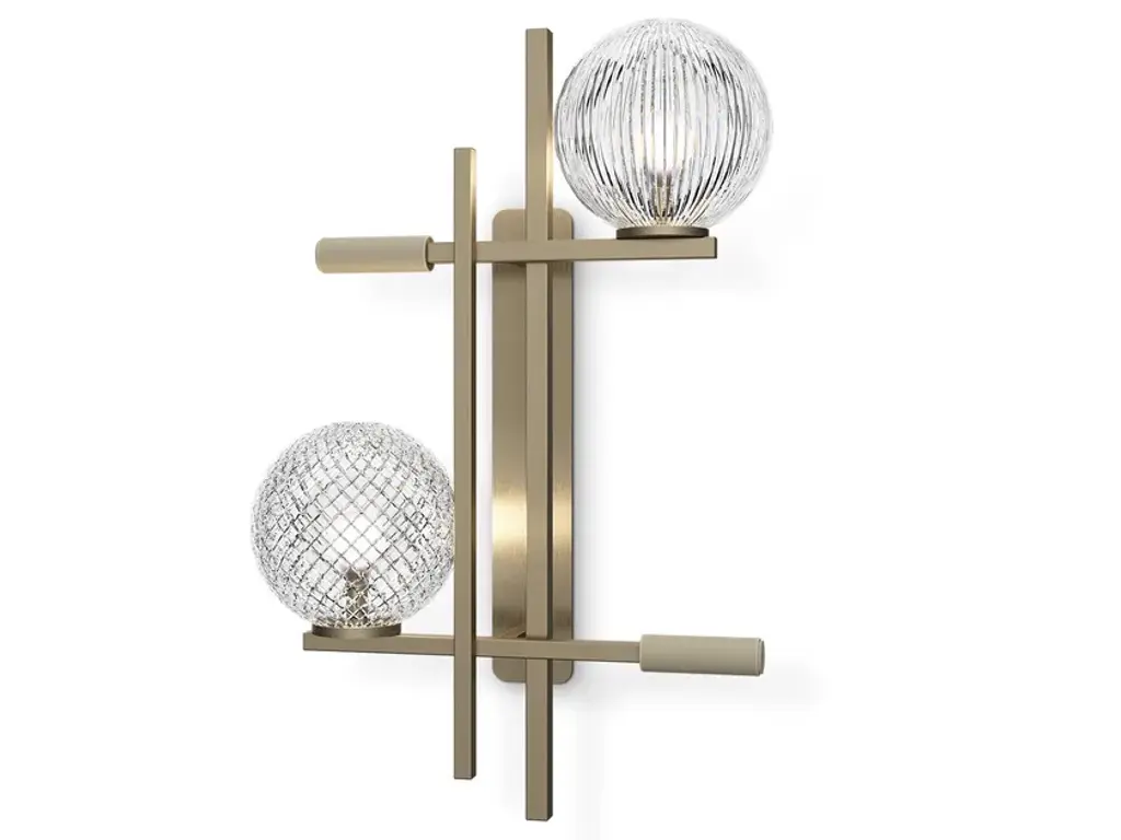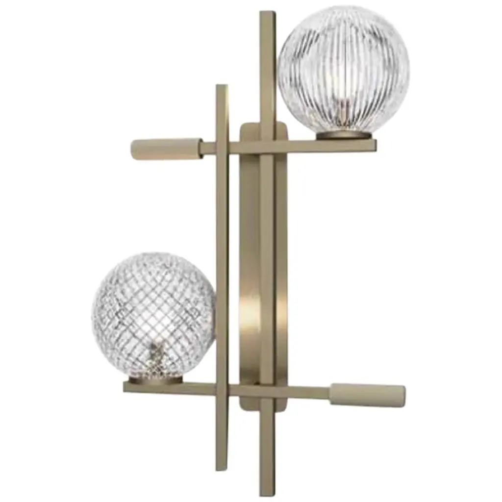 Tris is a metal table lamp in champagne finish. Murano glass spheres and decorative leather cylinders. A veritable game of shapes, lights and materials in an ironic and elegant geometric balance that makes this table lamp funny and particularly versatile at the same time.
