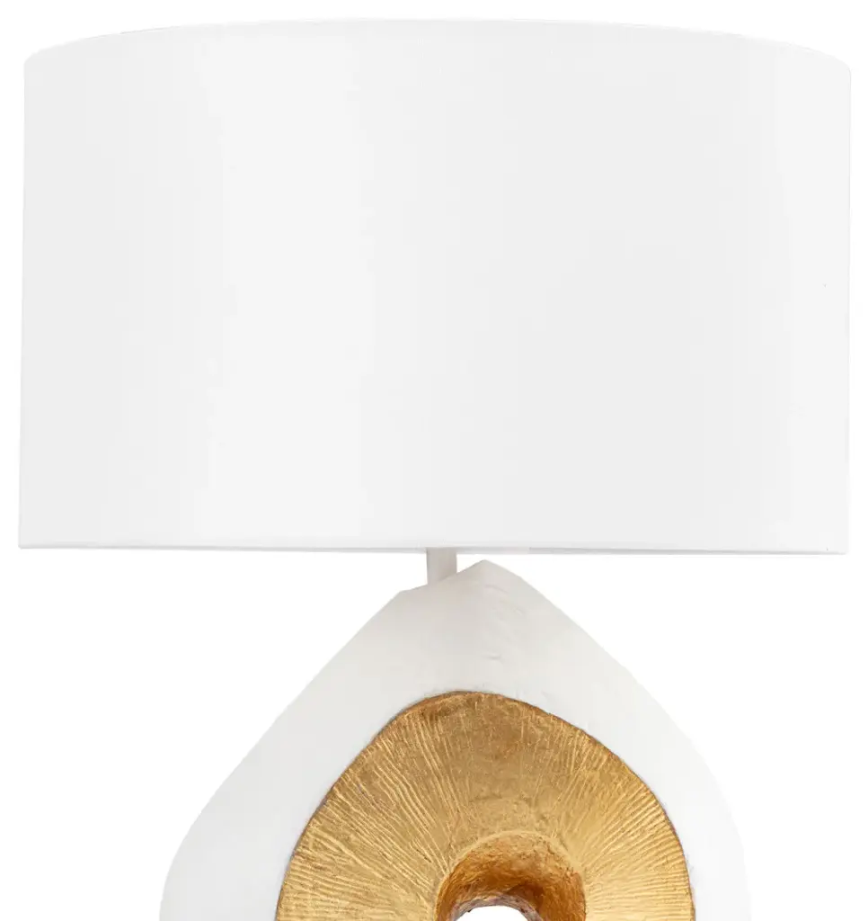 The Tristan Table Lamp is sculpturally-inspired with a smooth, matte white base that is contrasted by an organically textured gold-leaf center. This conversation piece would look exquisite on bedside tables in pairs, or on a console in your entry way or dining room.Wattage: 3-Way 150 Watt maxBulbs: 1 (not included)CSA/UL listed