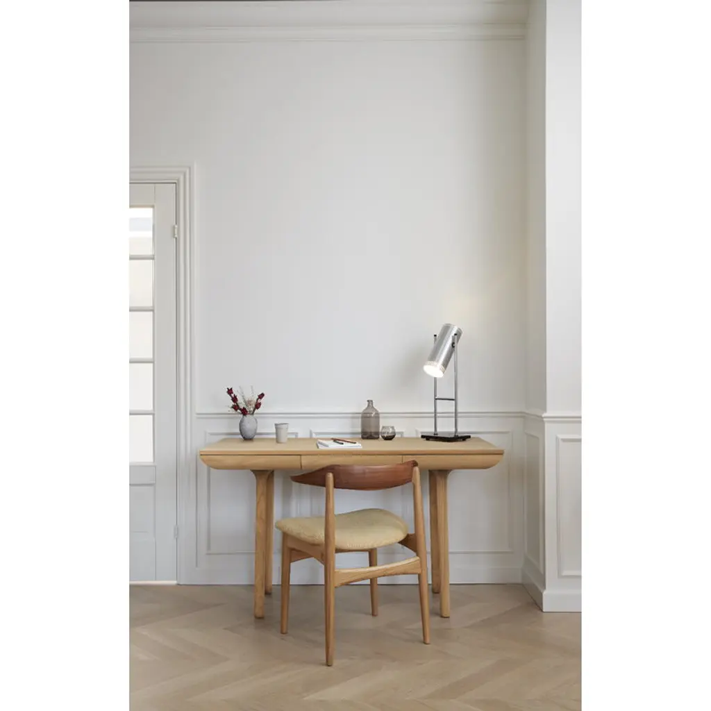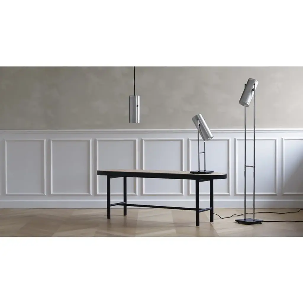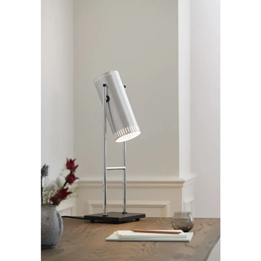 Warm Nordic’s Trombone table lamp features a narrow, cylindrical metal shade with a white inner surface that reflects light from both ends of the shade. The edges are perforated with thin vertical slits, allowing light to shine through a beautiful way. The Trombone table lamp stands on steel legs attached to a square-shaped base, and its shade can be tilted up and down. A combination of geometric expression and metallic surfaces, the Trombone collection is a masterpiece created by Danish lighting designer Jo Hammerborg in 1966. The collection’s graceful and simple esthetics still look modern and fresh, and the Trombone luminaires will easily find their place in any contemporary interior.