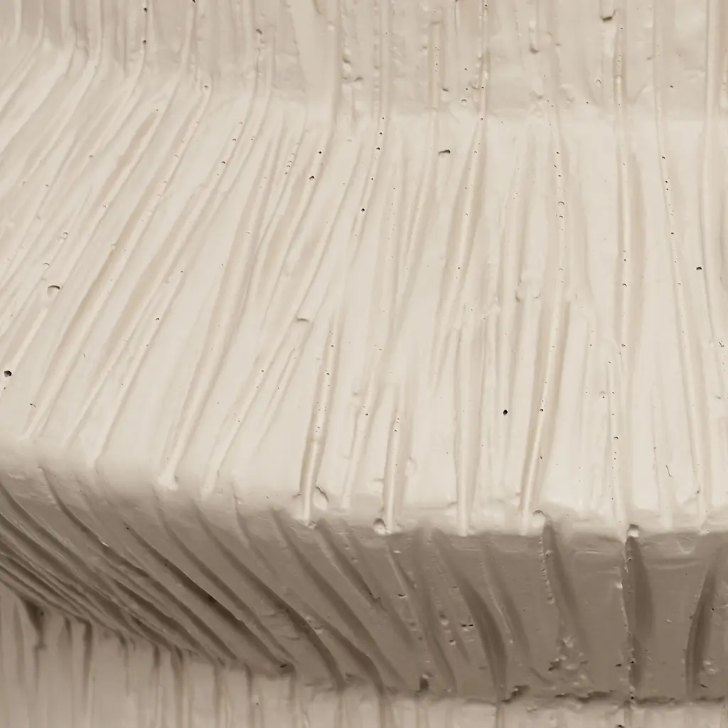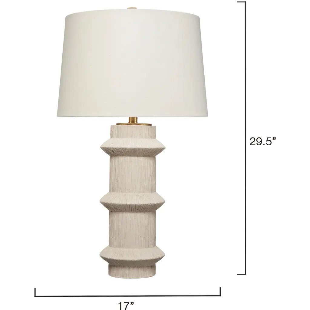 Architecturally inspired and modern in any era, this unique lamp is handcrafted with quality polyresin. Its geometric lines are enhanced by a textured cream finish and warm antique brass hardware, and it is topped with a drum shade in white linen. Place a pair on either side of a long, low console or individually next to an armchair.