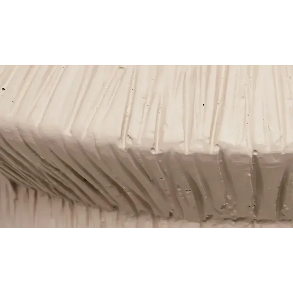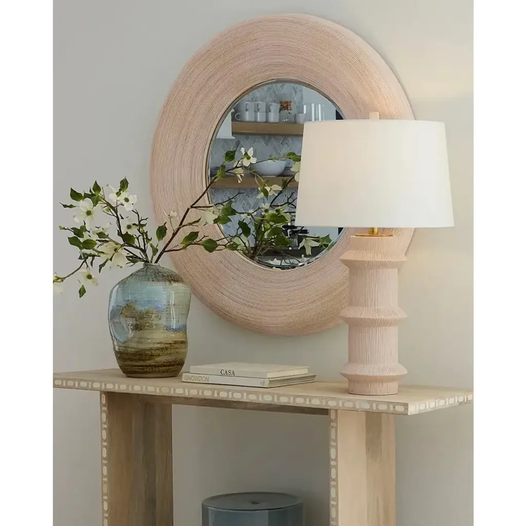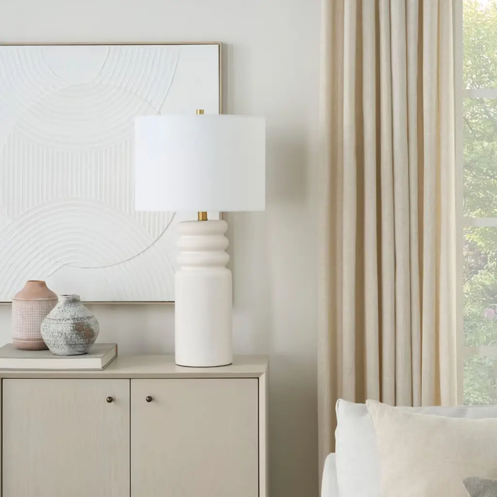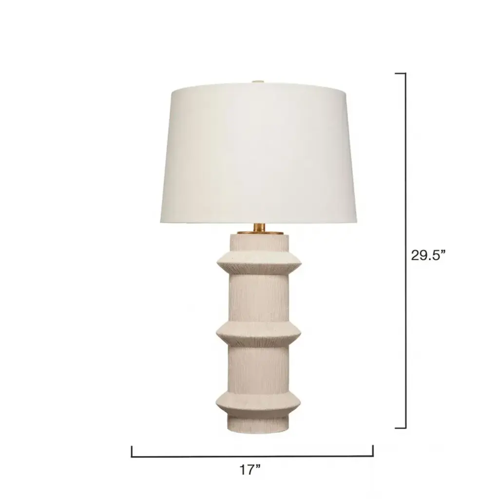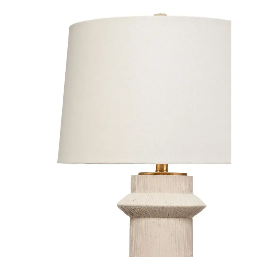 Architecturally inspired and modern in any era, this unique lamp is handcrafted with quality polyresin. Its geometric lines are enhanced by a textured cream finish and warm antique brass hardware, and it is topped with a drum shade in white linen. Place a pair on either side of a long, low console or individually next to an armchair.