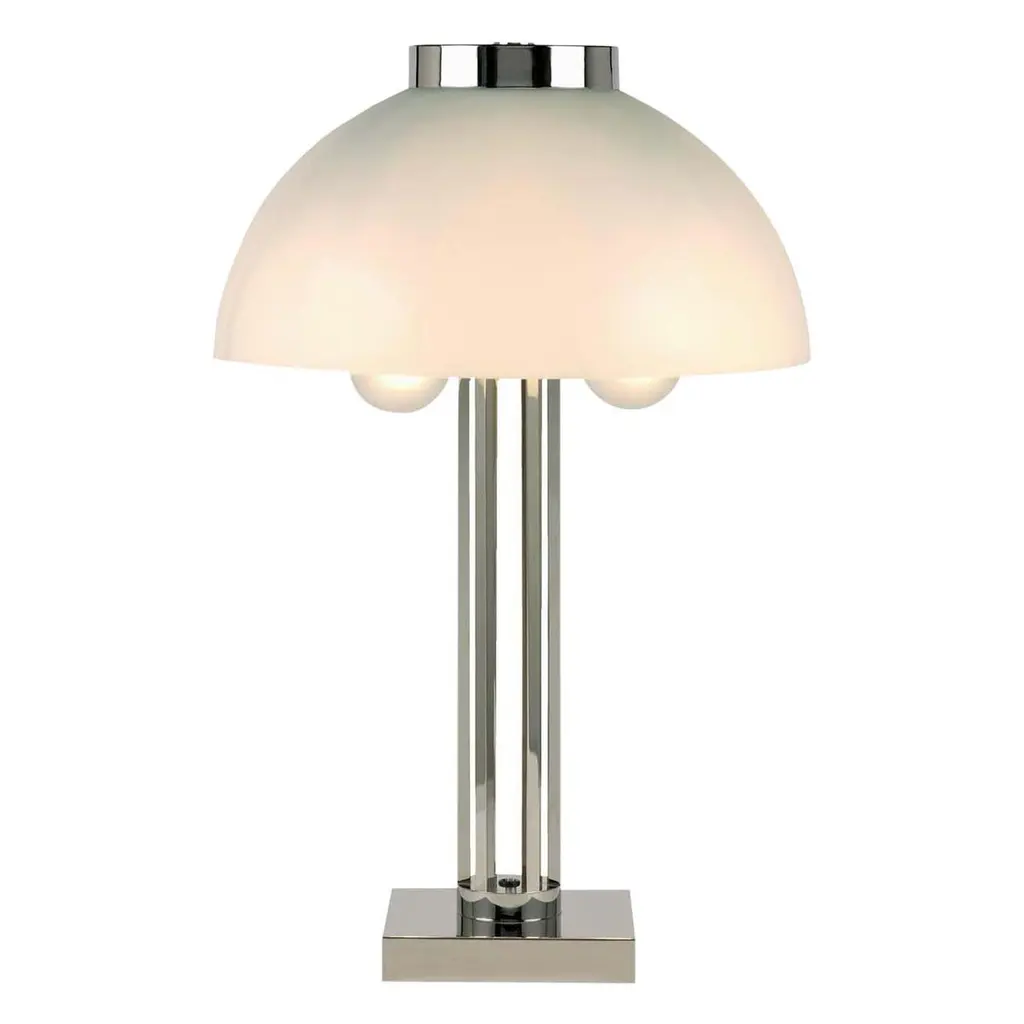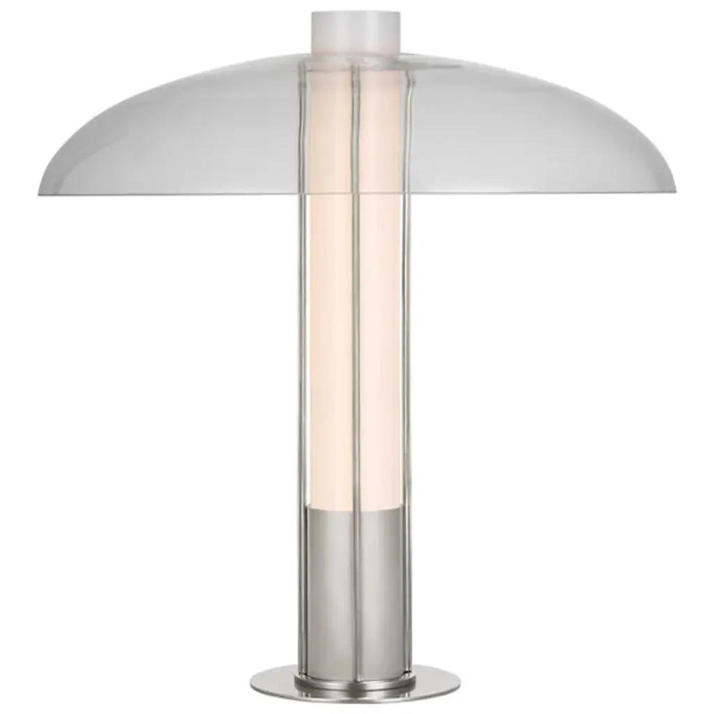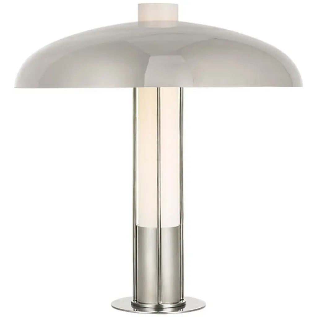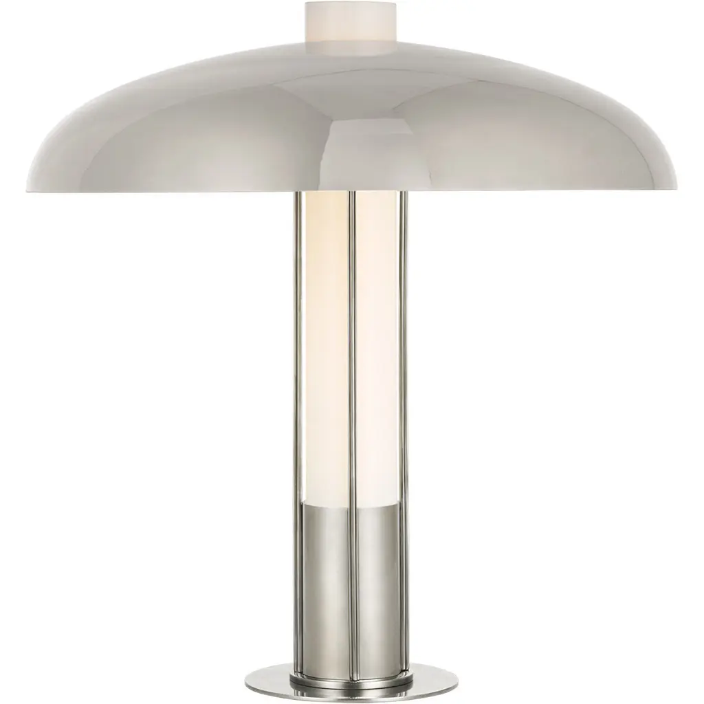 Make a decadent Deco addition to inside tables and workspaces with the Troye Table Lamp from Visual Comfort Signature, formerly known as Visual Comfort, An enchanting design by Kelly Wearstler, it ascends from a low-profile disc base, seating a single strong lamp inside a translucent tubular diffuser that transforms bright glare into a pleasing glow. The light housing pierces the shallow bowl-shaped shade set atop it to capture and redistribute some of the ambient glow supported by four slender rods, which use their sleek surface to contrast delightfully with the pearlescent diffuser below.