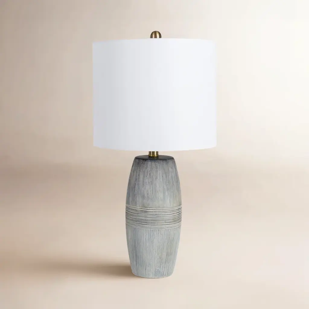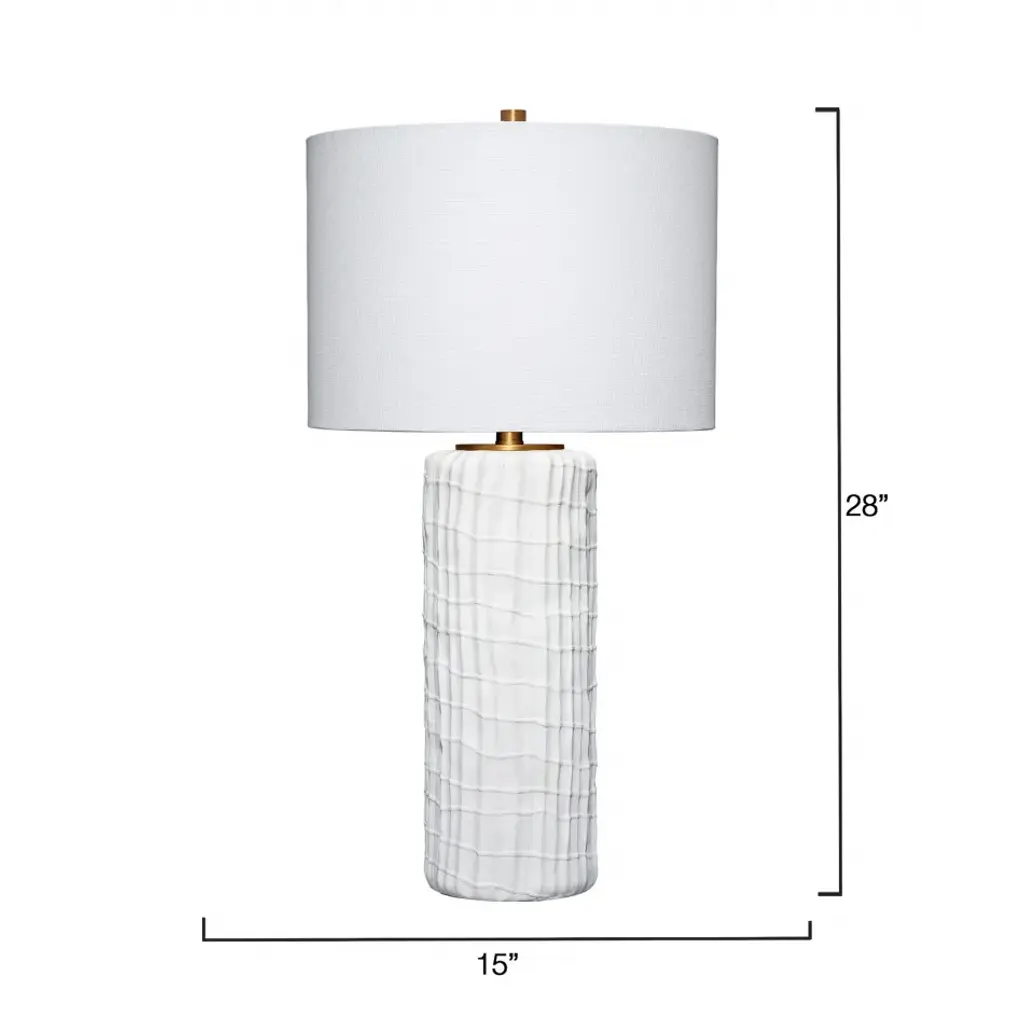 The white-on-white palette of this crisp, clean lamp is broken only by the small splashes of brass provided by the harp, spider, and cylinder finial. Each is artisan created of quality resin and topped with a white linen drum shade with a rolled edge. Casual and comfortable but also very stylish, it is an easy choice for any modern home.