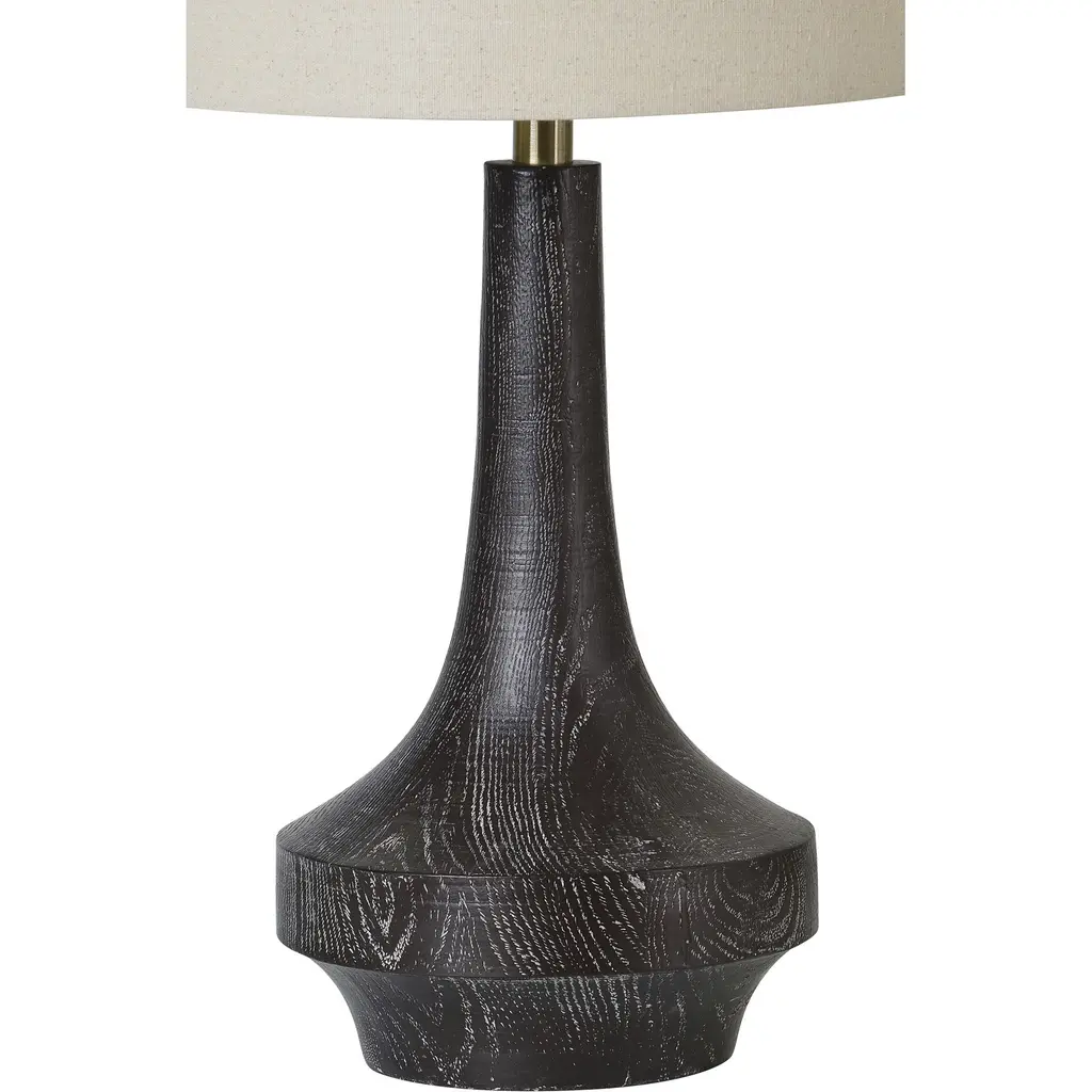 The home interior is enveloped by warmth and comfort with this table lamp resting on the end table or night stand. While the dark brown wood grain painted polyresin base and natural linen shade have an organic quality, its design feels sleek and current. The design allows the curated room to feel cohesive and cozy.