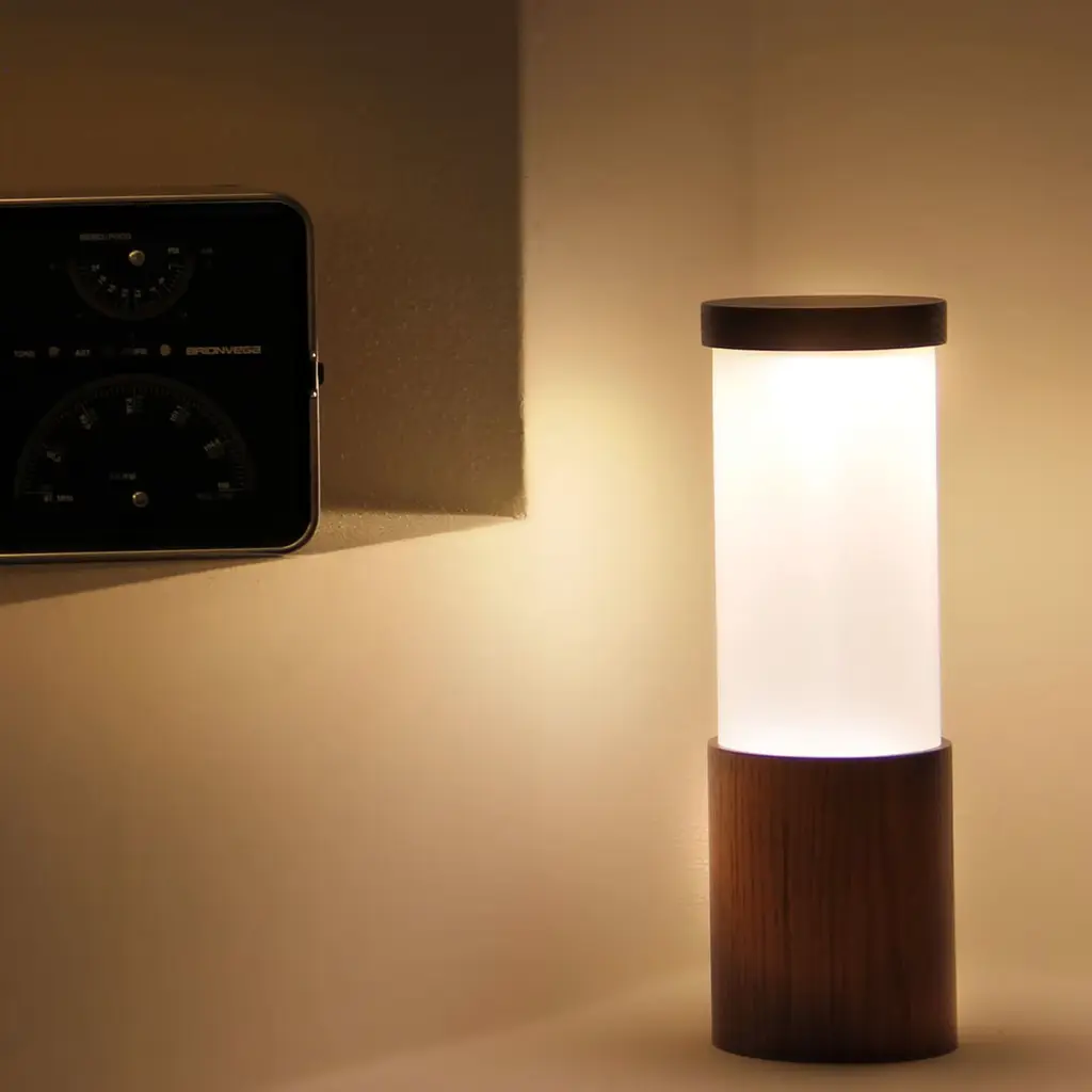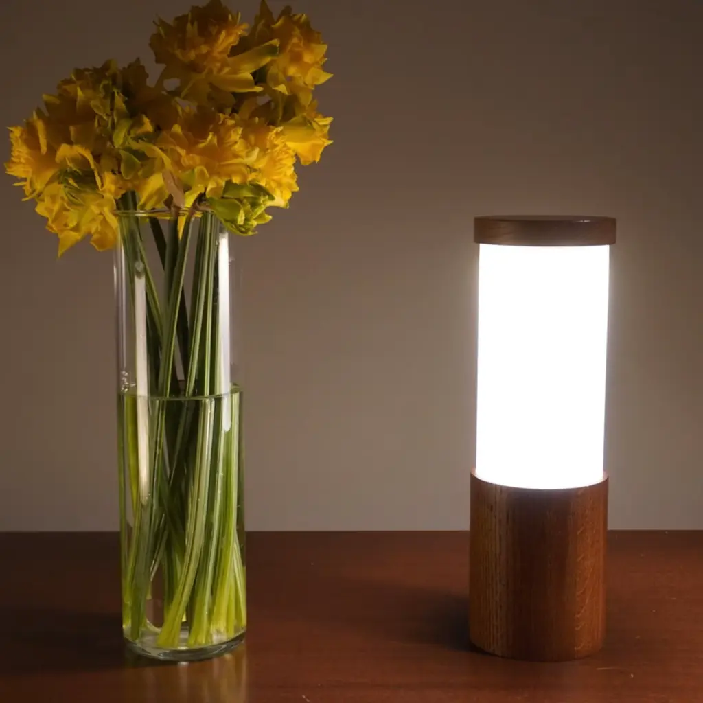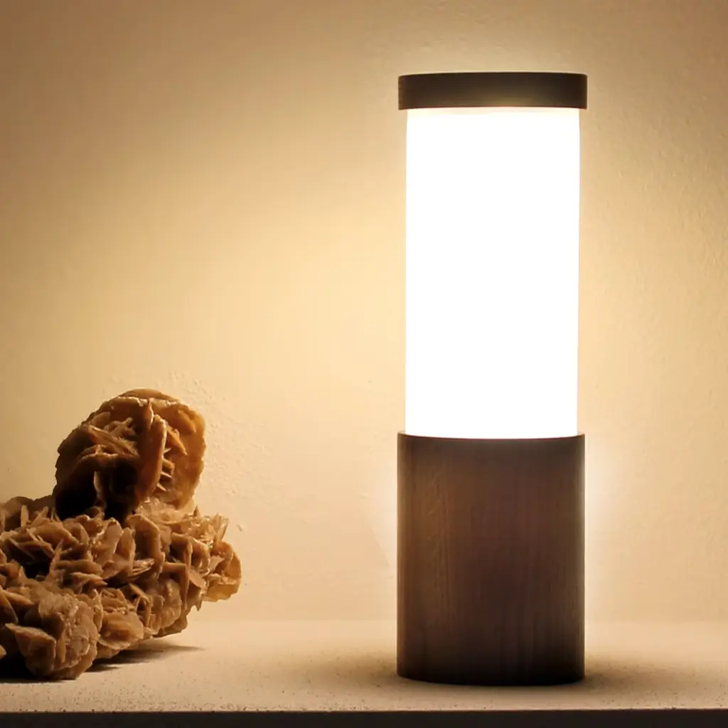 This elegant rechargeable table lamp perfectly embodies a bond with nature and geometry, both references harmoniously synthesized in its simple yet captivating design. The cylindrical diffuser in satin glass encases an LED source with a rated power of 3.6 W and voltage of 7.4V, for a warm glare that splendidly illuminates the surroundings while accenting the natural grain of the wooden base and top.
