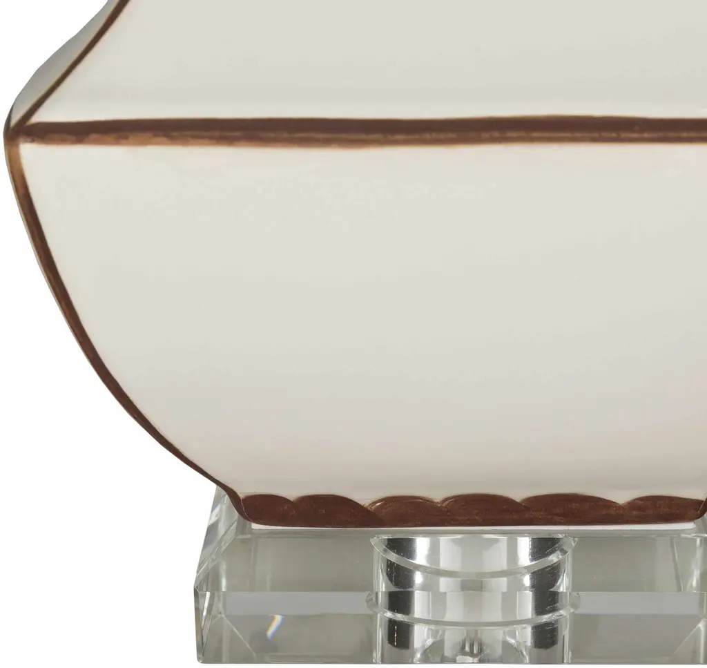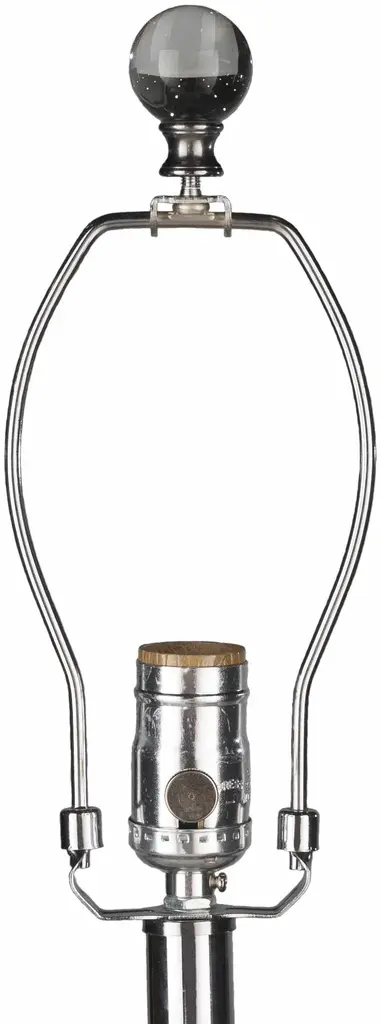 Collection: Tuka Colors: Tan, White, Clear, Metallic - Nickel Material: Body: Ceramic,Base: Crystal,Shade (Outside): Faux Silk,Shade (Inside): Polyester,Finial: Crystal Styles: Traditional Made In: China Lighting Type: Accent Table Lighting Base: Crystal Base Color: Clear Shade Material: Faux SilkPolyester Shade Color: Ivory Cord Length: 6' Switch Type: 3-Way Number of Bulbs: 1 Socket Type: E-26 Bulb Wattage: 100W