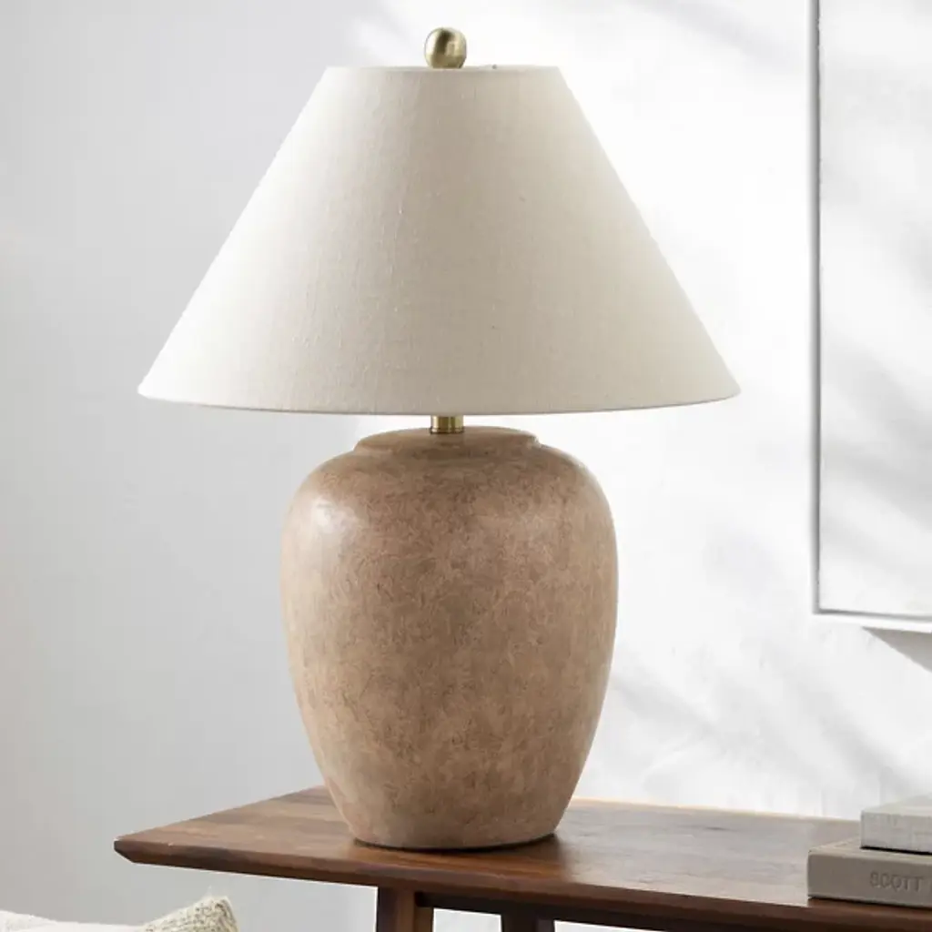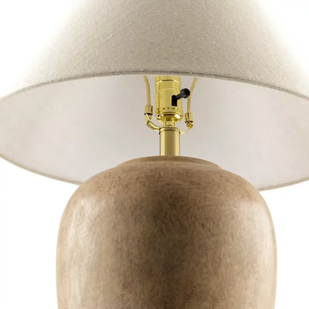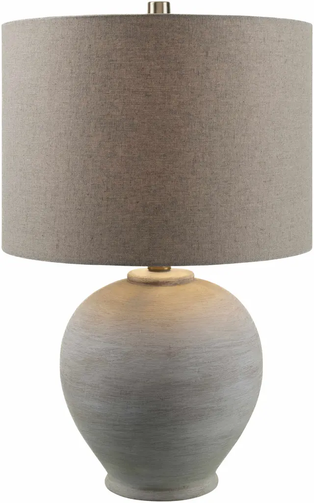 The Turin Table Lamp from Surya centers on a ceramic base that grounds this traditional design. Its linen bell shade—lined with matching material-distributes light evenly throughout a room. This lamp sits comfortably on nightstands, console tables, or among books on a shelf, while its rocker switch makes operation simple and intuitive. What makes this piece special is how it blends into a room while still performing its essential function. Its proportions feel natural in most spaces, neither too large nor too small.