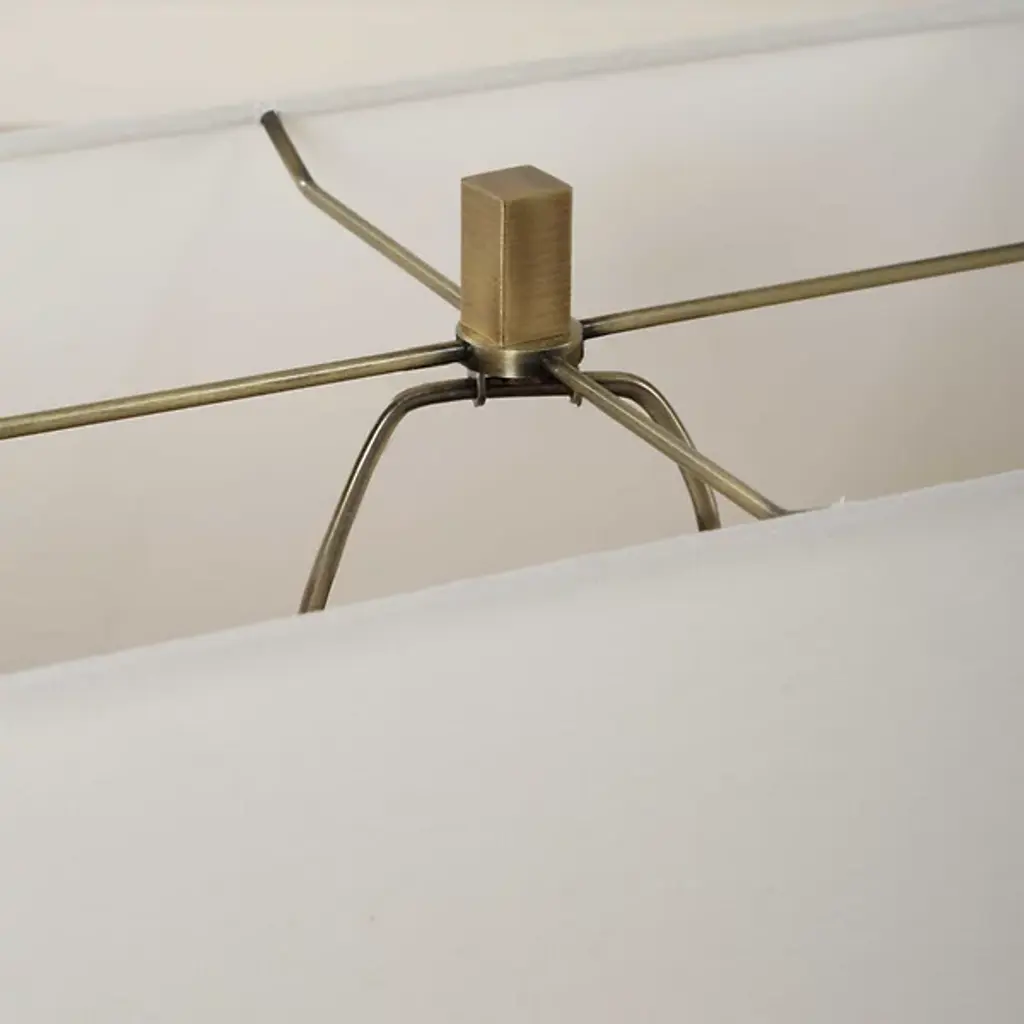 The Turning Point Travertine Table Lamp from Uttermost is a striking Mid-Century Modern design with a U-shaped honed travertine design, elegantly perched on a slender base finished in brushed antique brass. Designed by Jim Parsons, its rectangle white linen drum shade complements the lamp’s intricate aesthetic, moderating the direct glow from the light source. The natural travertine contrasts nicely with the refined steel, adding an individual character to any flat surface it enlivens.