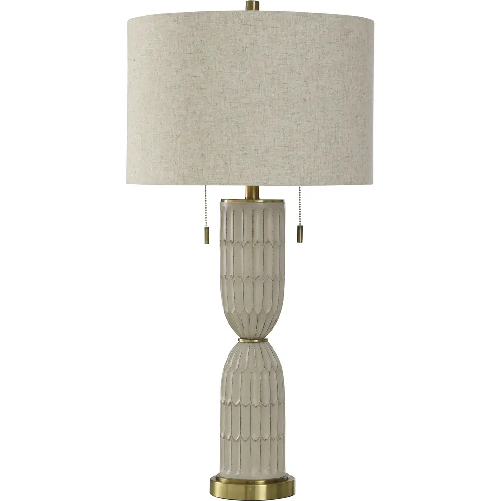 With a design that mixes boldness and elegance, this beige table lamp brings stylish illumination to a desk, buffet, or nightstand. It''s an outstanding addition to an office, hallway, living room, bedroom, or dining room. The open frame features graceful curves and scrollwork details enhanced by the tuscana cream finish. The beige hardback shade complements the color of the frame, and three-way operation makes this lamp functional as well as beautiful.Features: Finish: Tuscana CreamShade Finish: BeigeMaterial: poly Shade Material: Hardback FabricLength: 16.5 inchesWidth: 16.5 inchesHeight: 34 inchesVoltage: 120VWattage: 150Safety Rating: Dry Location - This item is rated for dry locations, meaning it can be used in an indoor area that is not normally subject to dampness. May include a location subject to temporary dampness provided ventilation is adequate to prevent any accumulation of moisture such as the bathroomBulb(s) Included: NoBulb Type: IncandescentNumber of Bulbs: 1Due to lighting and monitor differences, actual colors and finishes may vary slightly from what appears online.