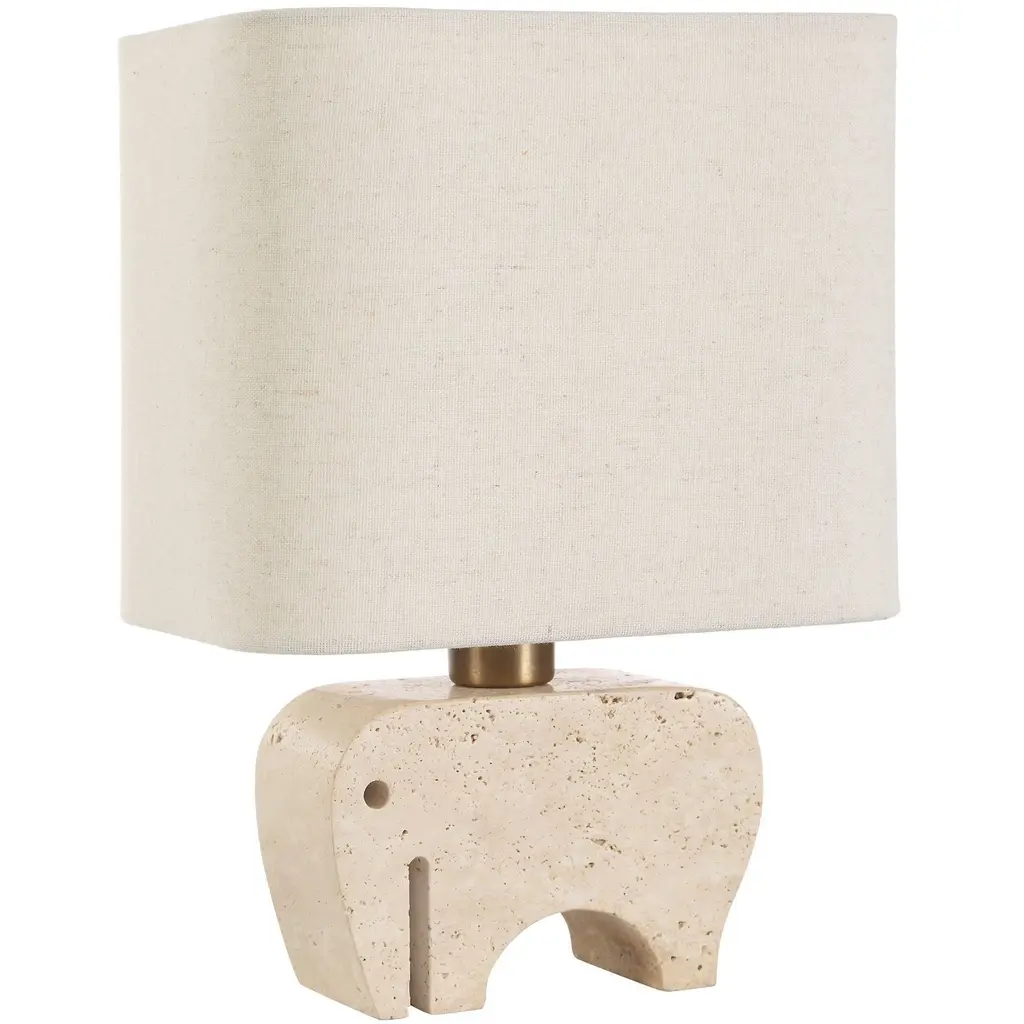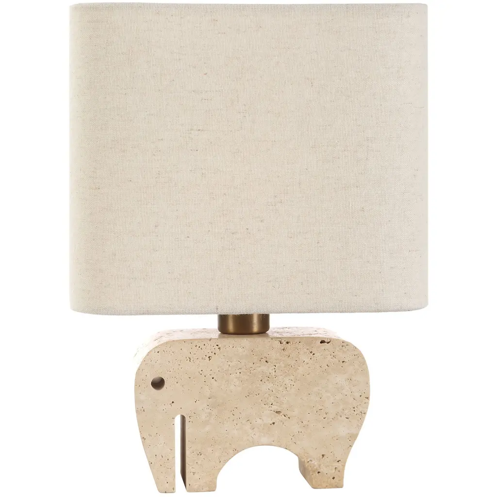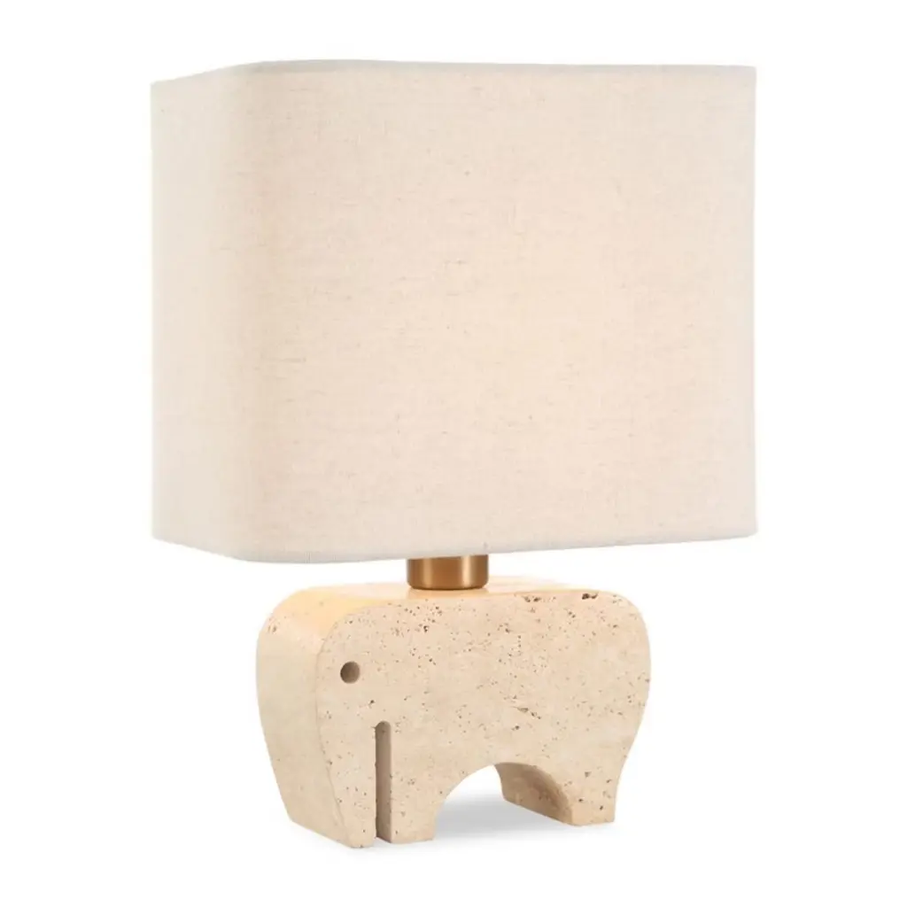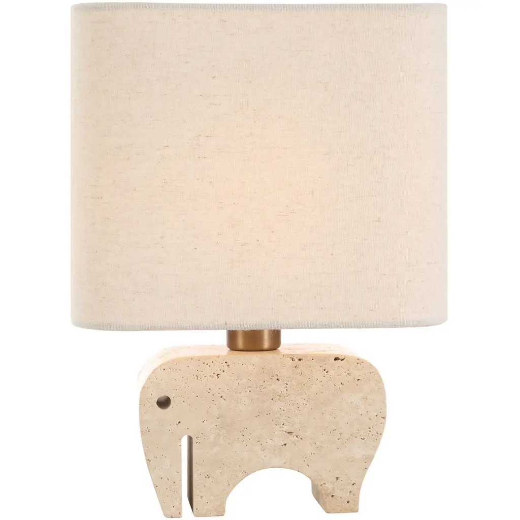 The Petite Tusk Accent Lamp Features A Whimsical Elephant Sculpture Carved Out Of Beige Travertine, Accented With Brass Plated Details. The Rectangle Hardback Shade With Curved Corners Is Covered In A Casual Khaki Fabric With Natural Slubbing. Perfect Accent Piece For Kitchen Counters, Etageres, Or Anywhere That Needs Visual Artistry.