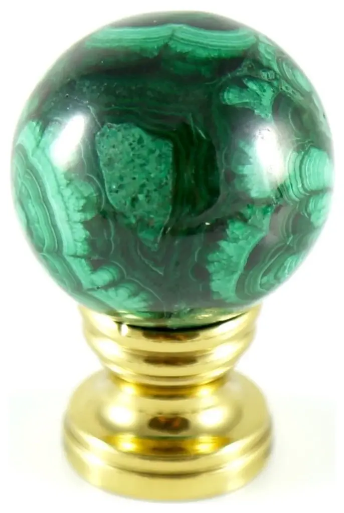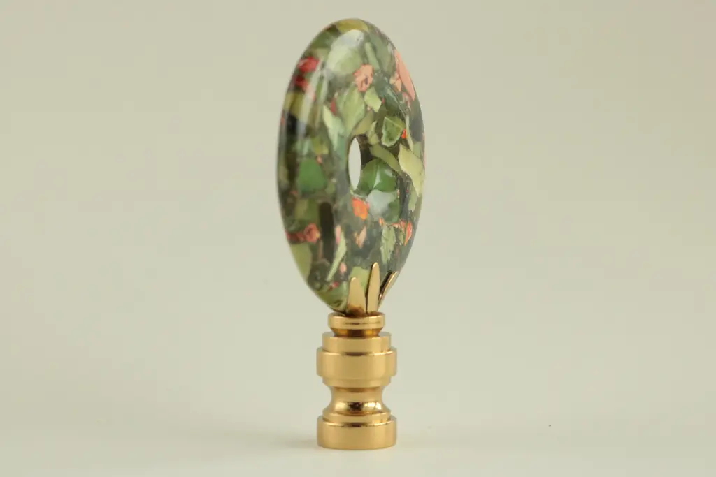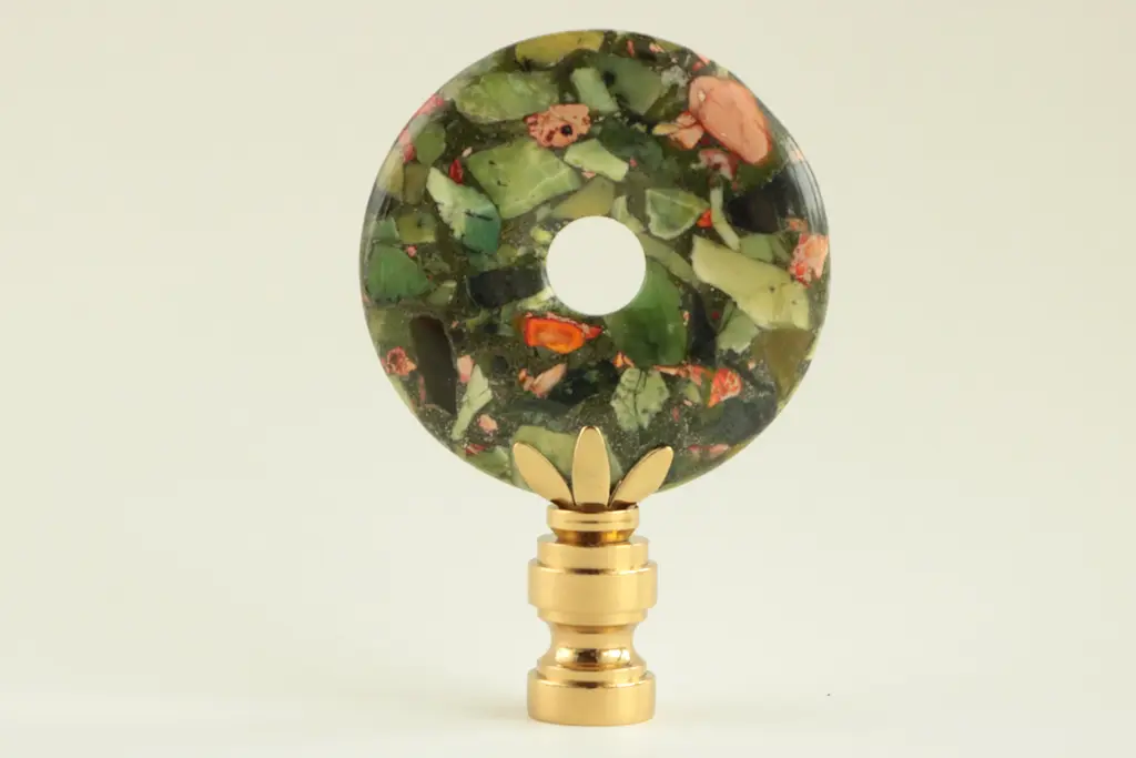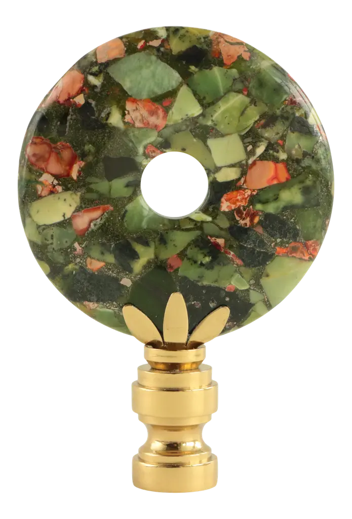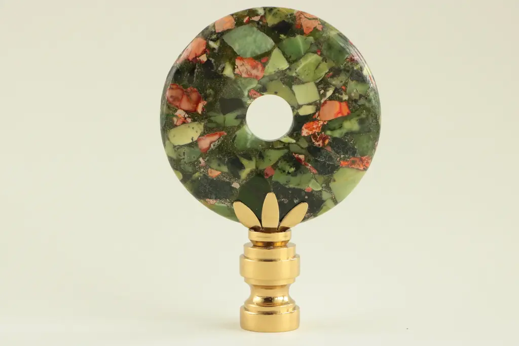 Upgrade your existing lighting or add a distinctive finishing touch to any table lamp with a designer lamp finial. Crafted from a round, donut form sea sediment jasper with chrysoprase inclusions. Handmade in Wisconsin. Meticulously prong-set and fixed with jeweler's-grade adhesives. Polished solid brass finial base(s) will fit a standard-size lamp harp with a 1/4" stem. This design measures 3" tall and 2" across. Coloration may vary based on the nature of the material and varied light sources.