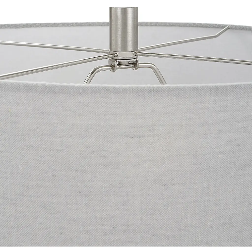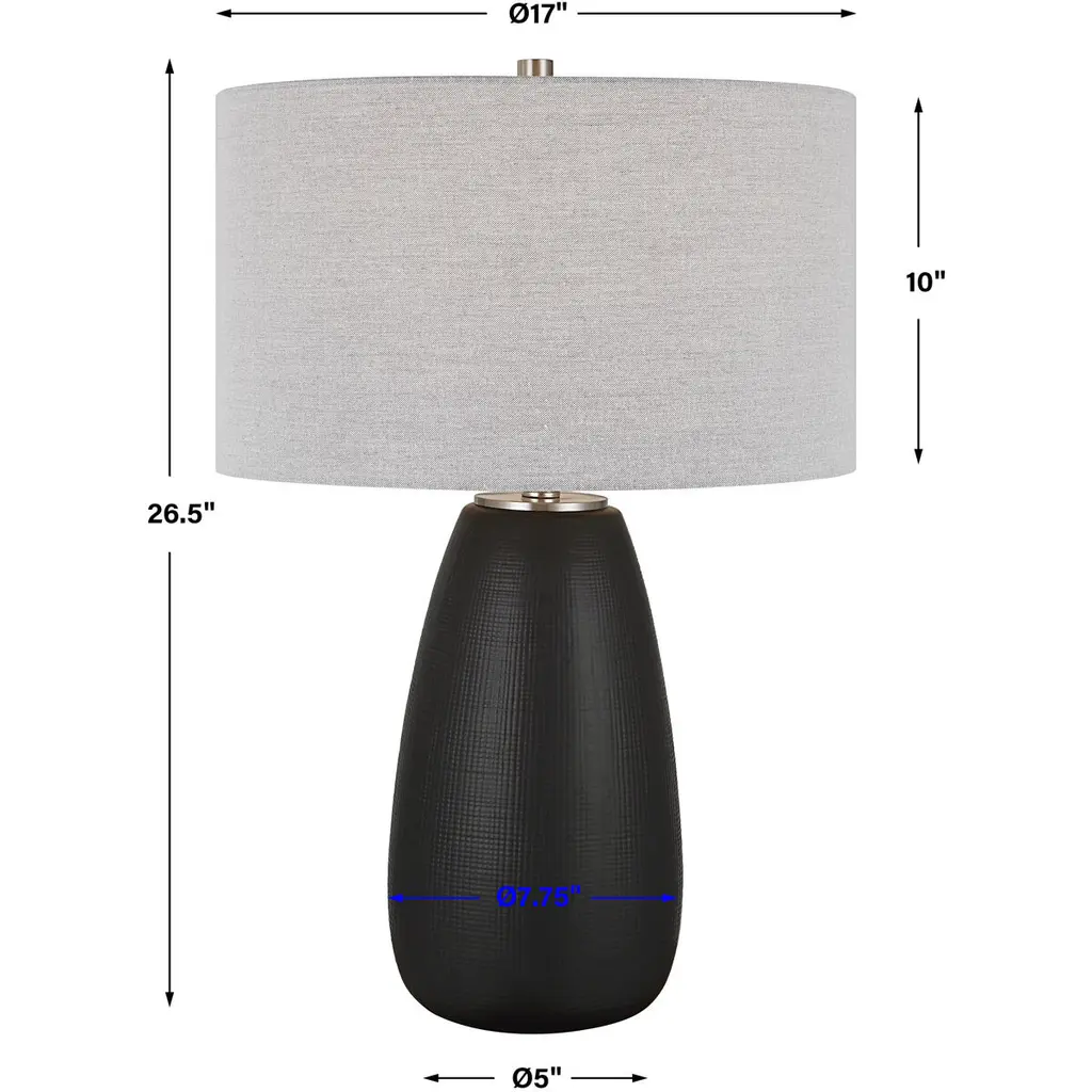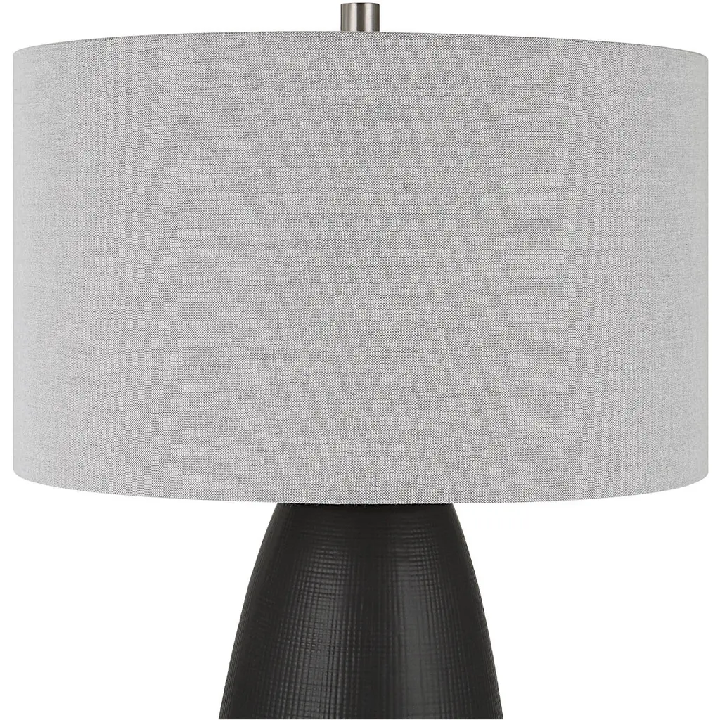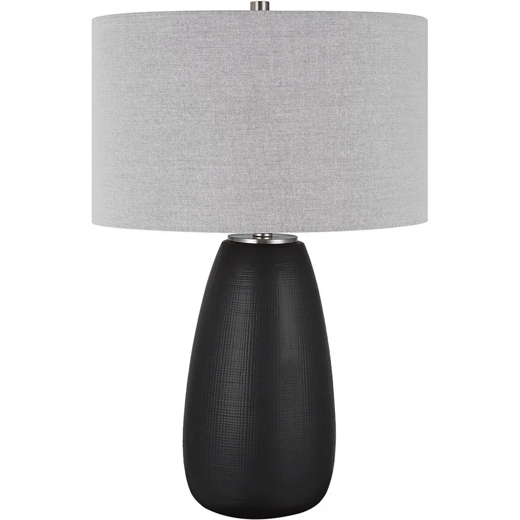The Twilight Table Lamp Features A Ceramic Base With A Subtle Carved Gridline Texture, Finished In A Satin Black Glaze And Accented By Brushed Nickel Plated Details. The Hardback Drum Shade Is Covered In A Light Gray Linen Fabric.