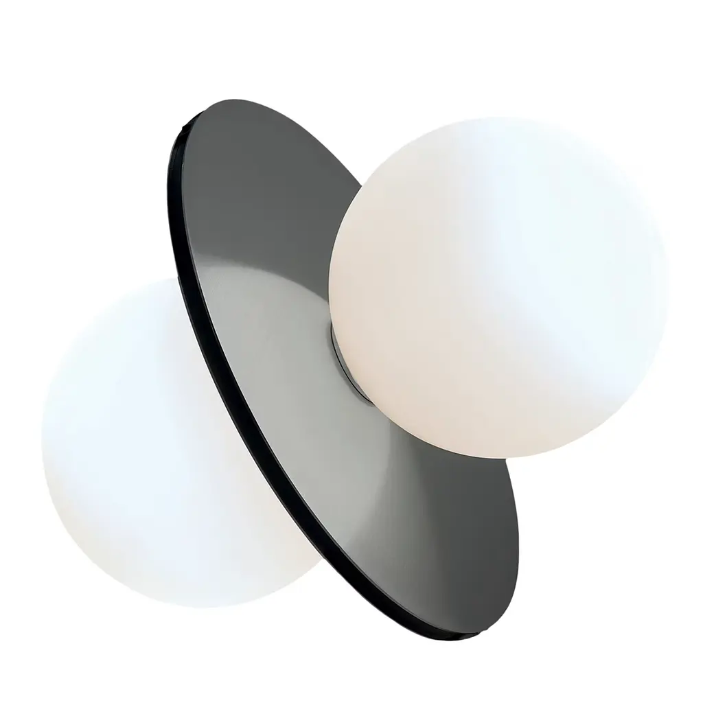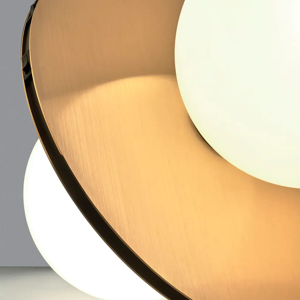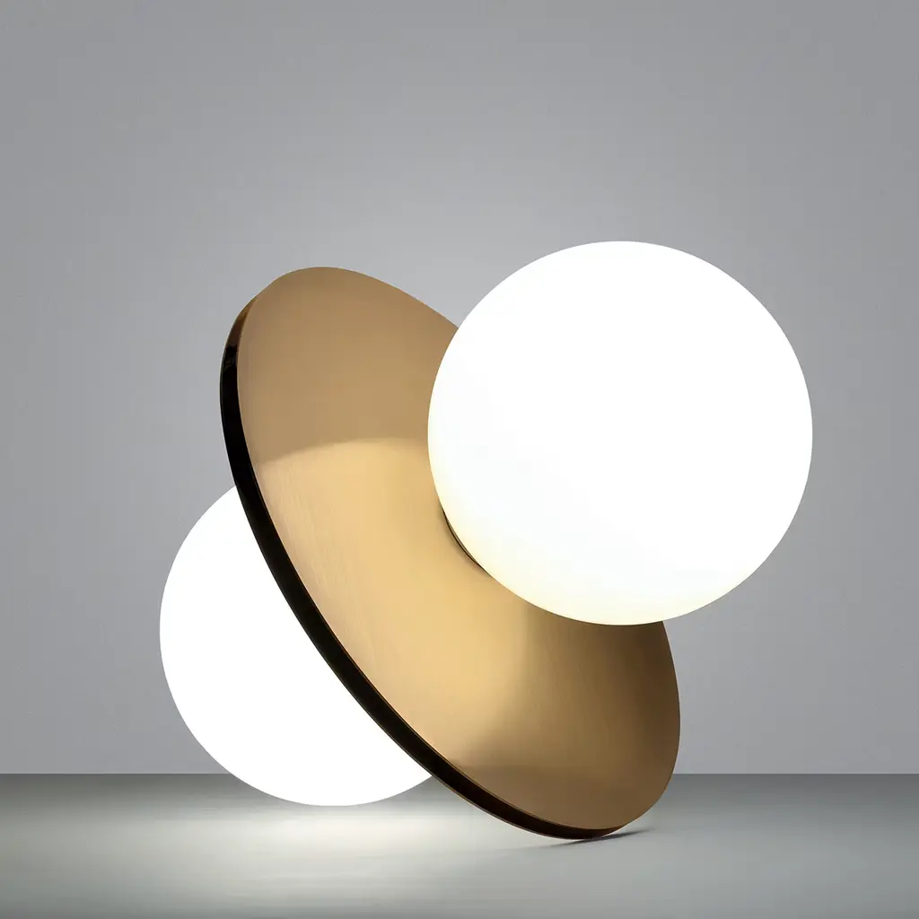An iconic design of contemporary inspiration designed by Michele Reginaldi, this table lamp emits a direct light that will illuminate a living environment as well as a contract setting. Made of gold-finished steel, the round diagonal base features two blown opaline glass shades. Black fabric cable included (200cm). Please ask the Concierge for more technical details.