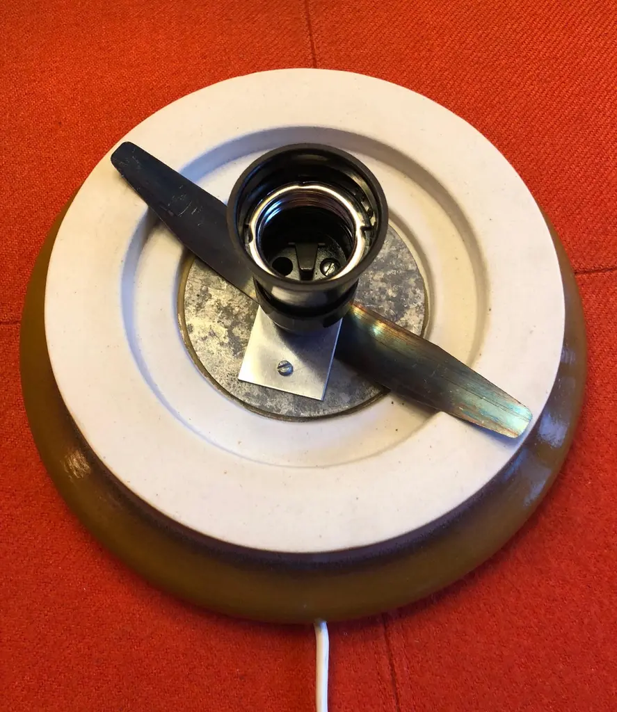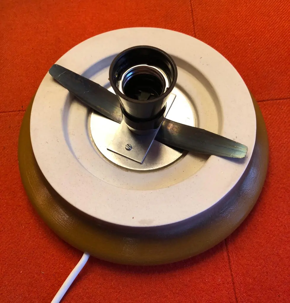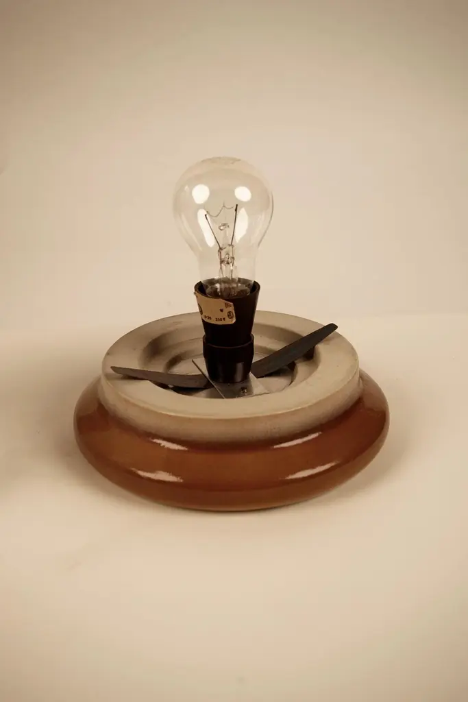 This elegant lamp is composed of two parts, the top is made from opaline glass and is fitted to a ceramic base with a curry-mustard brown glaze.The lamp was produced by Kamenicky Senov in the Czechoslovakia.