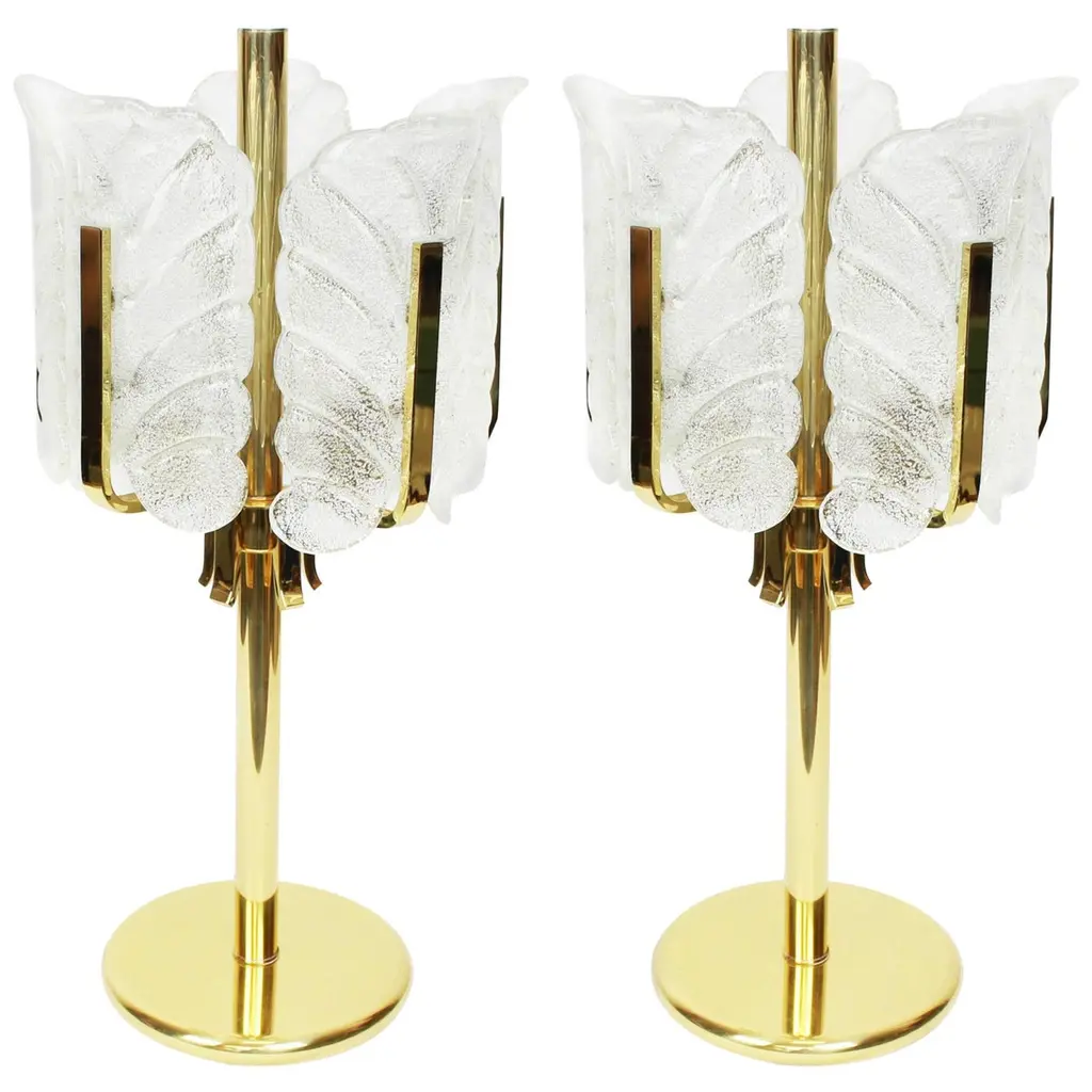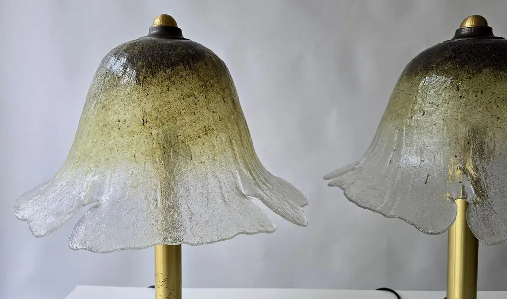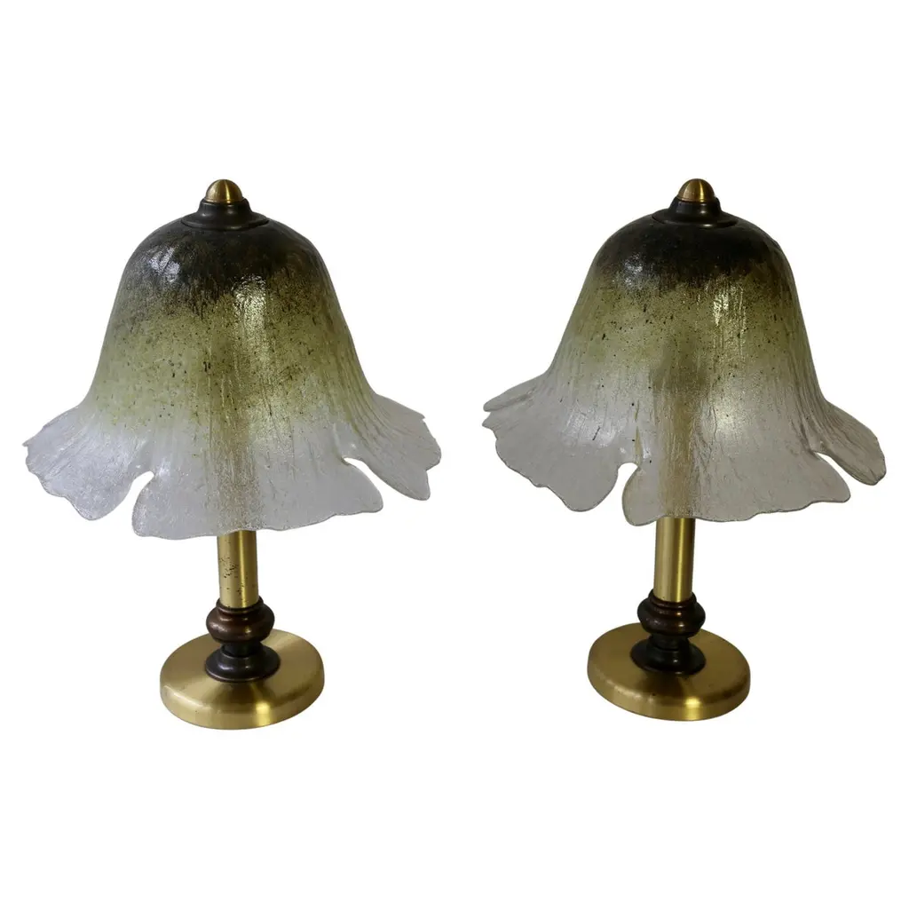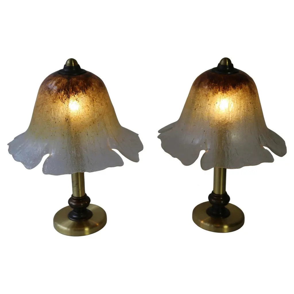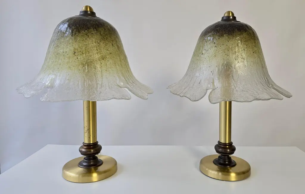 Two beautiful table lamps in a classic and natural mushroom shape. Made by German company Peill & Putzler.The lamp features a brass base that supports the lamp shade of thick, heavy glass that has the appearance of ice. The bottom part of the lamp shade is colorless glass, while the top has a sort of opaque color. The edges of the lamp shade especially convey the sense of a natural mushroom.In total, the lamp measures 45 centimeters (approx 18") tall. In excellent condition, some spots of the base.The lamp uses a regular sized E27 light bulb, 60W max according to the manufacturer. An energy efficient LED bulb is recommended. Wiring perfectly suited for 110V and 220V grid, EU-spec plug.