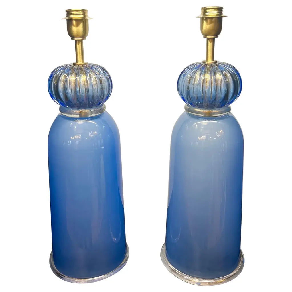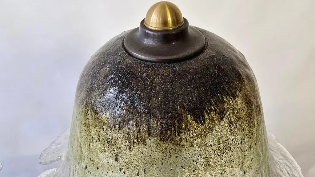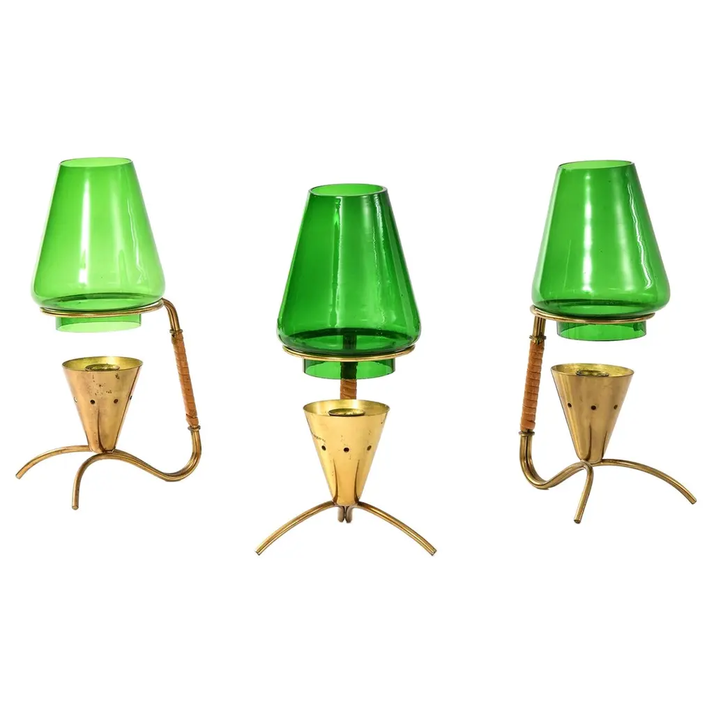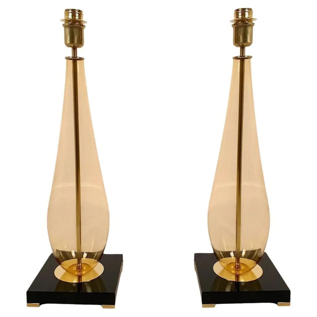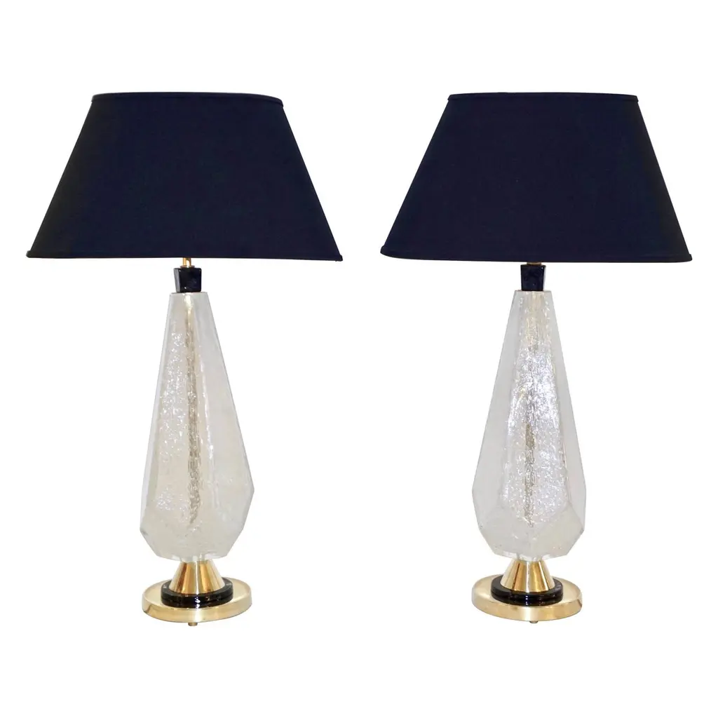 Two beautiful table lamps in a classic and natural mushroom shape. Made by German company Peill & Putzler.The lamp features a brass base that supports the lamp shade of thick, heavy glass that has the appearance of ice. The bottom part of the lamp shade is colorless glass, while the top has a sort of opaque color. The edges of the lamp shade especially convey the sense of a natural mushroom.In total, the lamp measures 45 centimeters (approx 18") tall. In excellent condition, some spots of the base.The lamp uses a regular sized E27 light bulb, 60W max according to the manufacturer. An energy efficient LED bulb is recommended. Wiring perfectly suited for 110V and 220V grid, EU-spec plug.