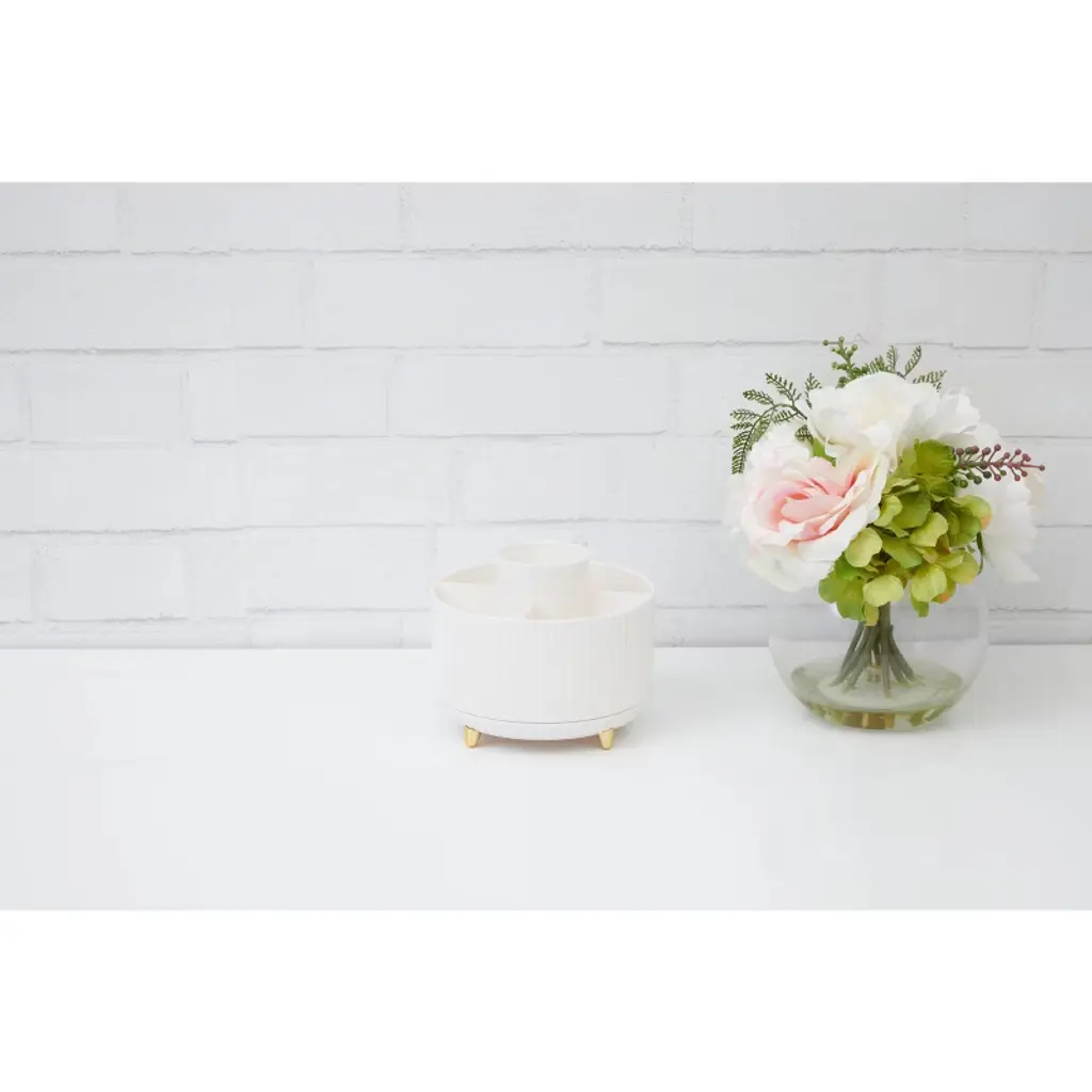 A little metallic detail transforms this traditional 13.5" lamp to a modern delight! This two toned table lamp maintains a sleek look with a linear division of colors suited to inspire the latest trend of decor! The cylindrical base is made primarily of porcelain , and topped with a standard fabric drum shade to complete this look!