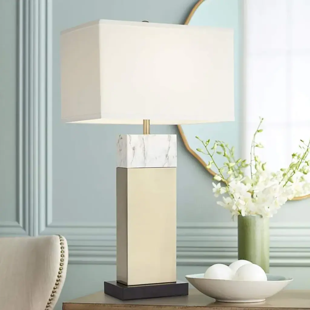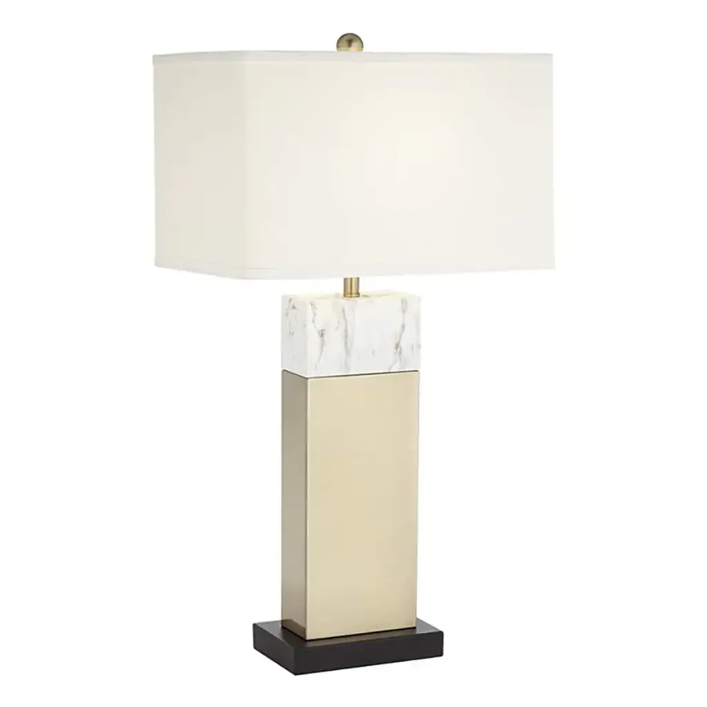 30" high overall. Rectangular shade is 16" across the top and bottom x 8" deep x 10" high. Uses one maximum 150 watt standard-medium base light bulb (not included). On-off socket switch. Two-Tone table lamp. A modern lamp Faux marble finish at the top of the base, gold-tan finish at the bottom. Metal and cast resin construction. White linen rectangular lamp shade. 8-foot long clear-silver cord. This rectangular table lamp provides a contemporary dash of style for your decor. the lamp features a two-tone finish with faux marble detailing at the top of the rectangle base and a gold finish bottom section. A rectangular white linen fabric shade completes the look on top.