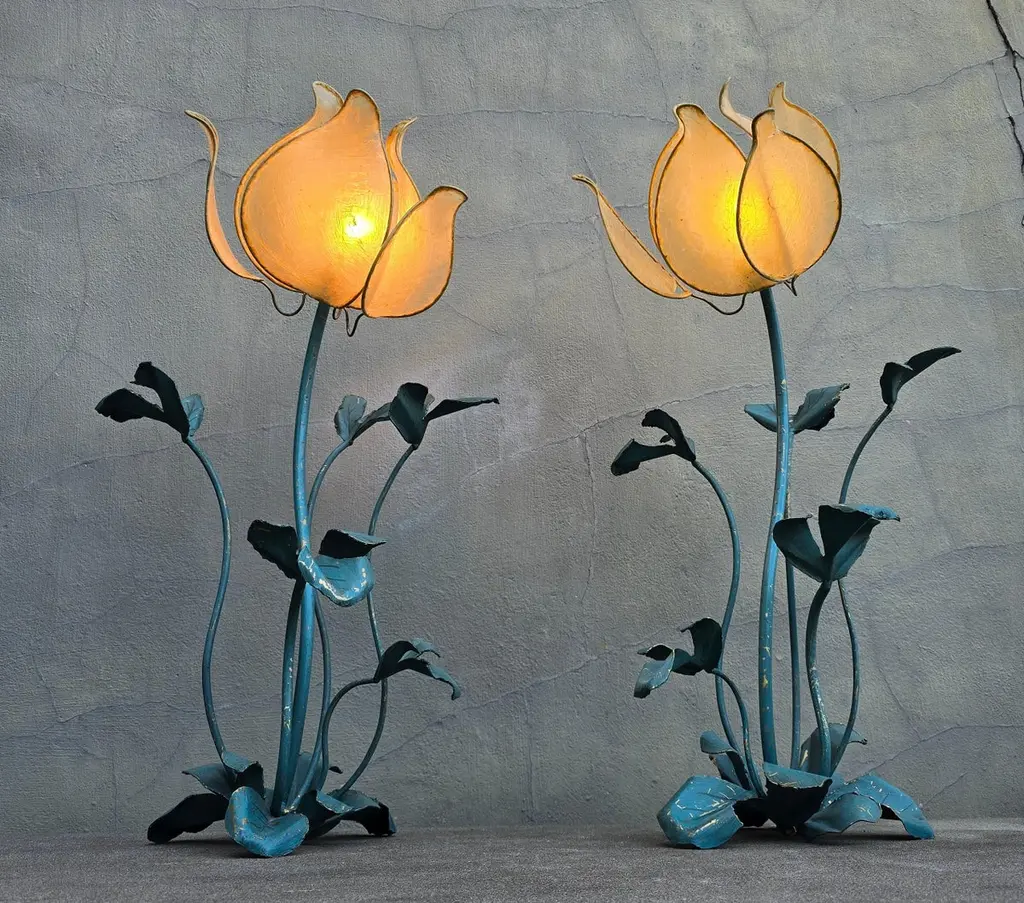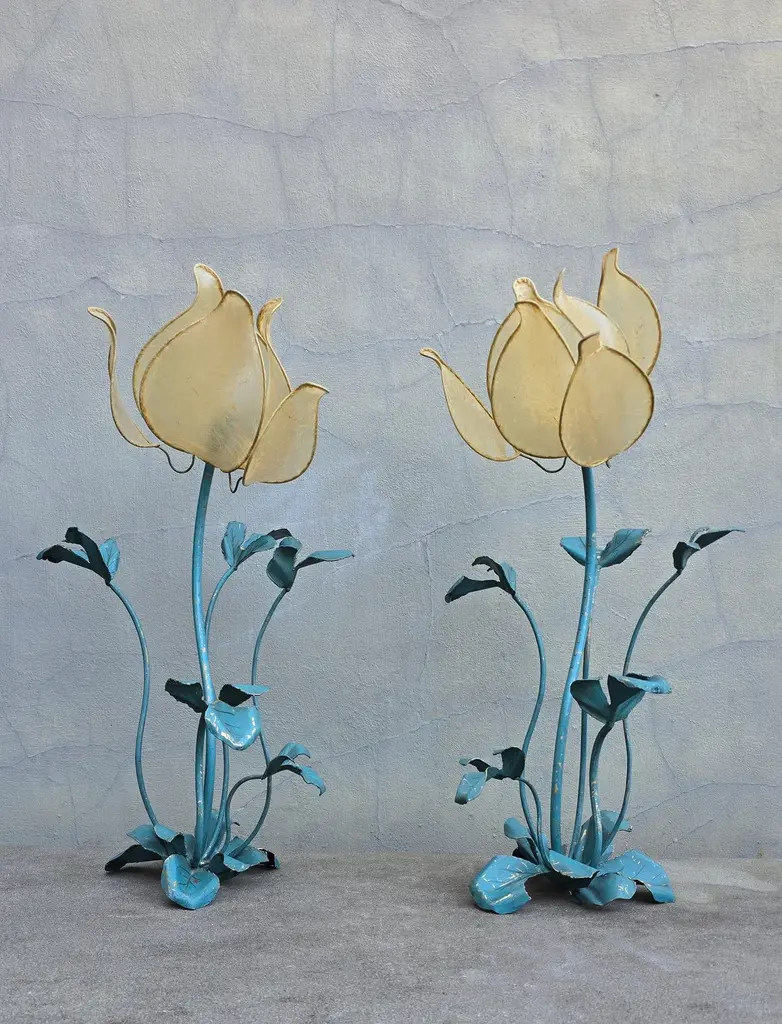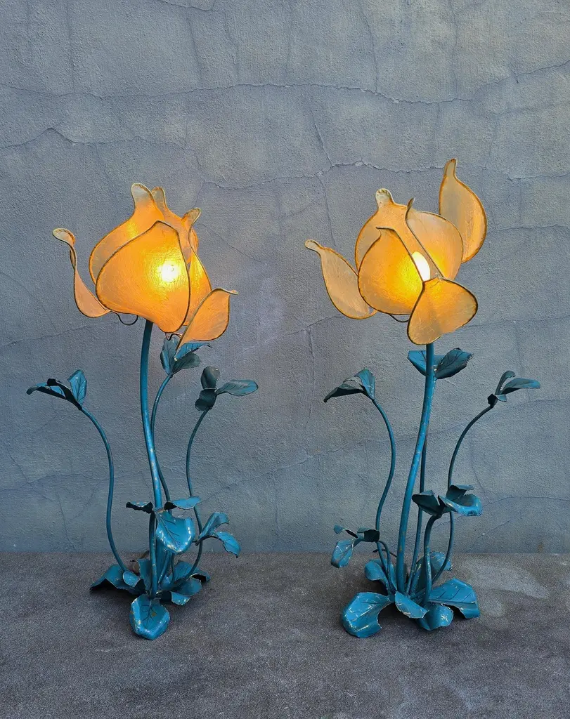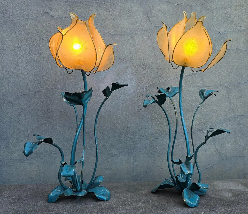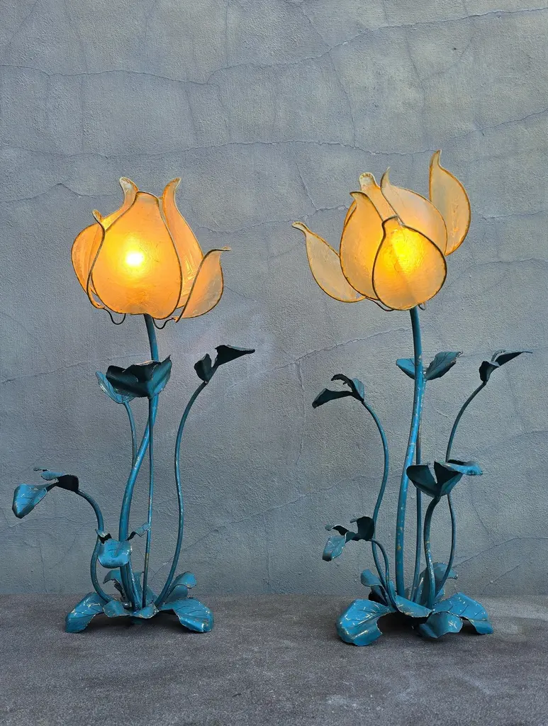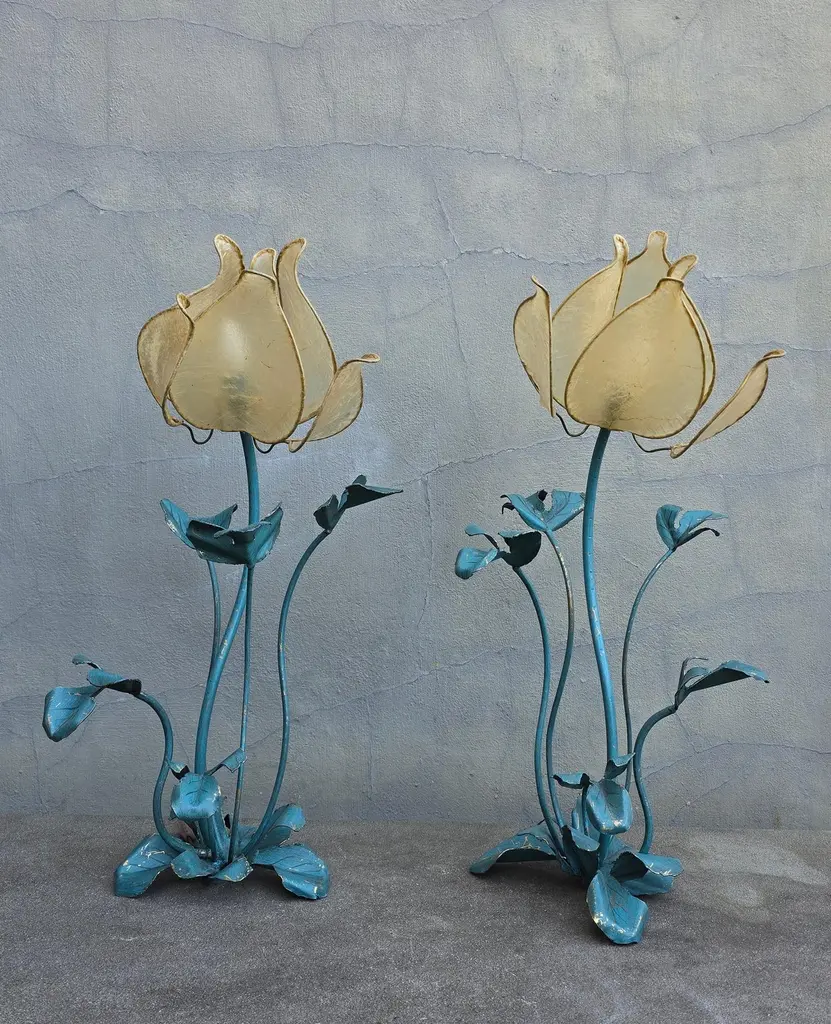 Set of two vintage flower lamps with pig bladder shades.Unique set of two special table lamps in the shape of flowers. The shades are made of pig bladder, a rare artisanal material that provides a warm, diffuse glow. The frame and the graceful stems and leaves are made of metal with a turquoise patina. These types of lamps probably come from the 50s-60s and fit perfectly in a Hollywood Regency, Art Nouveau or bohemian interior. The graceful metal frame has a beautiful blue-green patina and is designed as a blooming flower with detailed leaves and stems. These types of lamps used to be handmade and are very rare today.This special lamp is a real eye-catcher. With its graceful metal stems, playful leaves and unique flower cap made of pig's bladder, this lamp combines craftsmanship with natural design. To be used as a floor lamp or as a large table lamp, perfect for lovers of vintage, bohemian and Hollywood Regency interiors.Rare due to the combination of natural material and artistic design! Mood lighting in a romantic or vintage interior.A striking decorative piece in a bohemian, art nouveau or eclectic style.Height: 88 cm / 34.6 inchWidth: 43 cm / 16.9 inchDepth: 45 cm / 17.7 inchFitting: 1 x E14 per bulb (small fitting)