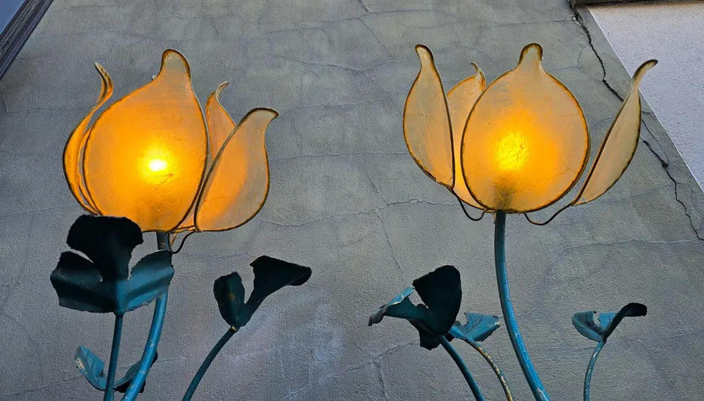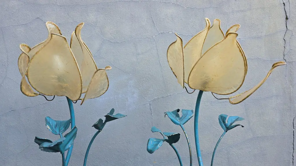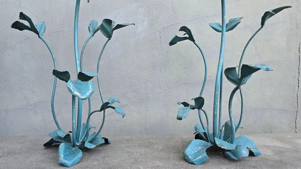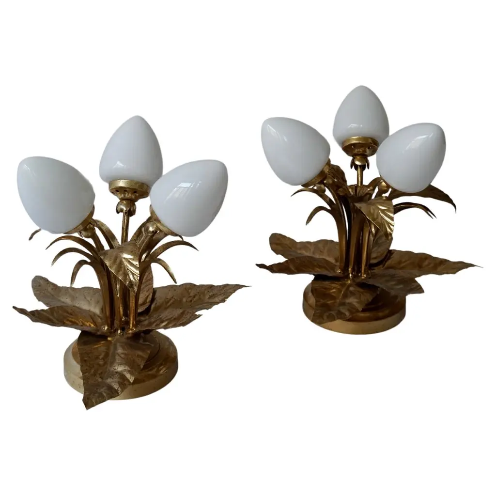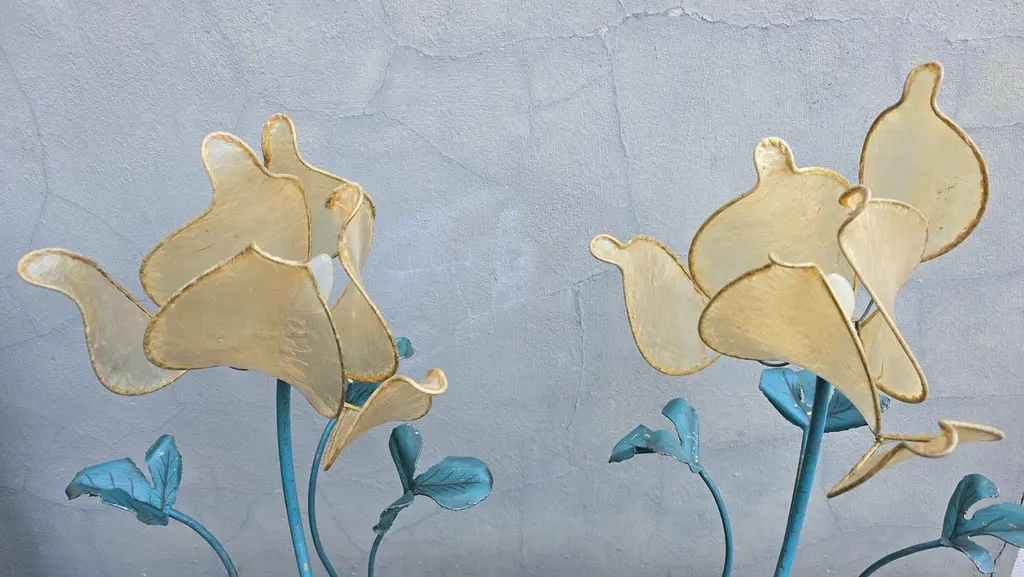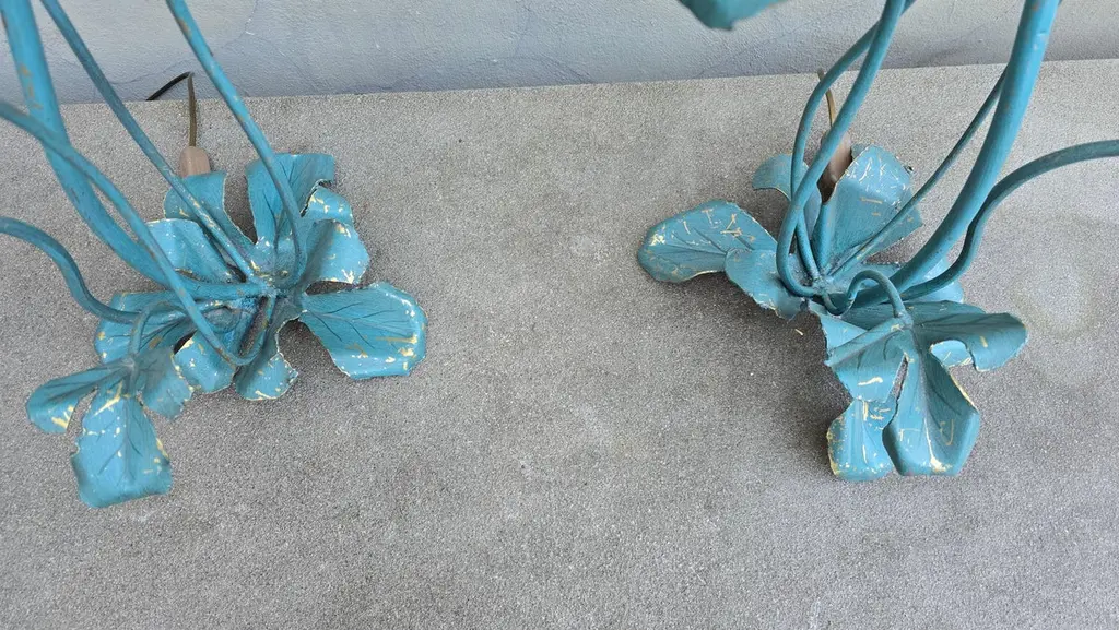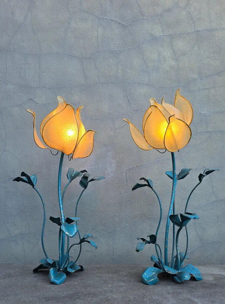 Set of two vintage flower lamps with pig bladder shades.Unique set of two special table lamps in the shape of flowers. The shades are made of pig bladder, a rare artisanal material that provides a warm, diffuse glow. The frame and the graceful stems and leaves are made of metal with a turquoise patina. These types of lamps probably come from the 50s-60s and fit perfectly in a Hollywood Regency, Art Nouveau or bohemian interior. The graceful metal frame has a beautiful blue-green patina and is designed as a blooming flower with detailed leaves and stems. These types of lamps used to be handmade and are very rare today.This special lamp is a real eye-catcher. With its graceful metal stems, playful leaves and unique flower cap made of pig's bladder, this lamp combines craftsmanship with natural design. To be used as a floor lamp or as a large table lamp, perfect for lovers of vintage, bohemian and Hollywood Regency interiors.Rare due to the combination of natural material and artistic design! Mood lighting in a romantic or vintage interior.A striking decorative piece in a bohemian, art nouveau or eclectic style.Height: 88 cm / 34.6 inchWidth: 43 cm / 16.9 inchDepth: 45 cm / 17.7 inchFitting: 1 x E14 per bulb (small fitting)