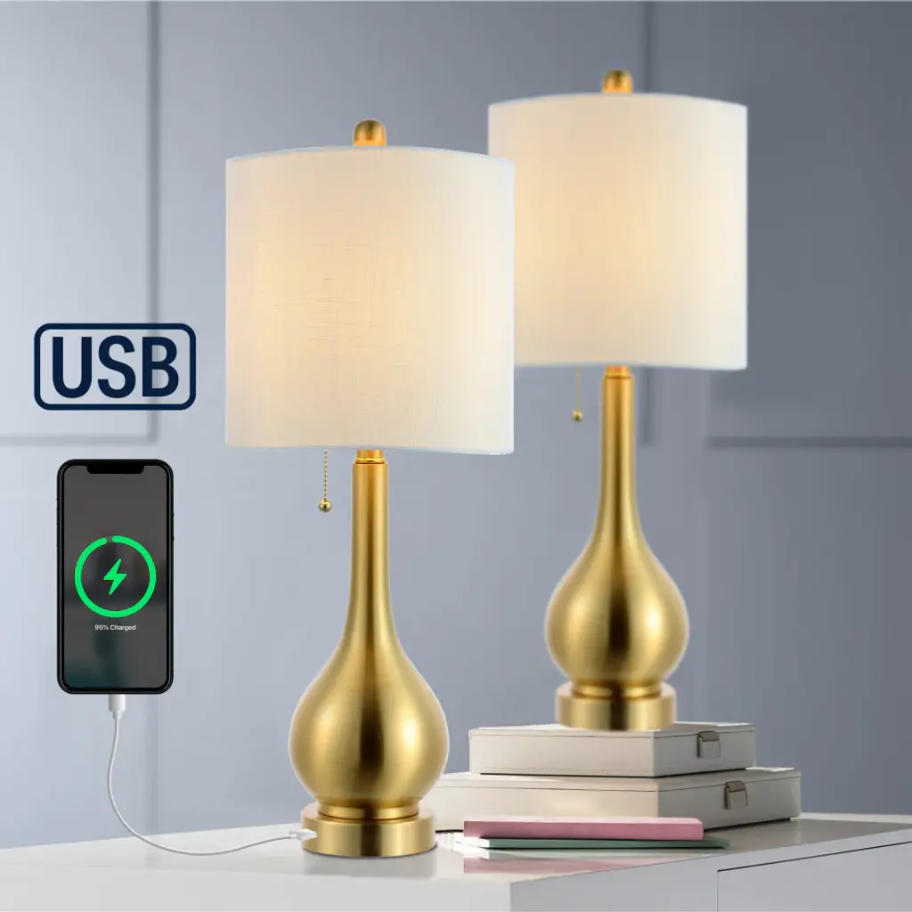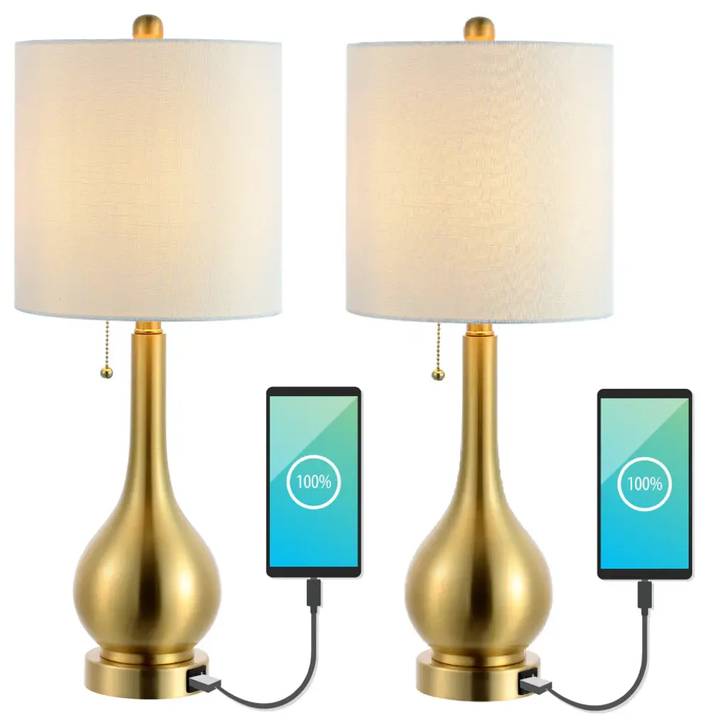 Our modern take on mid-century gourd lamps is updated to include handy USB charging ports. This pair of metal lamps is perfect for a bedroom, living room, or entry. The versatile 24" height is ideal for ambient lighting, with bright LED bulbs that are softened by linen shades.Features:• Classic brass gold finish is complemented by white shades that add warmth to any interior• Quality touches include linen hardback shades, pull-chain switches and silk-wrapped cords• Ideal for vacation homes and hospitality projects, each lamp is made from durable metal and has two USB charging ports• Eco-friendly 4W LED bulb included• Takes 1 bulb and compatible with TYPE "A" 40W or CFL 13W or LED 9W• Color: Brass Gold with White Shade• Body Material: Metal• Includes: Two (2) lamps• Assembly RequiredDimensions:• Lamp: 24 inches high x 10 inches wide x 10 inches deepAbout us:You see a lamp.We see a decorative work of art.A perfectly curved shade casts a dramatic shadow on a floor. Compatible with LED lightbulbs: as easy on the environment as they are on the eyes. The JONATHAN Y Lighting collection considers every detail from impeccably sourced materials to designer styling. And our prices are so attractive, we''ve transformed a functional necessity into a fashion accessory.JONATHAN Y Lighting - a fashion revolution in home decor.