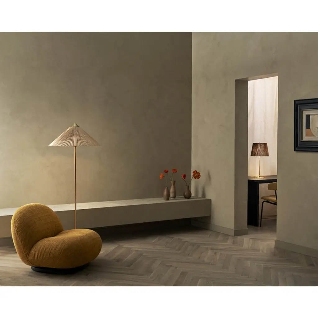 GUBI’s Tynell 9205 table lamp beautifully reflects the style of lighting designer Paavo Tynell, showcasing his love for natural materials and impeccable craftsmanship, all while maintaining an understated charm. The 9205 table lamp harmoniously combines a hand-pleated bamboo slat shade with a slender brass stem adorned with a hand-lathed pattern reminiscent of a rattan weave. The lamp’s gently diffused, warm light and timeless proportions exude a captivating presence, making it a perfect addition to various spaces, such as the living room side table, window sill or bedside. Originally designed in the early 1950s and produced by the Finnish company Oy Taito Ab, the 9205 luminaire is now part of the Paavo Tynell collection under the Danish design brand GUBI.