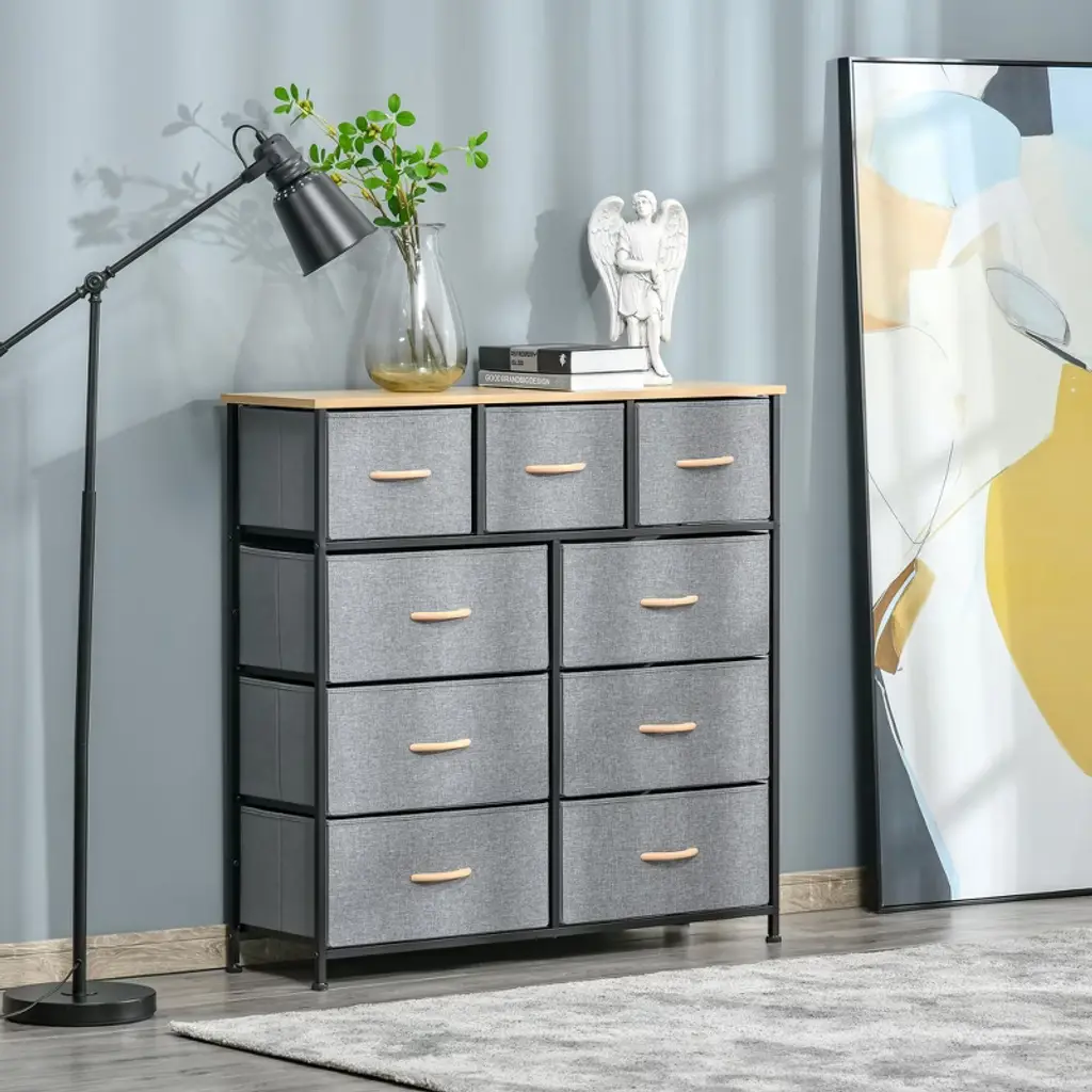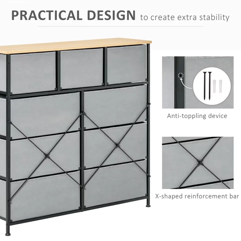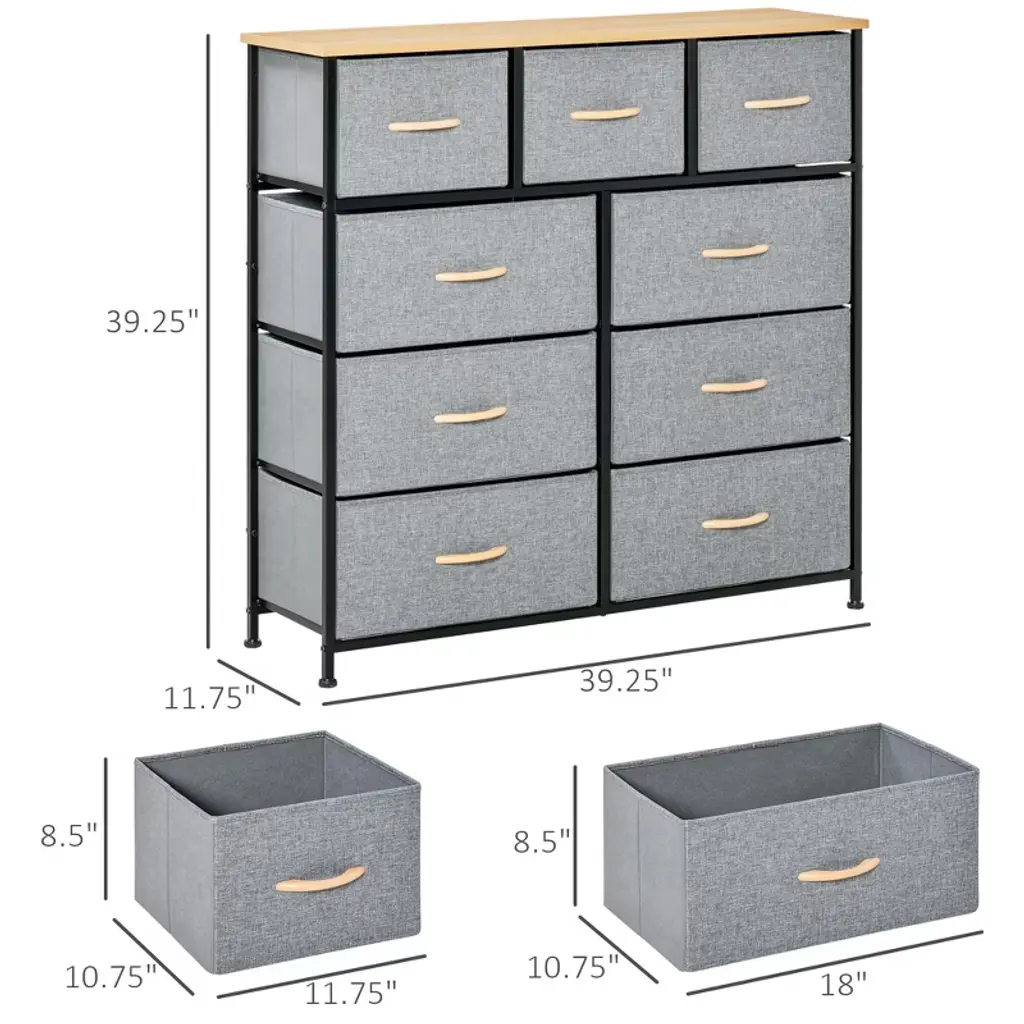 Ample Storage Space: Keep your accessories and more organized with this storage chest! Includes 9 drawers for organizing your blankets, scarves, socks, and other accessories. The wood top provides a hard surface for displaying lamps, clocks, books, glasses, and more Foldable Design: Removable drawers fold flat for easy storage when not in use. The entire unit is portable, lightweight, and easy to relocate to different spaces Safe Design: Store your accessories with this stable and safe dresser with baskets. Includes an anti-toppling device on the back to create extra stability and to provide added safety. Adjust the height on uneven floors with the anti-scratch foot pads on the bottom Quality Construction: Structured with a powerful steel frame and a quality MDF wooden top, with an innovative X-bar design on the back. Perfect for living rooms, hallways, entryways, nurseries, etc. Dresser Information: Overall Dimension: 39.25''W x 11.75''D x 39.25''HDrawer Inner Size: 11.5''W x 10.5''D x 8.25''H(small), 17.75''W x 10.5''D x 8.25''H(big)Weight Capacity: 96.8lbs(overall), 4.4lbs(small drawer), 6.6lbs(big drawer), 44lbs(top)