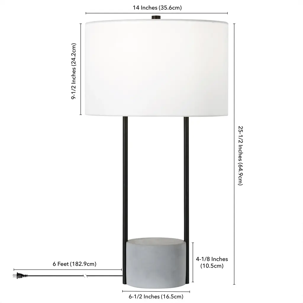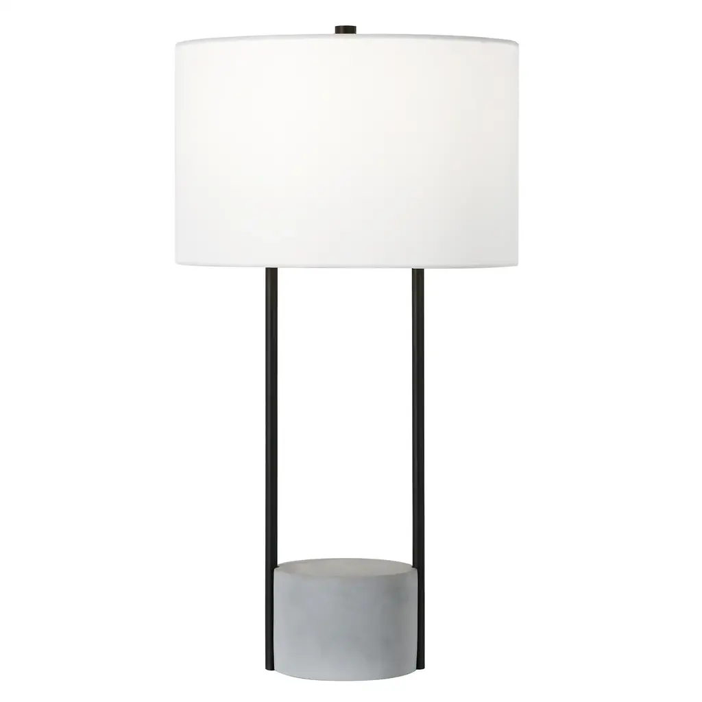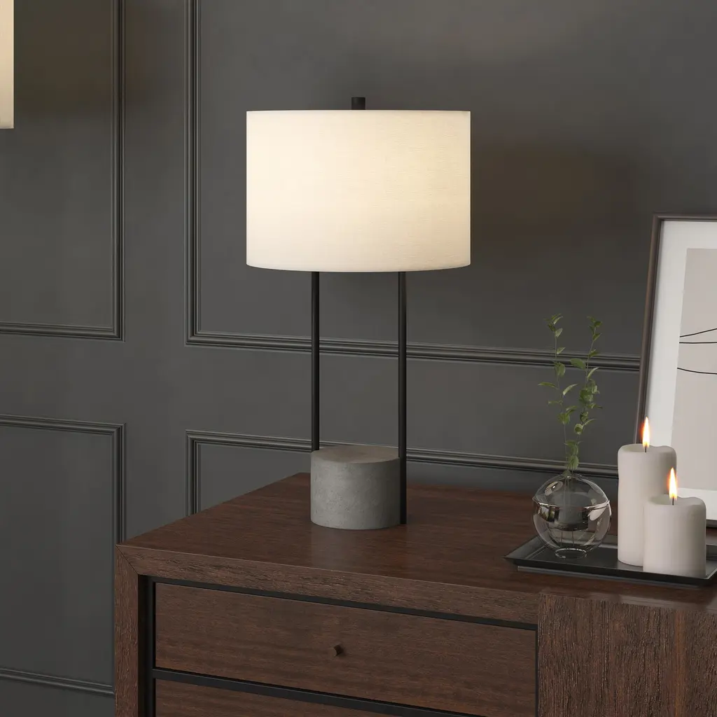 Eclectic yet minimal, modern yet rustic, this table lamp is a study in style. The striking mix of materials, framed in blackened bronze steel and concrete, creates a clean streamlined silhouette in any room. The lamp's shape is industrial-inspired, but the crisp drum shade and sleek lines keep the finished look thoroughly contemporary in any room of your home. Features: