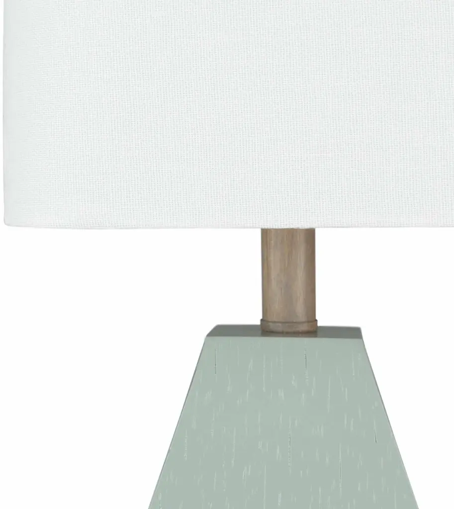 Collection: Umaganhan Colors: Aqua, Translucent Material: Shade (Outside): Linen,Body: Resin Styles: Contemporary Made In: China Lighting Type: Accent Table Lighting Base Color: Aqua, Natural Shade Material: Linen Shade Color: White Cord Length: 5' Switch Type: On/Off Number of Bulbs: 1 Socket Type: E-26 Bulb Wattage: 60W
