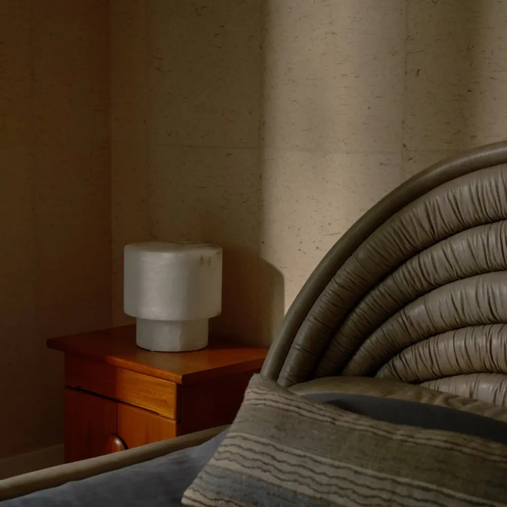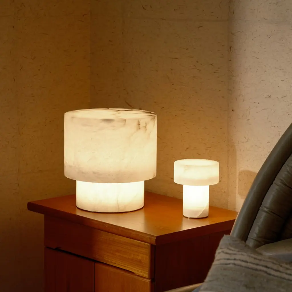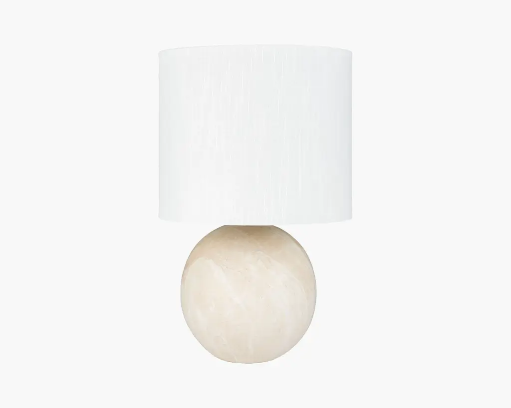 A laud to the beauty of natural stone, the Una Small Table Lamp features a pillar of natural alabaster that rises in stacked sections to form a uniform base and shade. Its illumination gives the translucent stone a warm glow, creative a distinctive voice full of modern sophistication and soul.