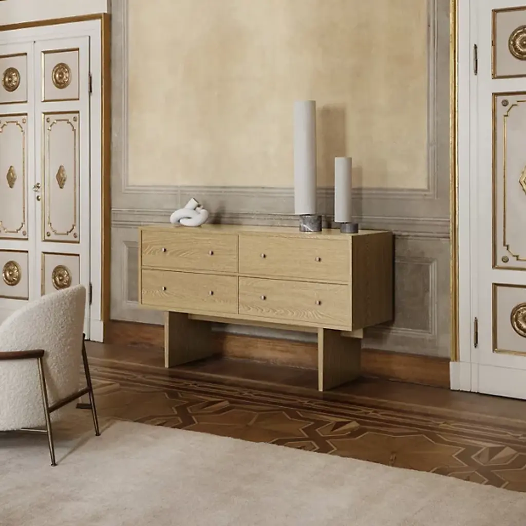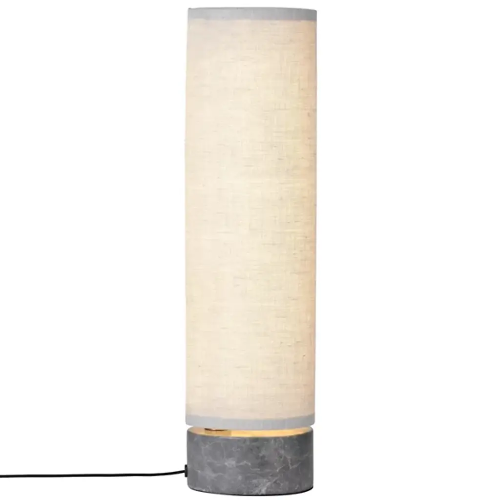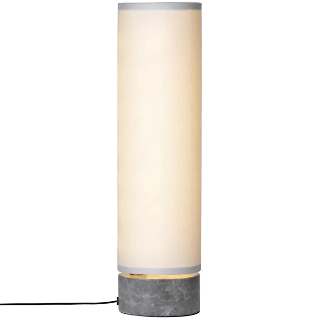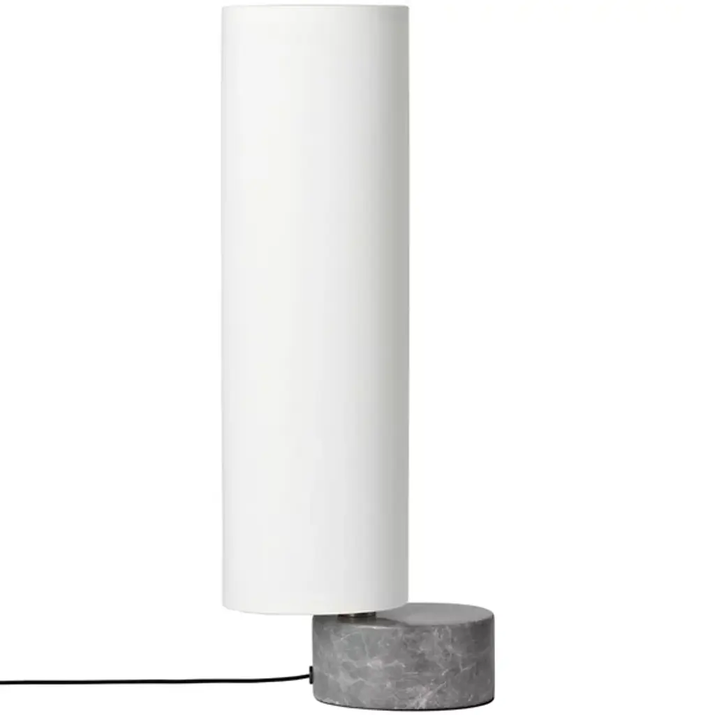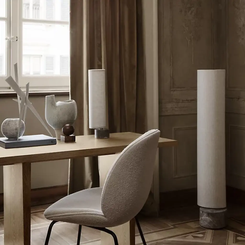 Complement the minimalist lines of the room's decor while adding a surge of intrigue with the symmetrical or offset silhouette of the Unbound LED Table Lamp from Gubi. Creator Space Copenhagen brings a Poetic Modernism design approach focused on forging new ideas by balancing opposites. Using Japanese lanterns as inspiration, Space Copenhagen balances opposites with a classic marble base and a modern textile shade. A 360-degree rotating mechanism between the shapes lets one move the light source toward or away, leaving behind a sculptural, asymmetric silhouette. The tall shade surrounds the bright lamping to provide a glare-free ambiance that enhances the rich materials in play.