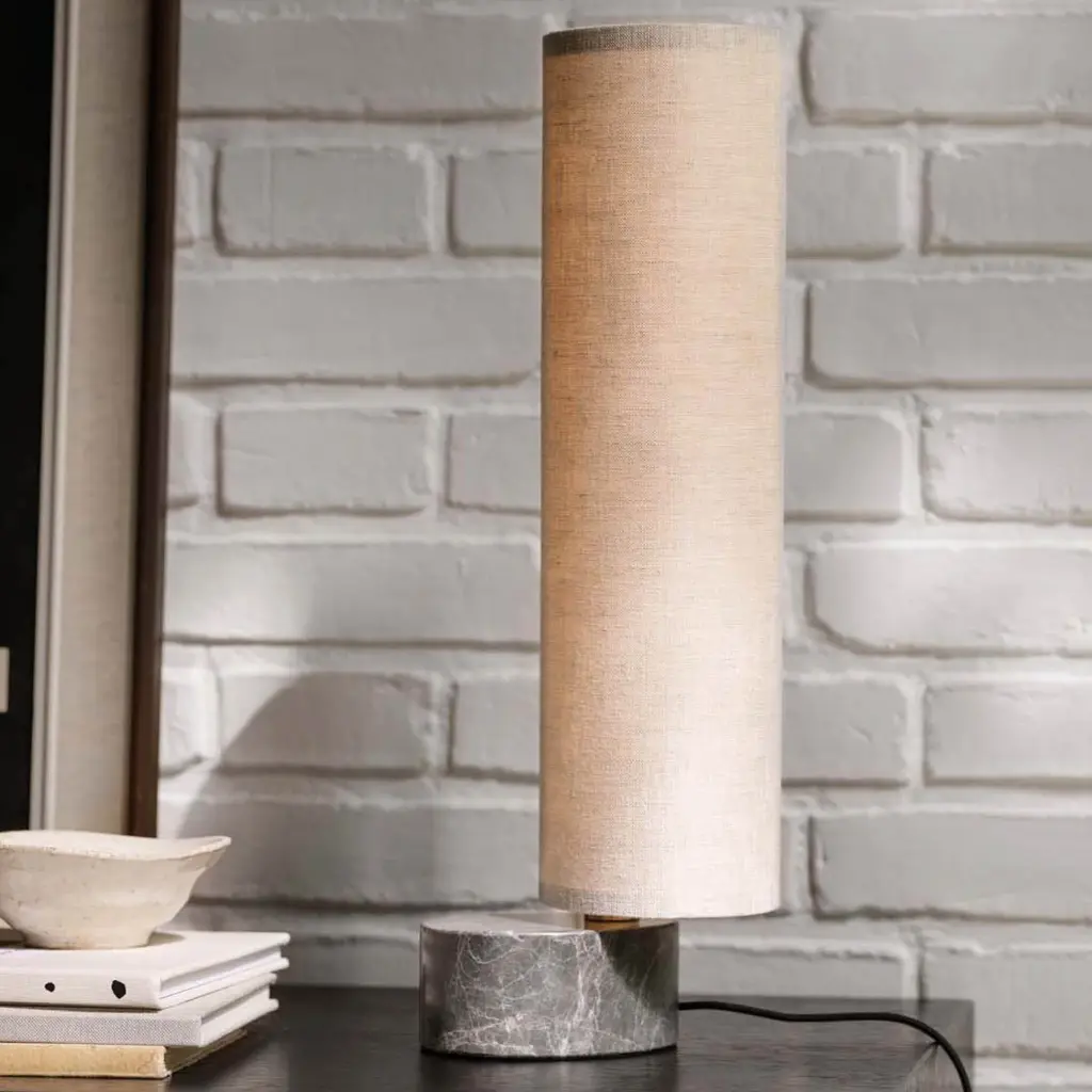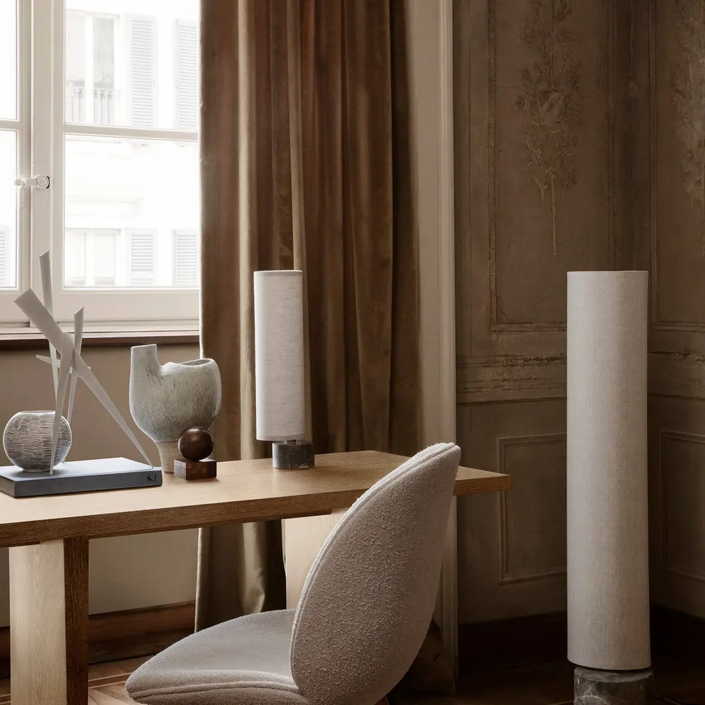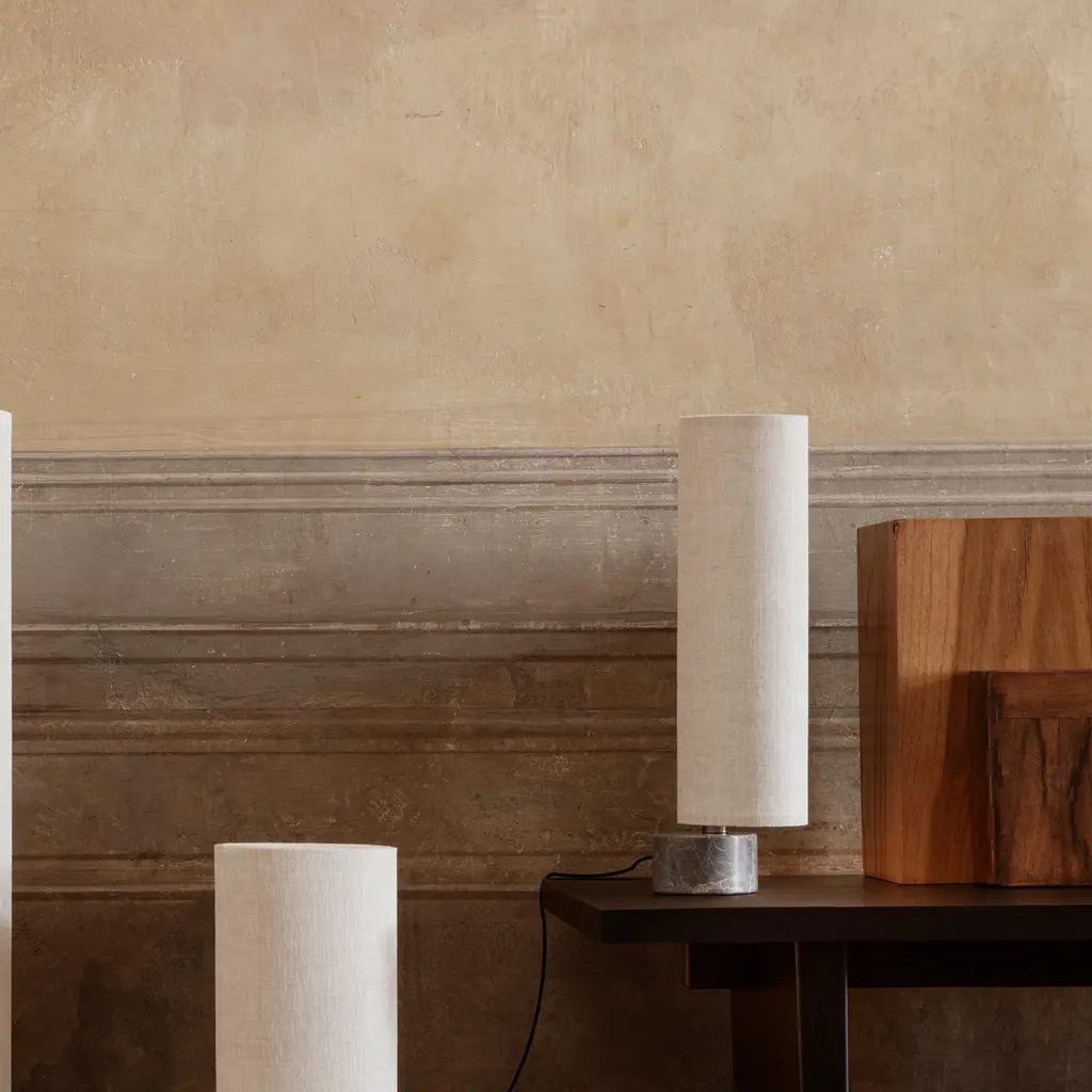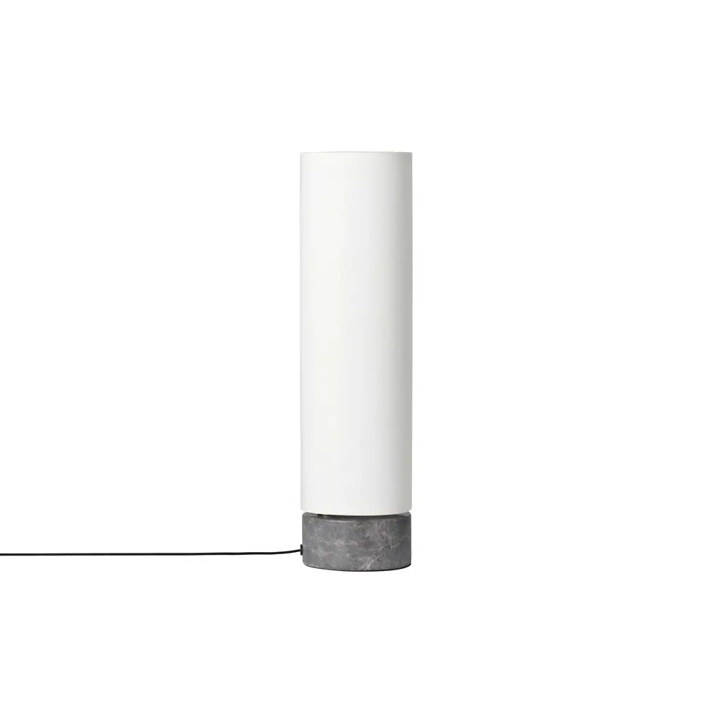 The smallest Unbound brings its warm LED glow to spaces as small as a console or bedside table but brings the same mesmerizing rotation as its taller siblings. Space Copenhagen pairs a luxe marble base with a vertical fabric shade, both in the same teardrop shape and then sets the lighted column in circular motion via a carefully engineered ball joint. Aligning completely only once every 360-degree turn, Unbound is as much a sculptural element in a room as a functional source of light.