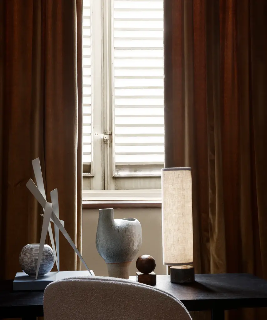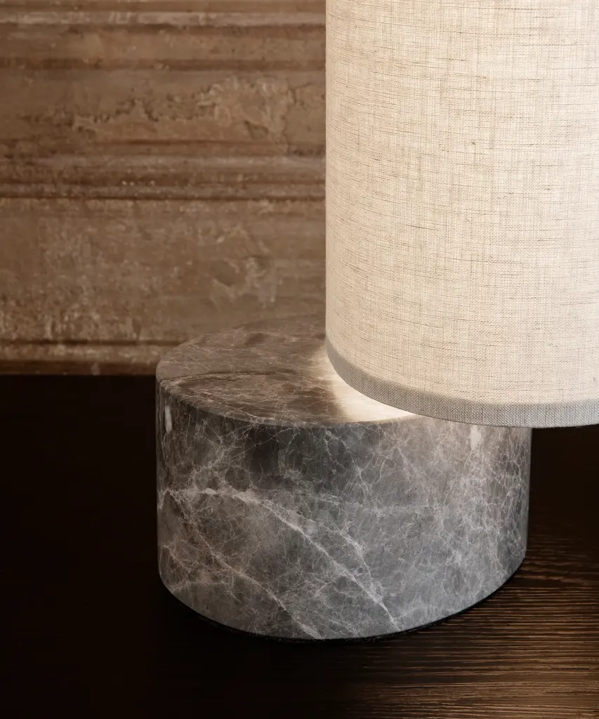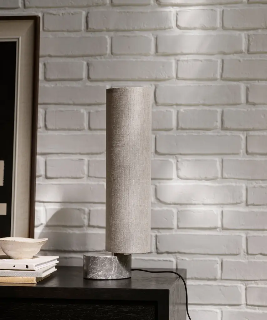 With the teardrop-shaped marble base acting as an anchor, the white linen or natural canvas shade can be effortlessly rotated around it, as though it were a sail, gently billowing. Its dark antique brass ‘mast’ supports an array of dimmable LED lights within the shade that create a soft, diffuse and evenly distributed light. Designed by Space Copenhagen for Danish design purveyor, Gubi.