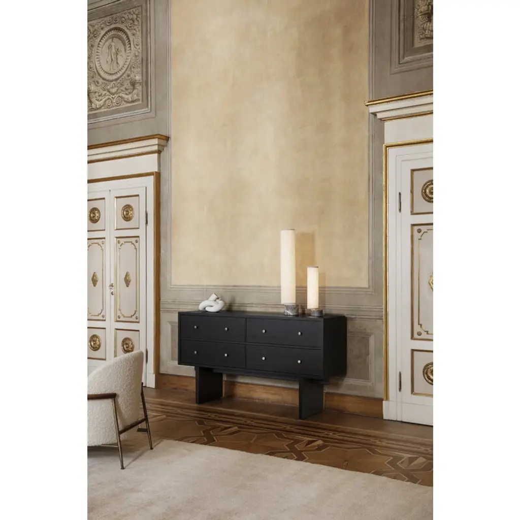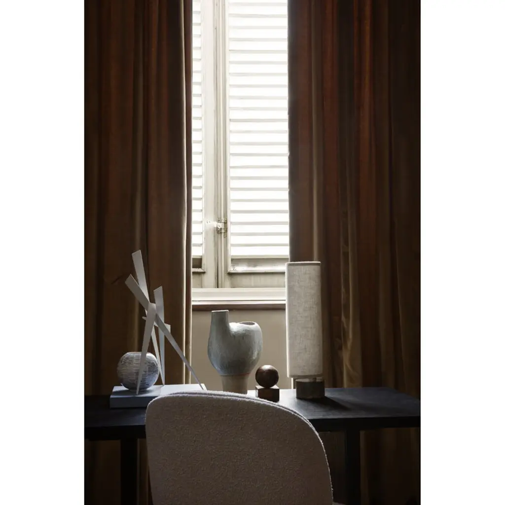 GUBI's Unbound table lamp brings a sophisticated yet cozy atmosphere to a wide range of interior styles. Designed by the studio Space Copenhagen, the Unbound lighting series is inspired by the esthetics of Japanese paper lanterns, which can be seen in the ethereal, canvas shade. A teardrop-shaped, solid marble base acts as a heavy anchor to support the lightweight, slender shade. The innovative design of Unbound allows the user to rotate the shade to different positions and angles – this helps you to find a perfect ambience and a new silhouette again and again. Playing with asymmetry, the table lamp diffuses an inviting, soft light and is a beautiful addition to the sideboard or desk, for example.