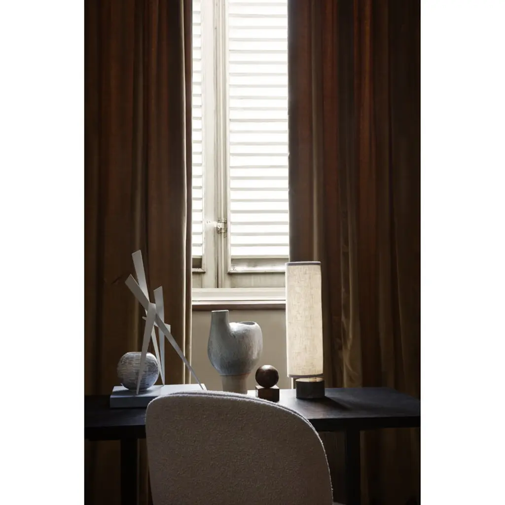GUBI's Unbound table lamp brings a sophisticated yet cozy atmosphere to a wide range of interior styles. Designed by the studio Space Copenhagen, the Unbound lighting series is inspired by the esthetics of Japanese paper lanterns, which can be seen in the ethereal, linen shade. A teardrop-shaped, solid marble base acts as a heavy anchor to support the lightweight, slender shade. The innovative design of Unbound allows the user to rotate the shade to different positions and angles – this helps you to find a perfect ambience and a new silhouette again and again. Playing with asymmetry, the table lamp diffuses an inviting, soft light and is a beautiful addition to the sideboard or desk, for example.