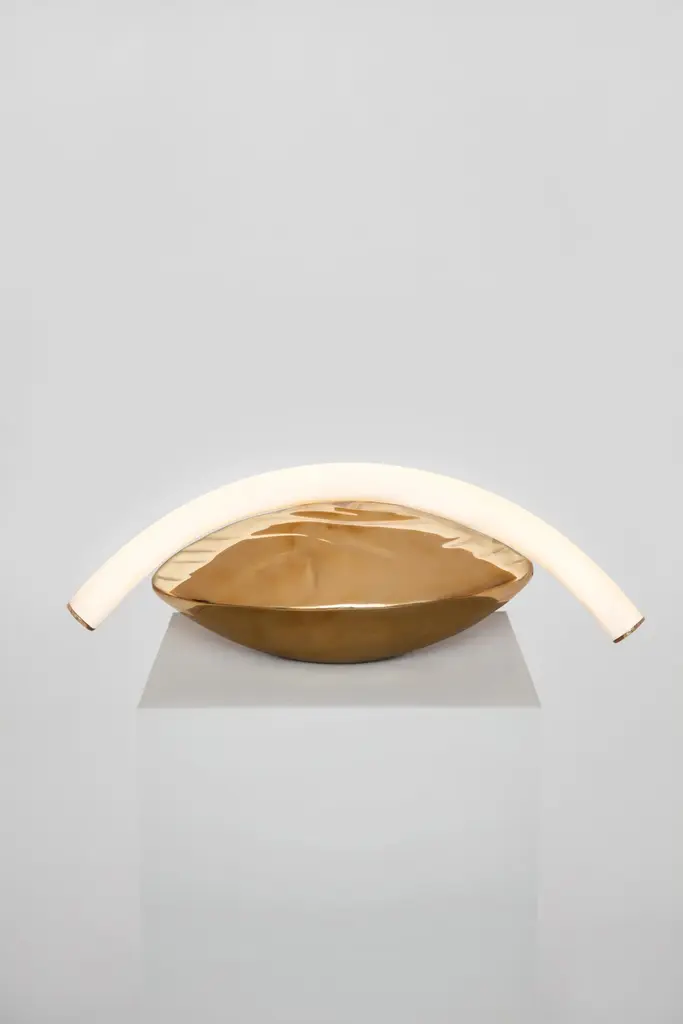 Underlay I - Sculpted table lamp by Paul MatterUnderlay IPolished cast brass with Murano glassDimensions: H 7", D 14" . Started with the idea of drafting a pattern on paper for a garment with freeflowing 3-D folds and arresting these fabric folds in metal, Kallol Datta, created a series of light objects that fuse sculptural form with hand worn materials.All the lights are completely handcrafted in beaten and casted metal bringing Industrial uniqueness to each object. The appearance of surfaces and textures on objects and materials are manually achieved with age old technique such as patina and burning.Overlay and underlay is a collection of lights born from a collaboration with clothes maker, Kallol Datta. The collaboration explores different approaches to light design, that blend the traditional and the experimental, form and function, detail and benign.The collection is composed of a Ceiling pendant, Floor Lamp and limited edition light sculptures.Paul MatterPaul Matter is a contemporary light design studio that explores light design by blending the traditional with the experimental, form with function, and detail with the ordinary. The longevity of the designs is ensured by combining timeless visual language with materials that refine with age. The studio works closely with master craftsmen, developing handcrafted products, finished and assembled with great attention to detail, one piece at a time.Drawing from a rich palette, the materials used include aged brass, copper,stone, leather and blown glass.All our lamps can be wired according to each country. If sold to the USA it will be wired for the USA for instance.