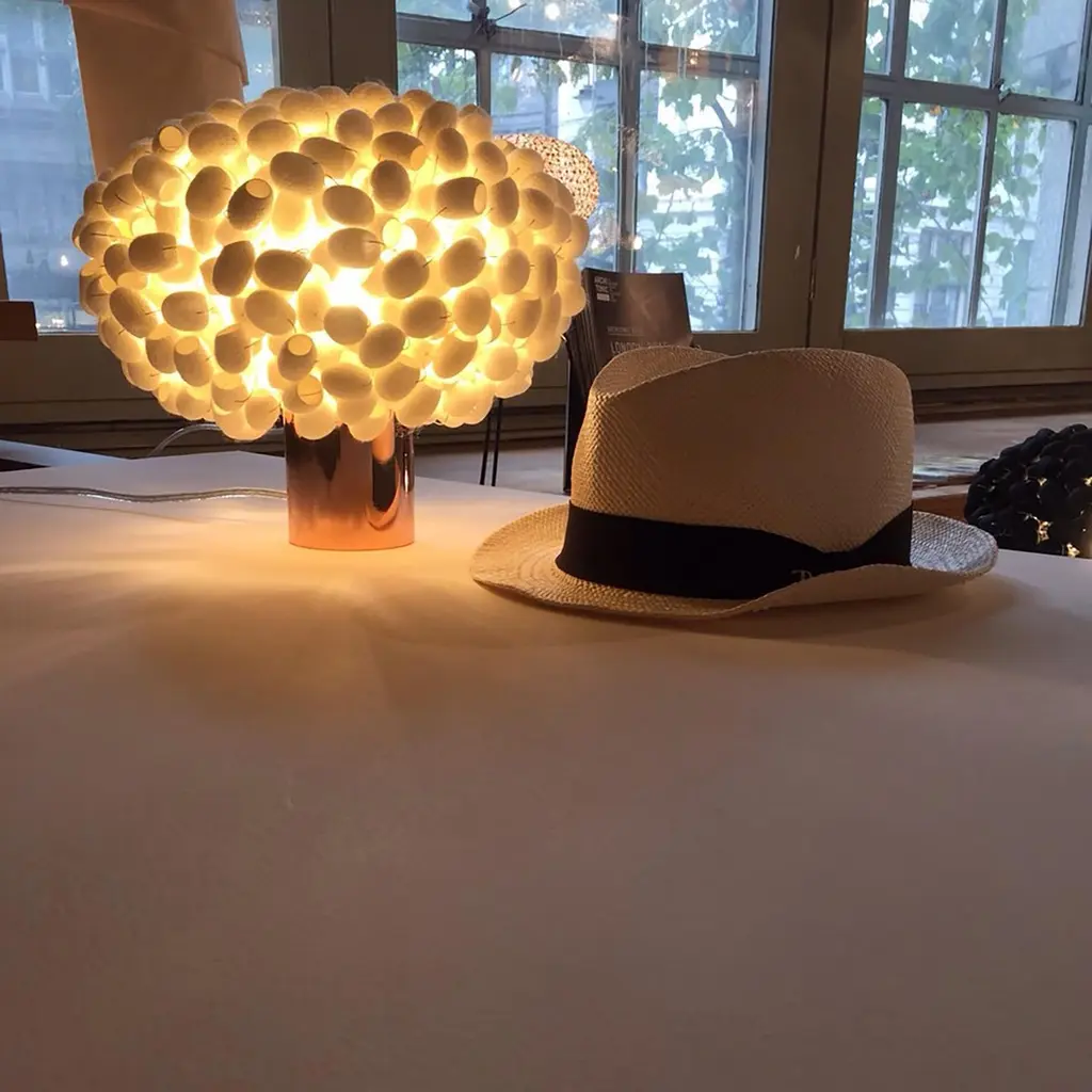 Unit (table-C) table lamp with copper finish base, an atomised structure of silk cocoons is created in an ovaloid form. Assembled, on a core structure of hand soldered wire, the silk cocoon material magically refracts and reflects the light from the light source especially in the case of the natural white colour material. Also offered are the same designs in ebony colour and in scarlet colour.Unit (table-C) is also available in the Unit pendant light series Unit (pendant-C)Credit Image : Show in DesignJunction, LondonUnit (table-C) table lampSize W (12 in) 300 mm x D (12 in) 300 mm x H (9.5 in) 240 mm Material: Silk Cocoon Light Source: E27/E26 screwing fitting LED Filament 6WPlease note that due to the handmade nature of our products, slight variations in size may occur compared to the tear sheet. Additionally, colours may change over time and with usage.