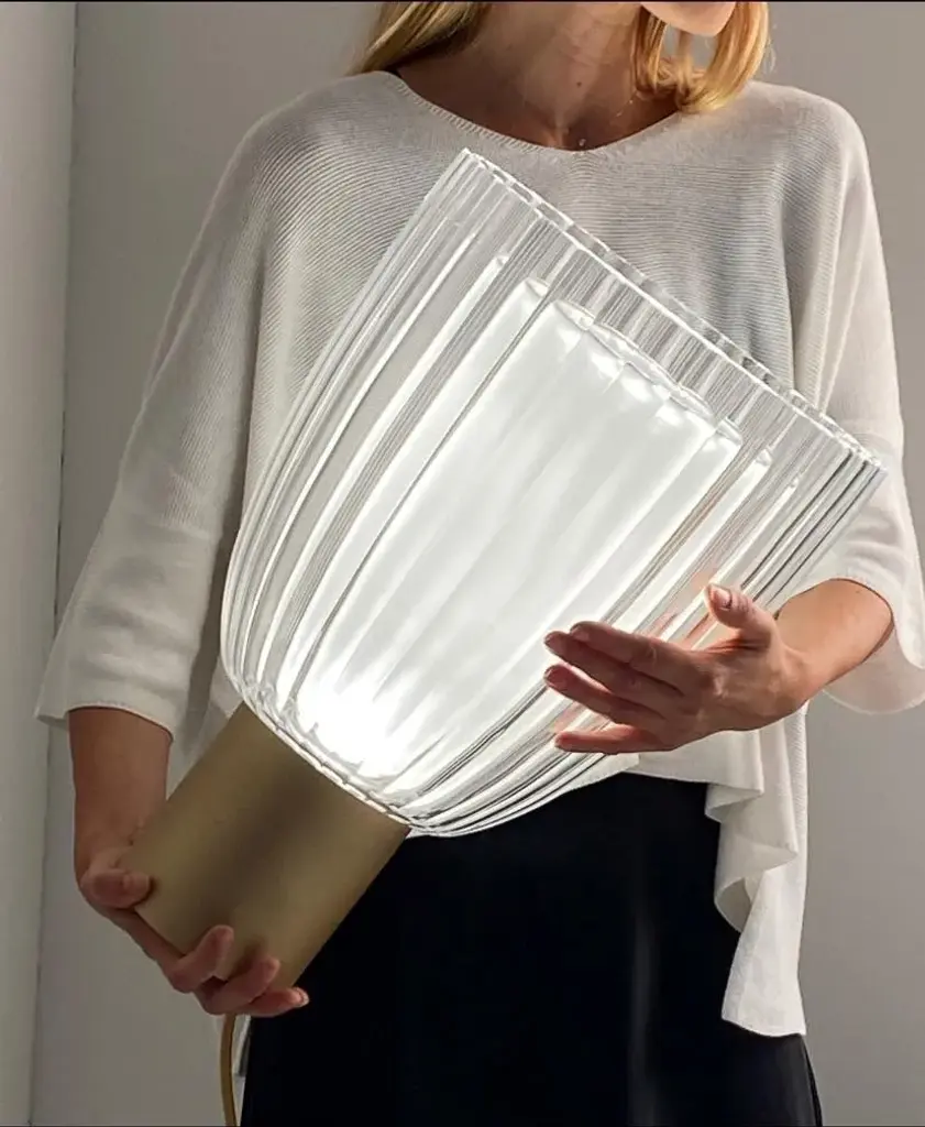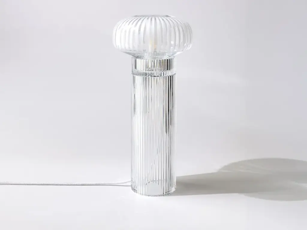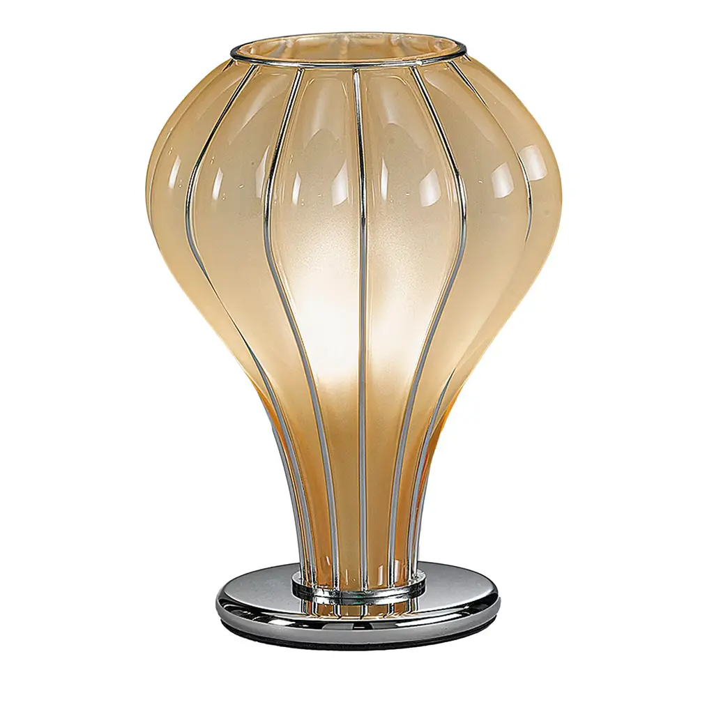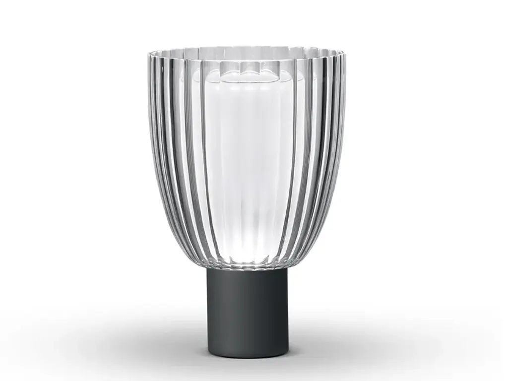 UNIVERSALE is a table lamp in carved crystal with an internal diffuser in blown and satin glass. Metal base with matt champagne, matt bronze or matt black finish.