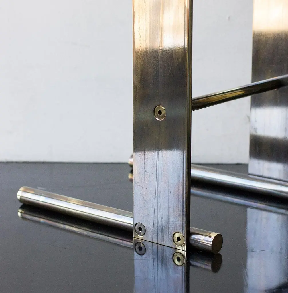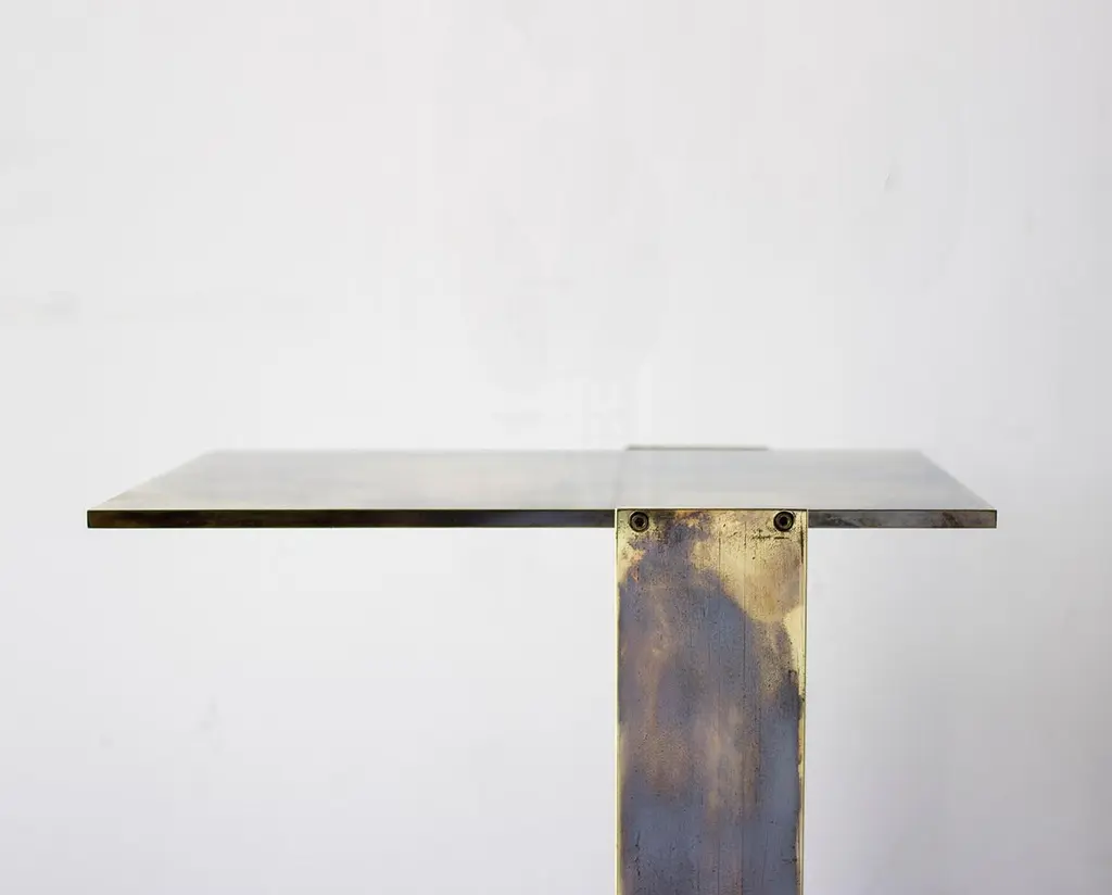 Solid machined brass in "Smoke" acid patina with recessed hex-head fasteners. All material finishes are living finishes: they will change and patina for the better with time and use. Petite sized to pull up next to a sofa or reading chair; works well as a drink tray or book Stand.Every product is individually hand assembled; slight variations in color, size and shape are to be expected. Overall size 20” H x 12” D x 8-1/2” W."Smoke" acid patinated brass components can be buffed with a soft dry cloth to rebrighten over time. Never clean lamp with any liquid products or detergents.Each piece is individually hand-made to order and slotted in frequent production batches; exact lead time is determined once order is placed.Please confirm brass finish when placing order; price shown for "Smoke" acid patinated brass.