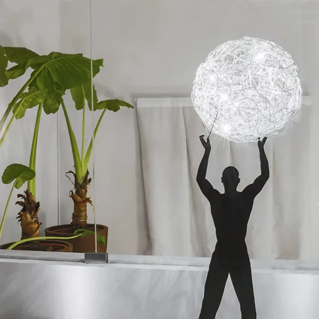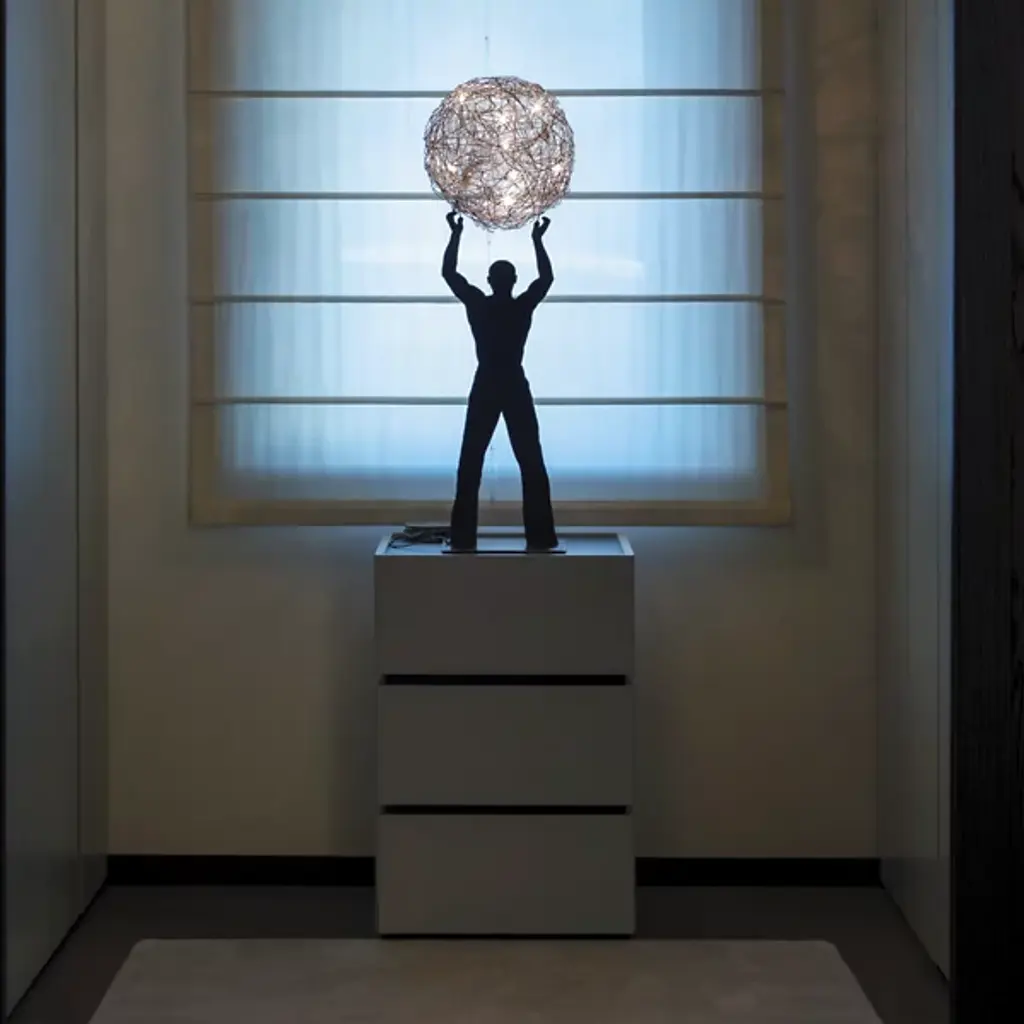 Uplifting in more ways than one. Both the handsome figure on display and the user have a rousing light at their fingertips with the Uomo della Luce Table Lamp from Catellani & Smith. Designed nearly 20 years ago, this Catellani & Smith piece speaks to the studio’s goal of giving shape to light. Here, light takes the shape of an energizing ambient globe. This cozy light fills up an airy sphere made from hand-woven aluminum wire. A trim figure holds this light proudly overhead as a 2-dimensional metal construction. The radiant sphere glazes the figure with a warm glow for a gripping silhouette.