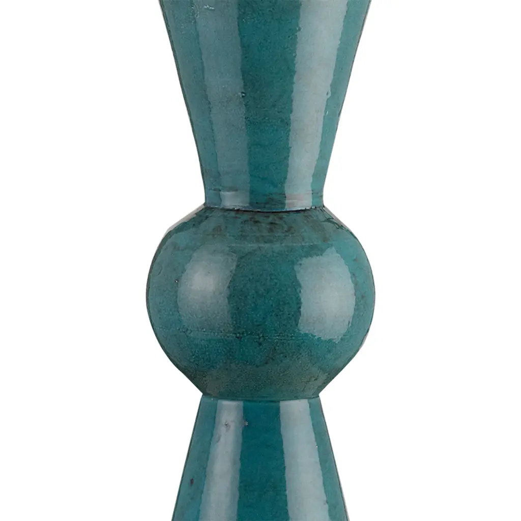 This teal version of the Upbeat Table Lamp belongs to a series of luminaries that can only be called the mod squad with their kicky colors that harken back to the era of cool. Also available in orange, white, gray and yellow, the shapely terracotta base has a center ball with expressive cones extending up toward an off-white linen shade and downward to its culmination. The shade is fastened with a wrought iron finial that matches its hardware and culminates the profile of the 31-inch tall lamp.